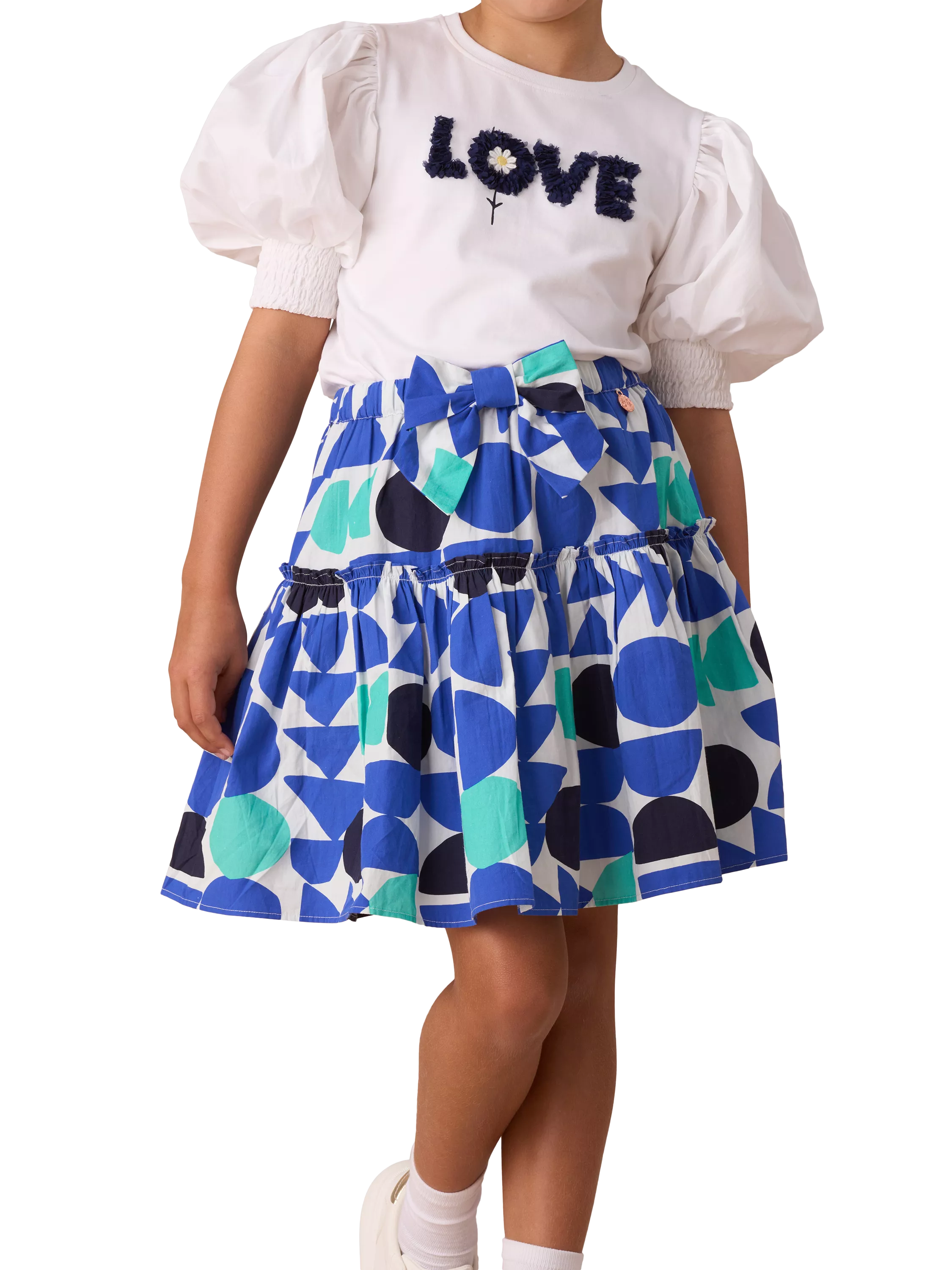There's not mesh you won't love about this skirt! A tiered skirt in crisp cotton layered with delicate soft mesh to add volume, all finished off in a bold blue print. Simply divine.