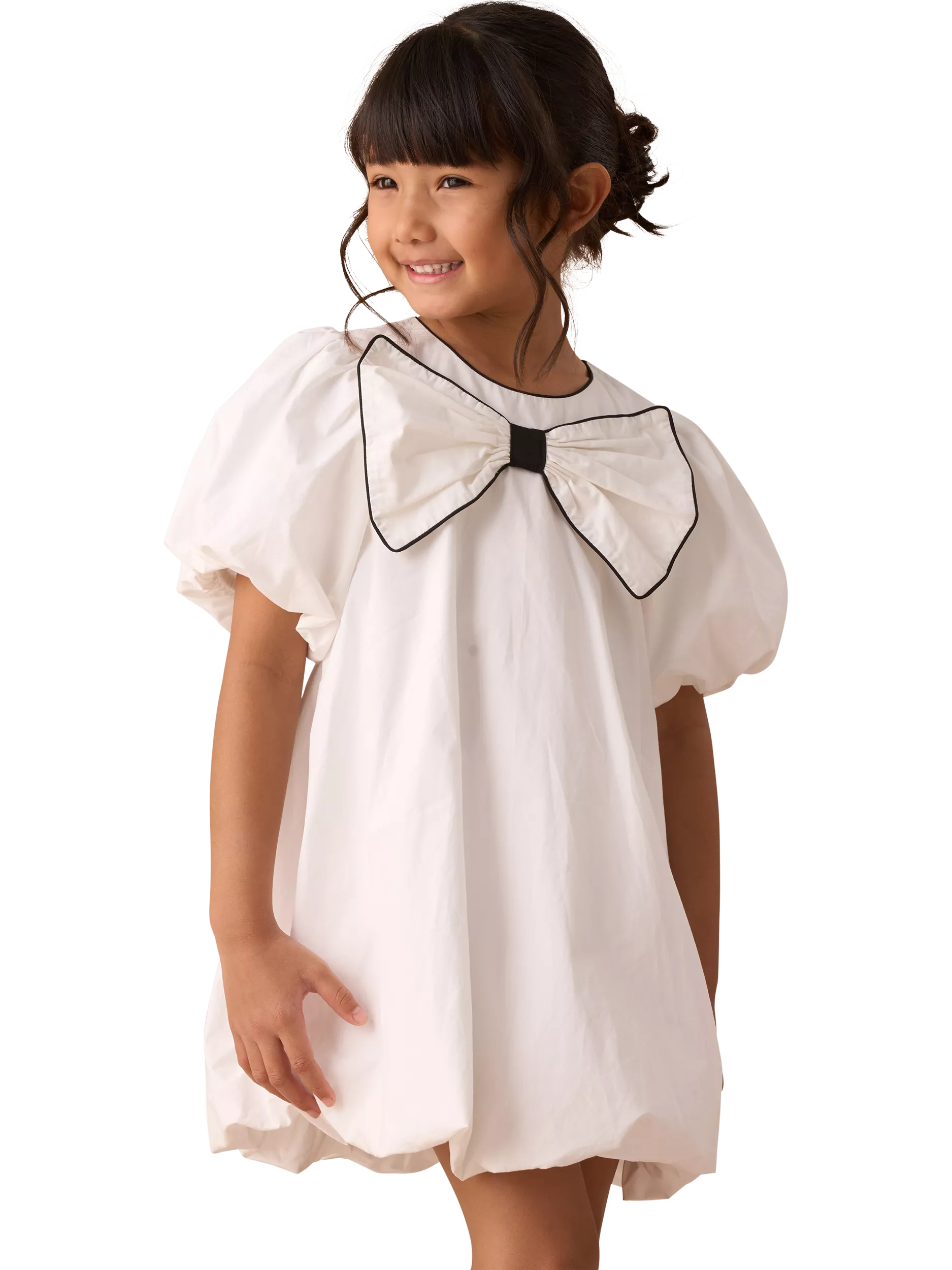 The perfect combination of playful and chic, this bubble hem dress is made from a crisp, classic white cotton cut into a voluminous silhouette with a puffball hem and sleeve, and an oversized bow to add playful charm to any occasion.
