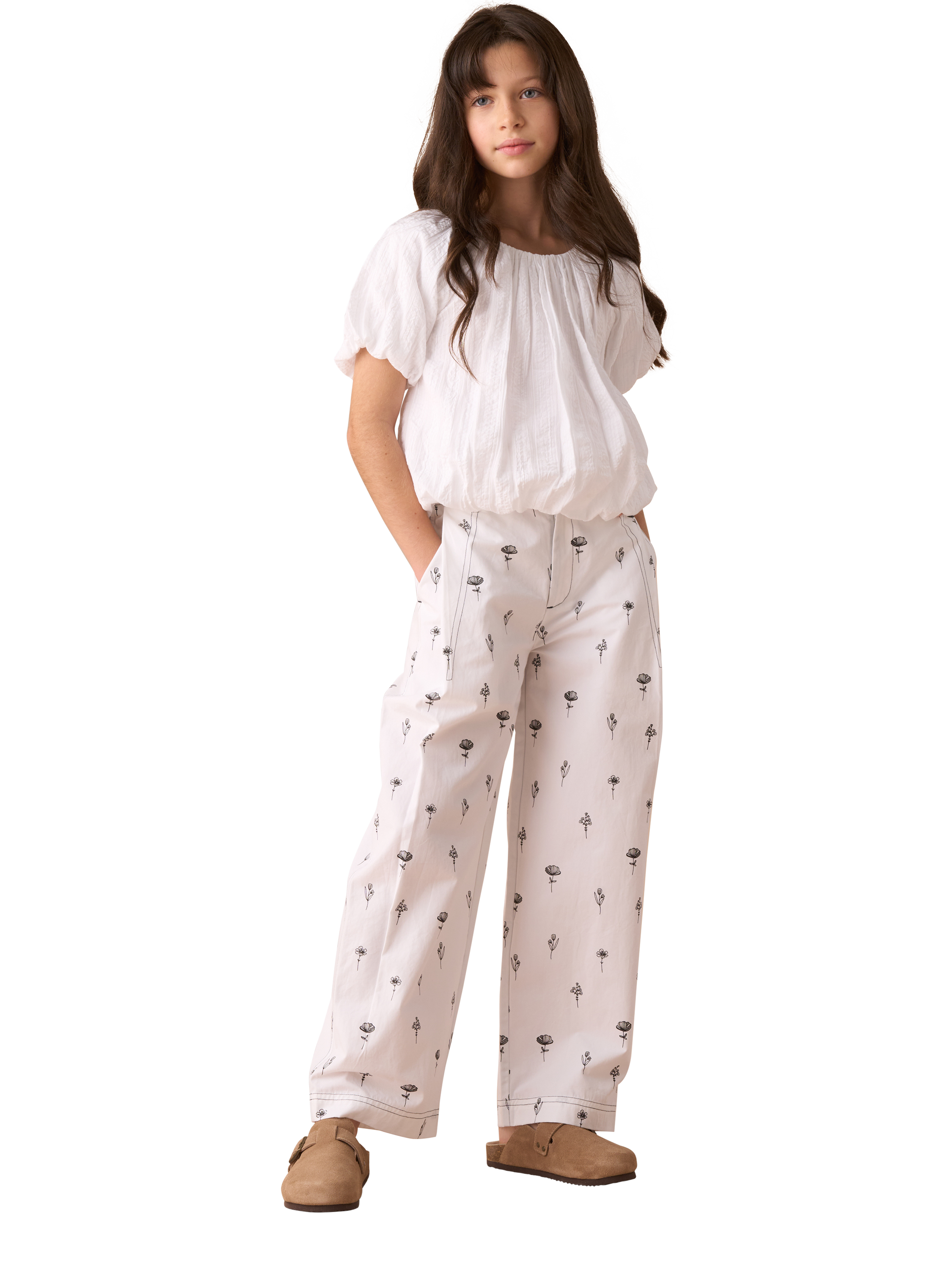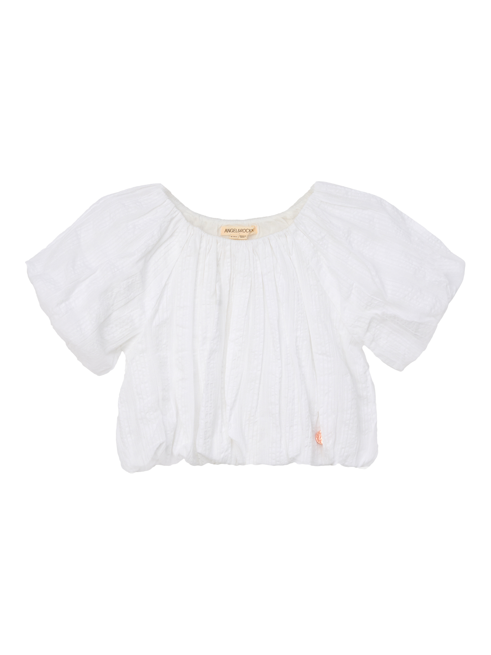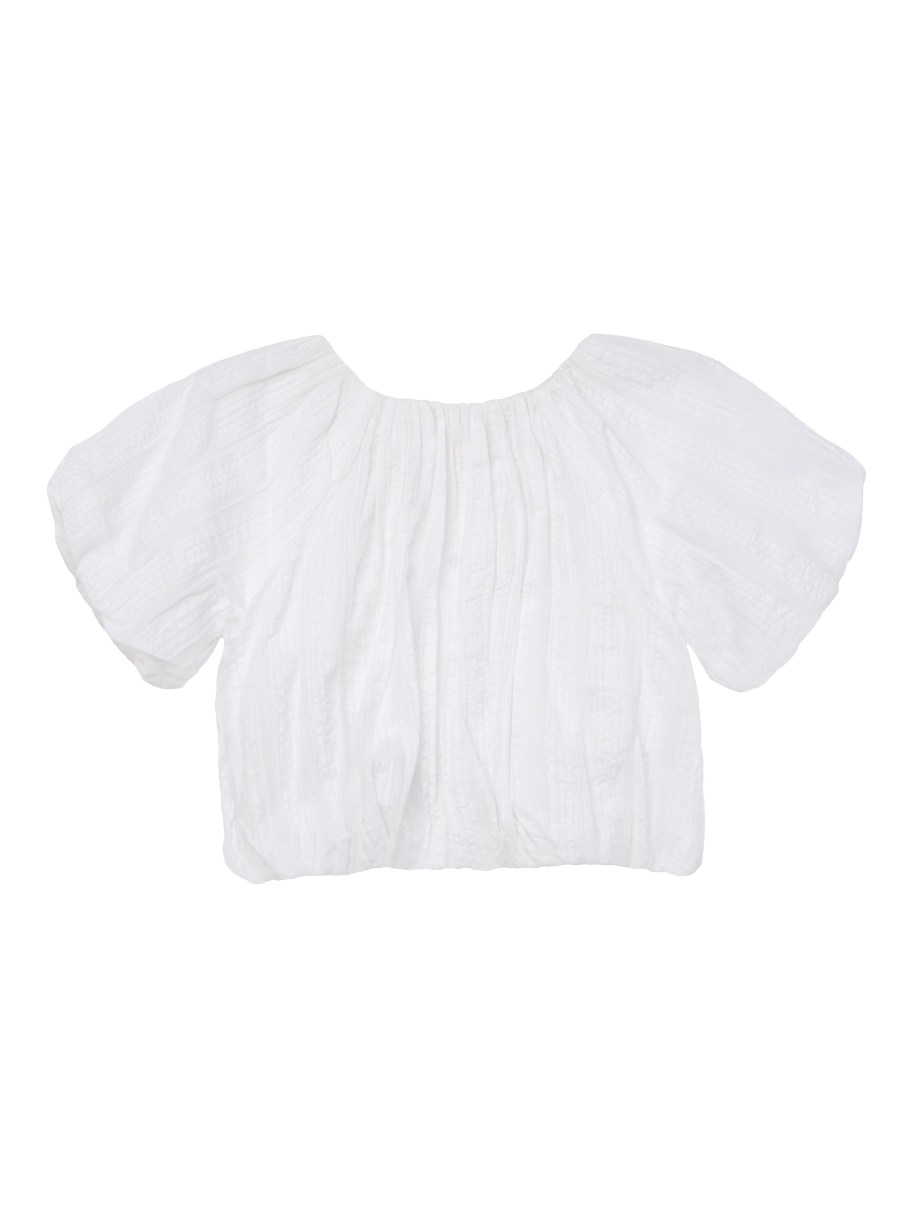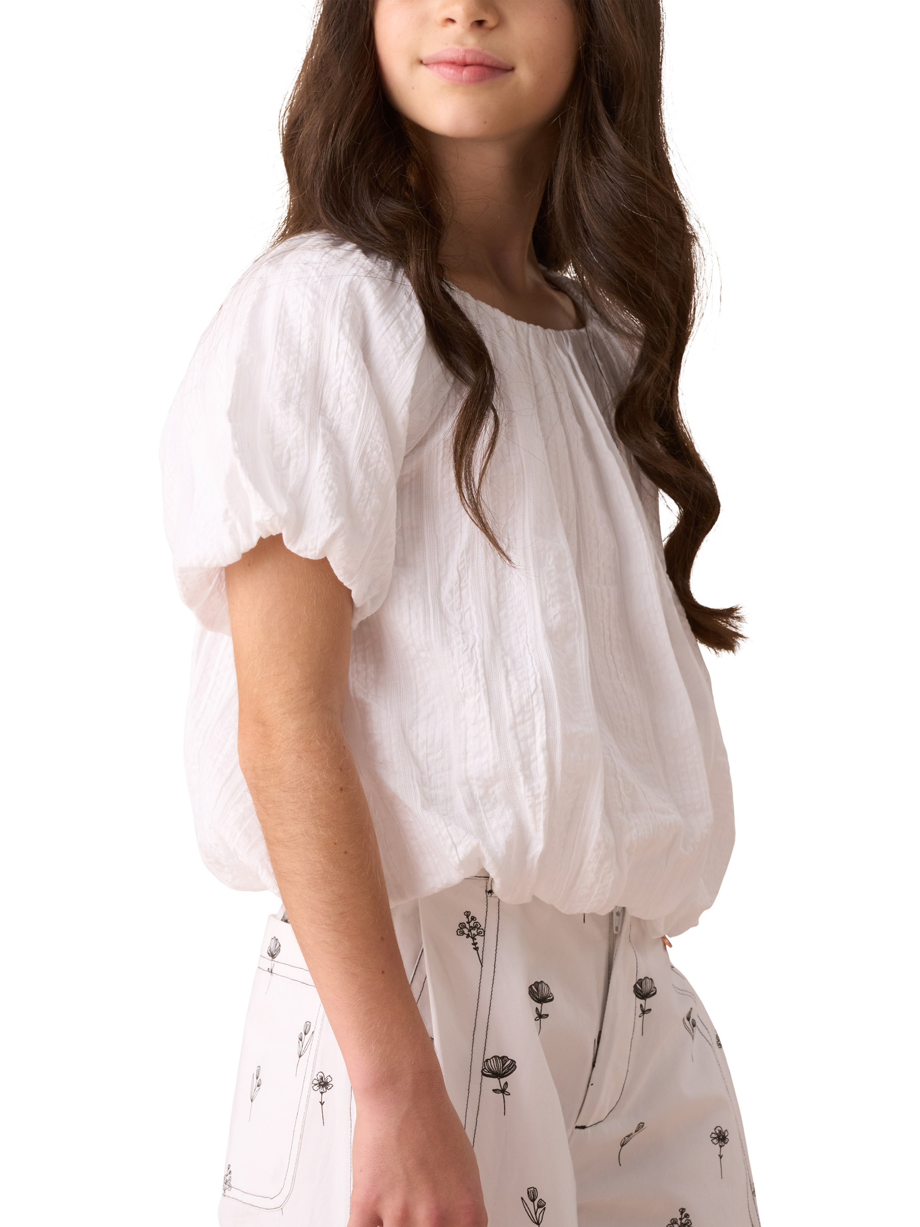 Meet your new favourite top! Crafted from textured white cotton featuring billowy blouson sleeves and bubble hem. Pairs with anything and everything.