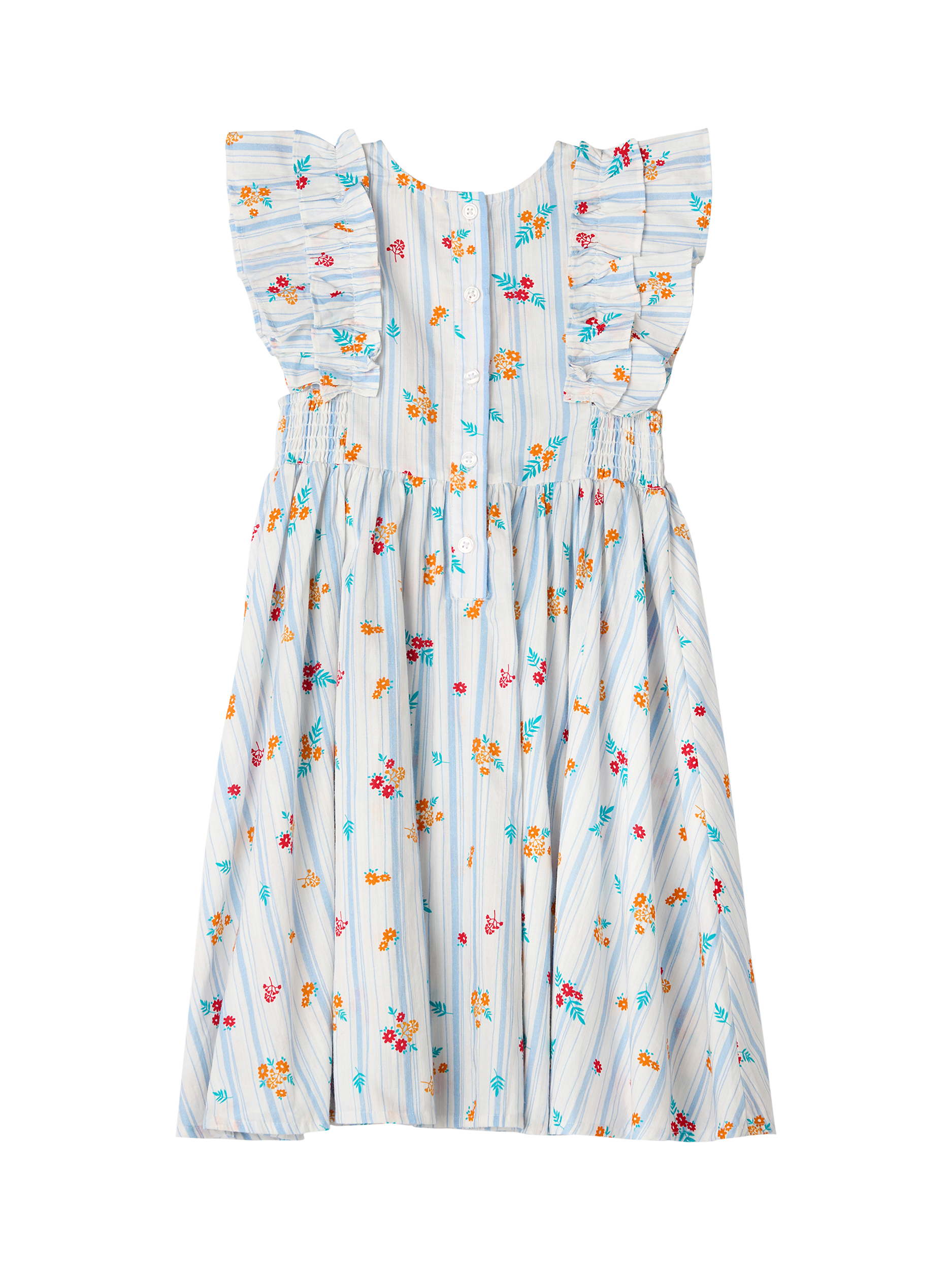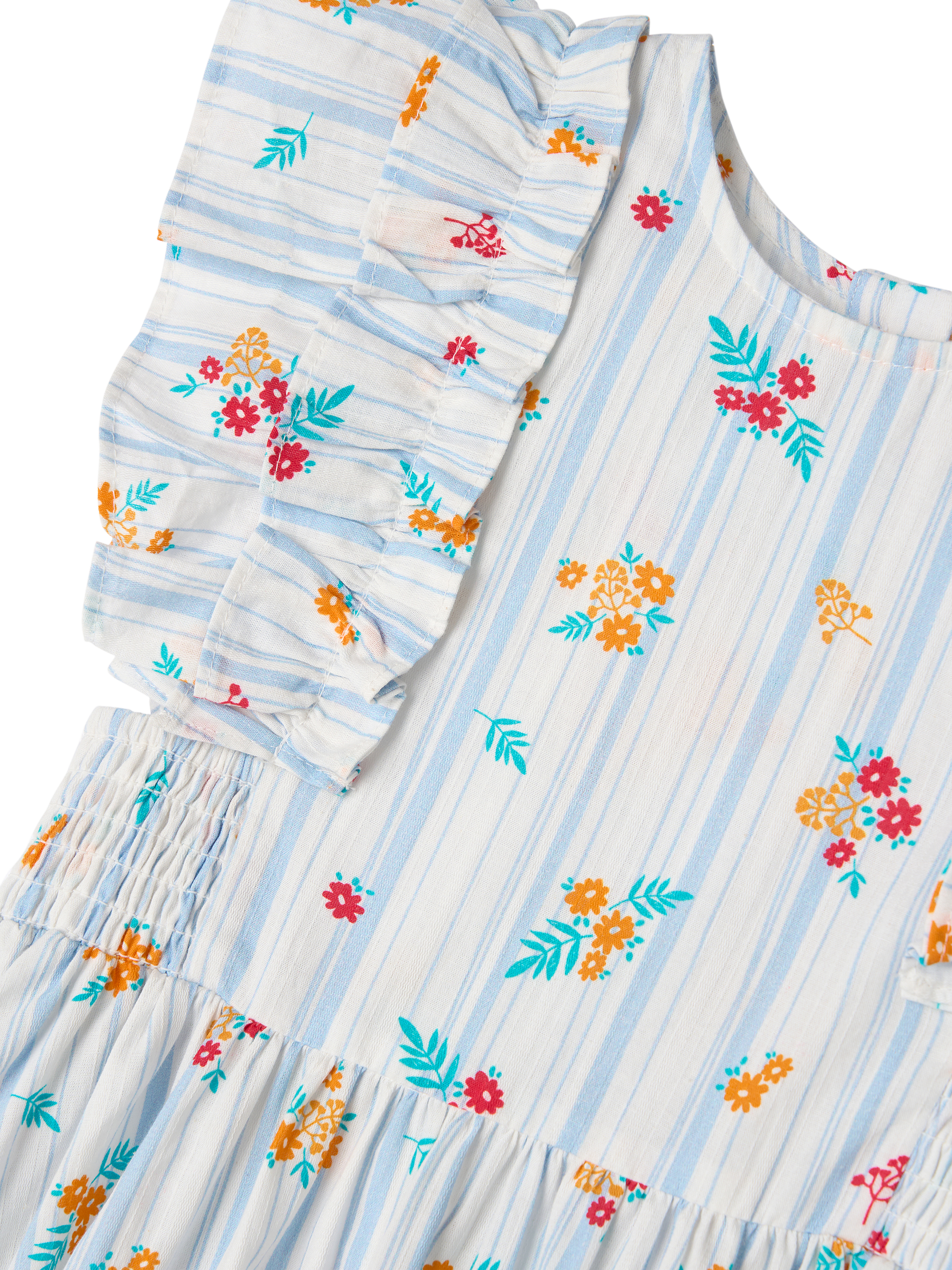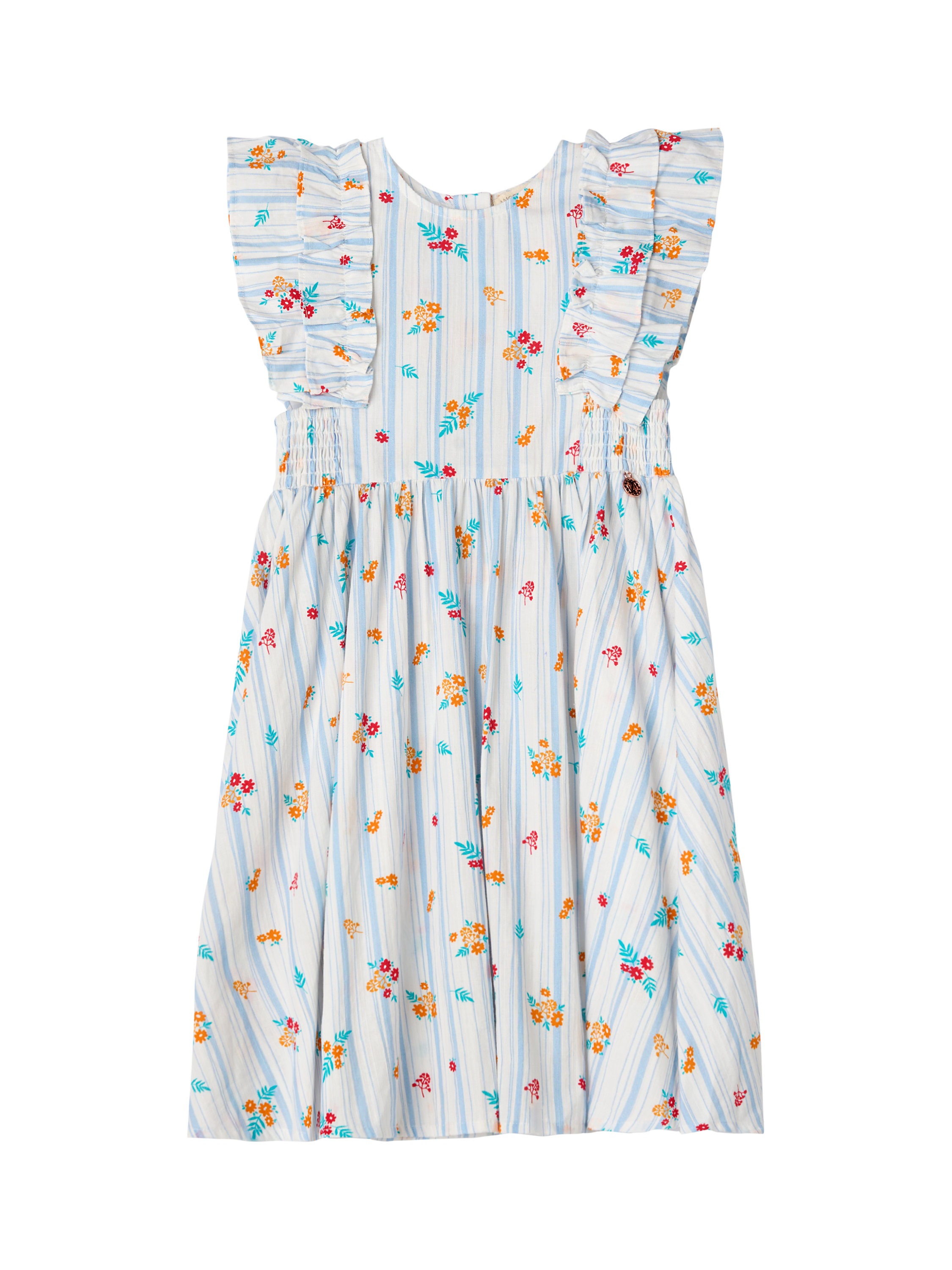 We're dotty about this dress! Featuring playful ruffle sleeves, shirred panels for added stretch, and a contemporary floral and stripe design, this is the perfect piece to dress up or down this season.