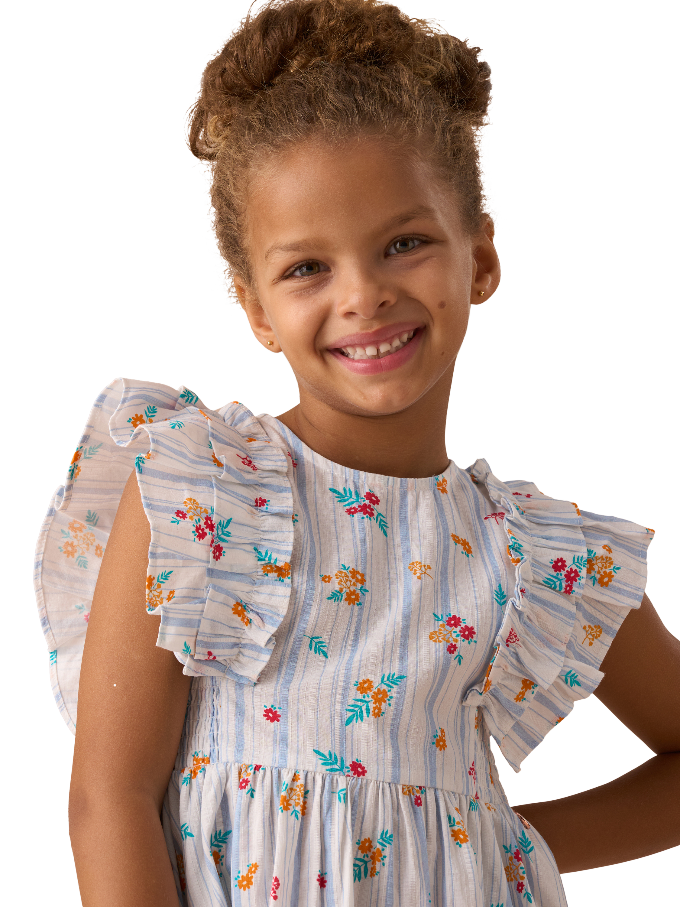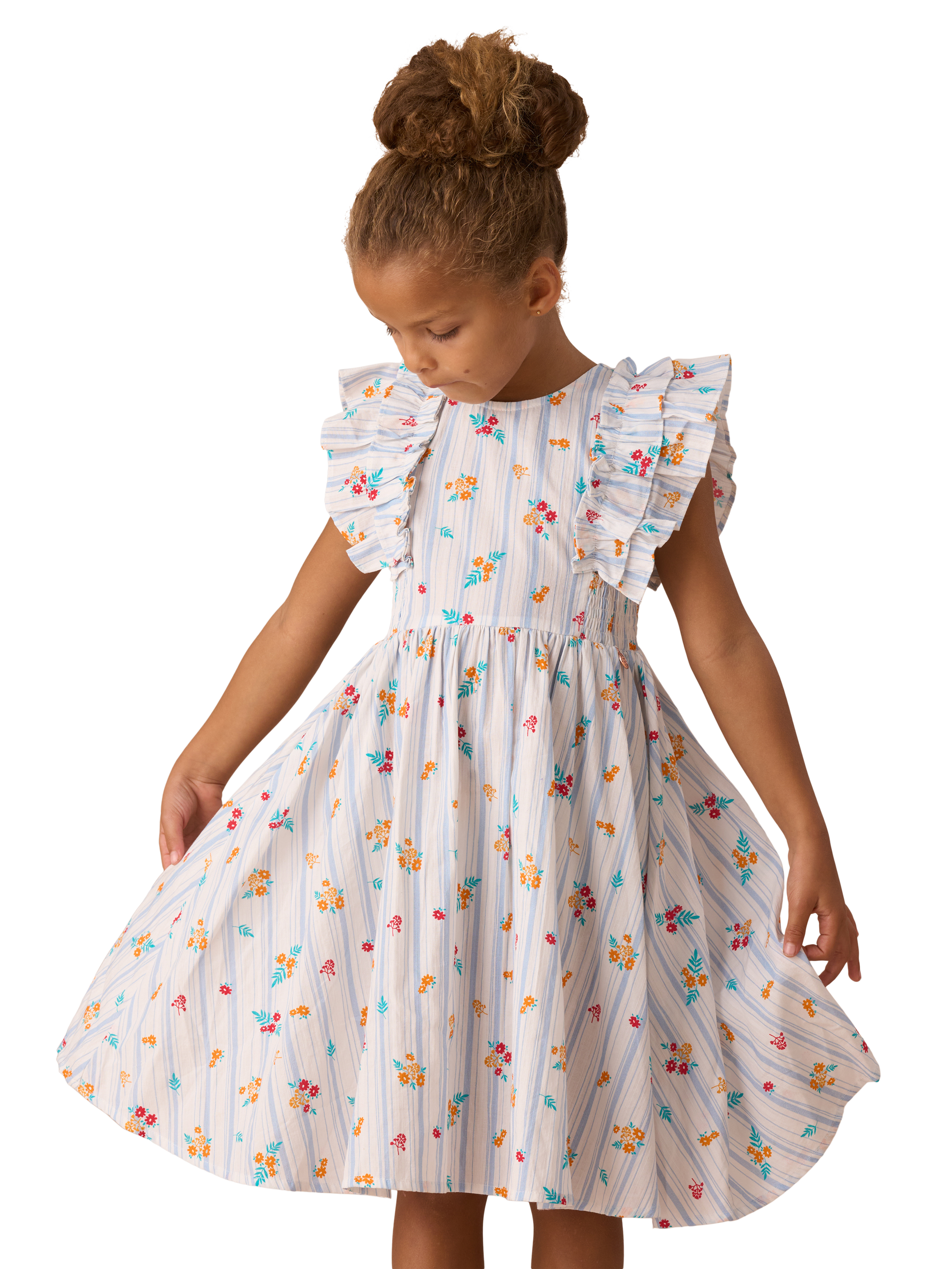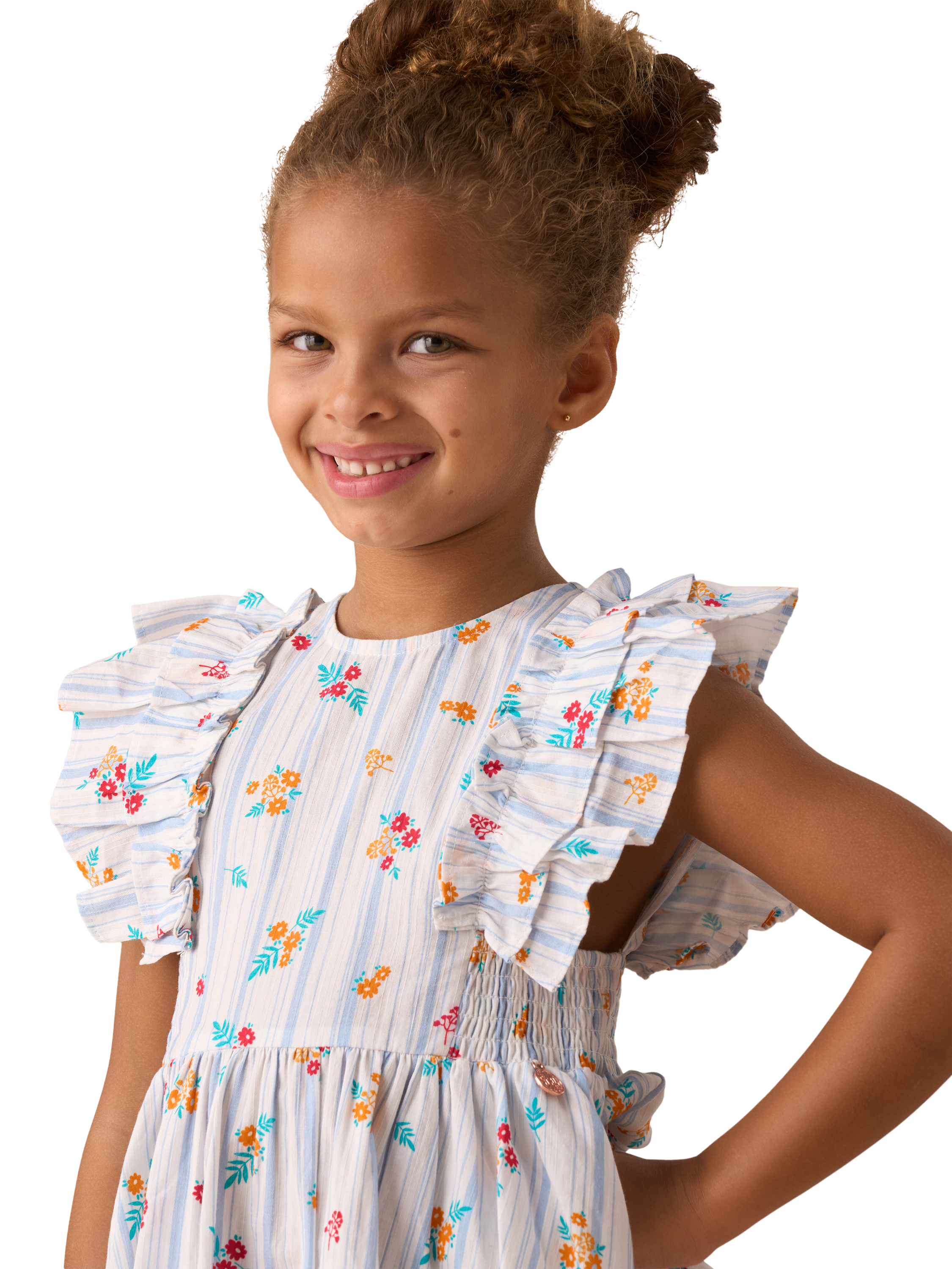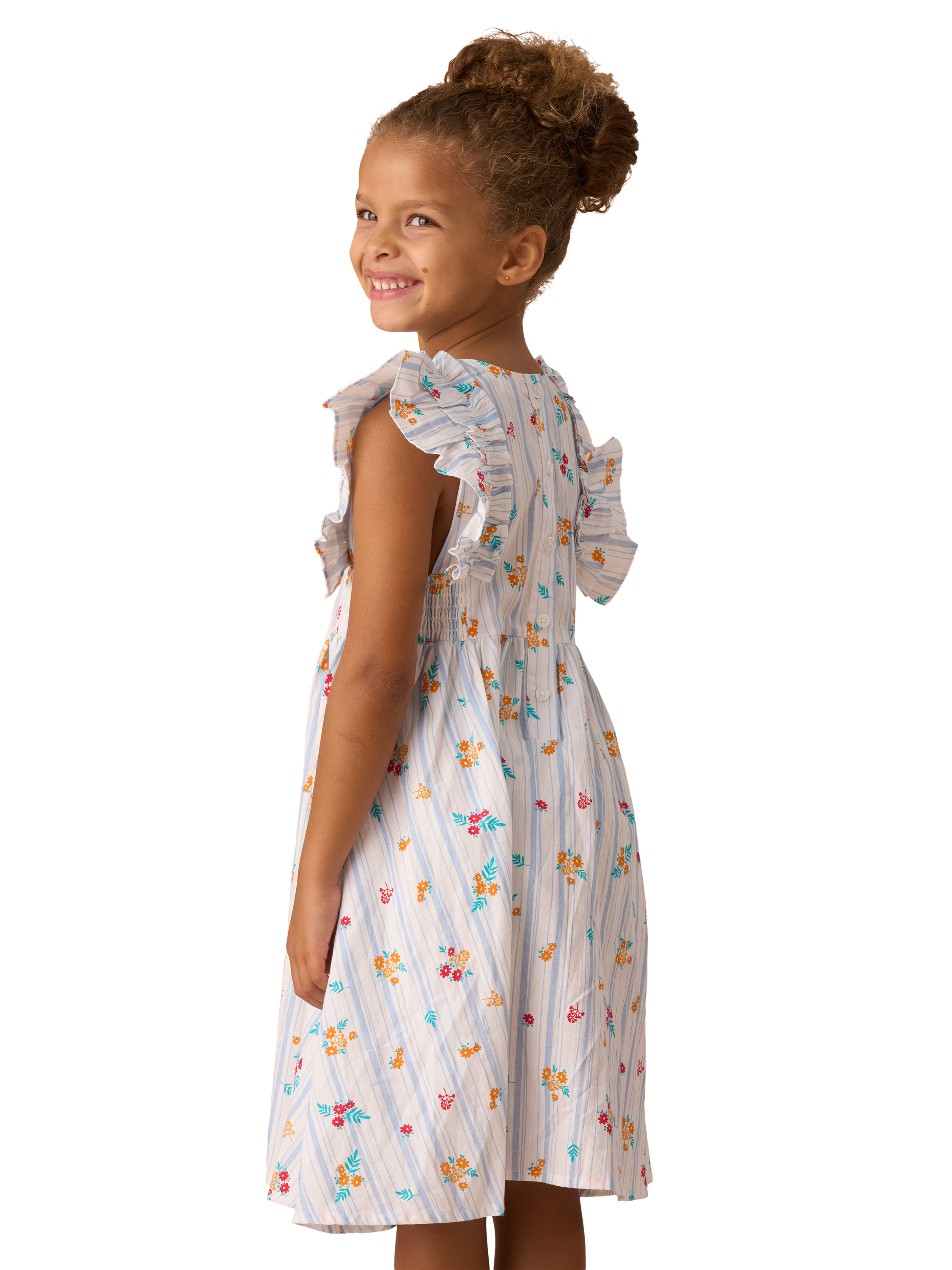 We're dotty about this dress! Featuring playful ruffle sleeves, shirred panels for added stretch, and a contemporary floral and stripe design, this is the perfect piece to dress up or down this season.