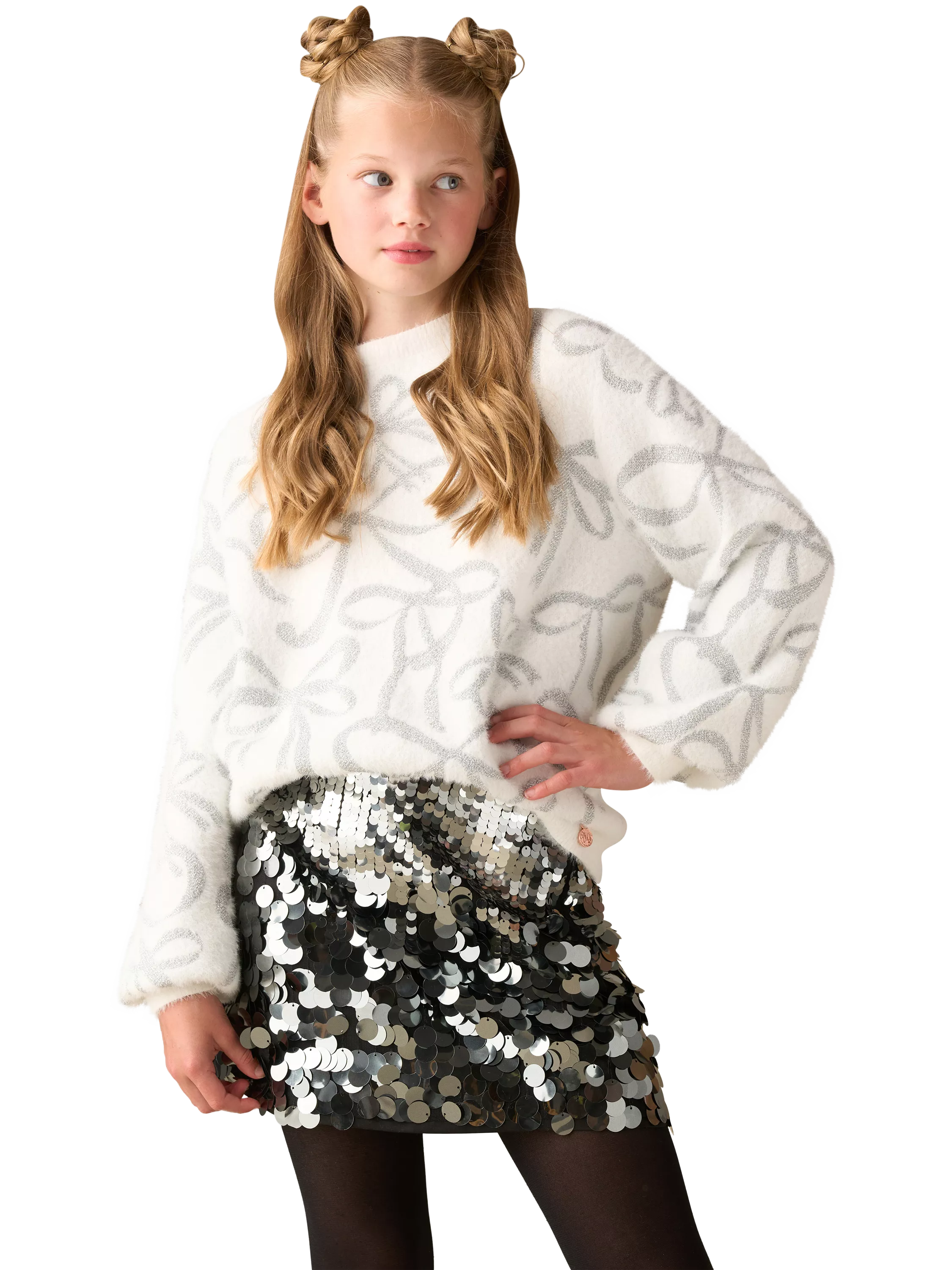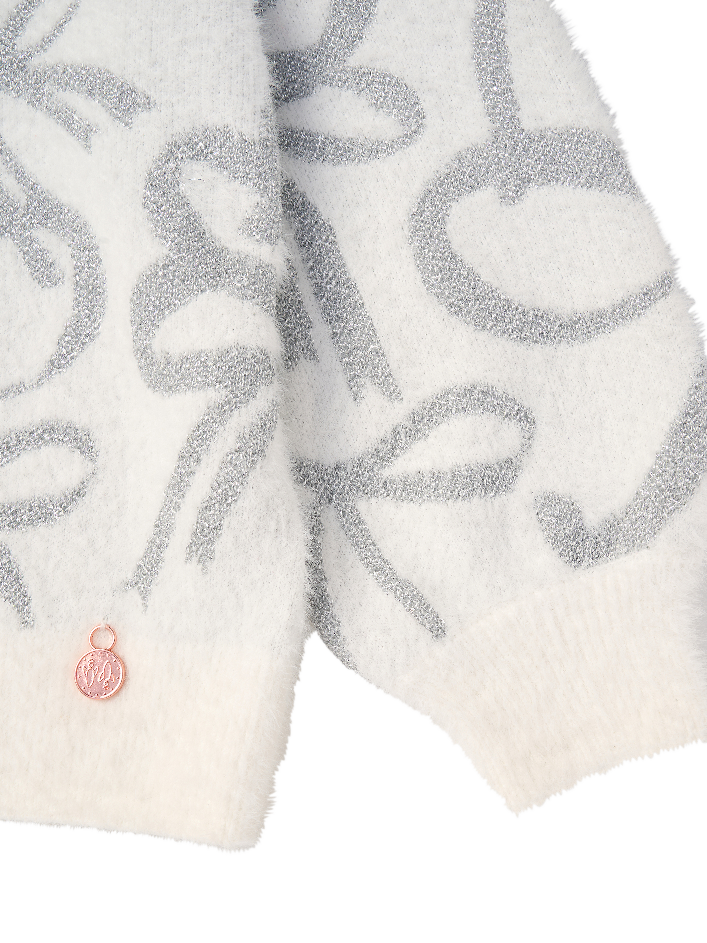 Snow two ways about it, this jumper is the perfect winter knit! Made from the softest fluffy yarn and adorned with silver lurex bow garland, they'll never want to take it off! Available in little sister sizes.