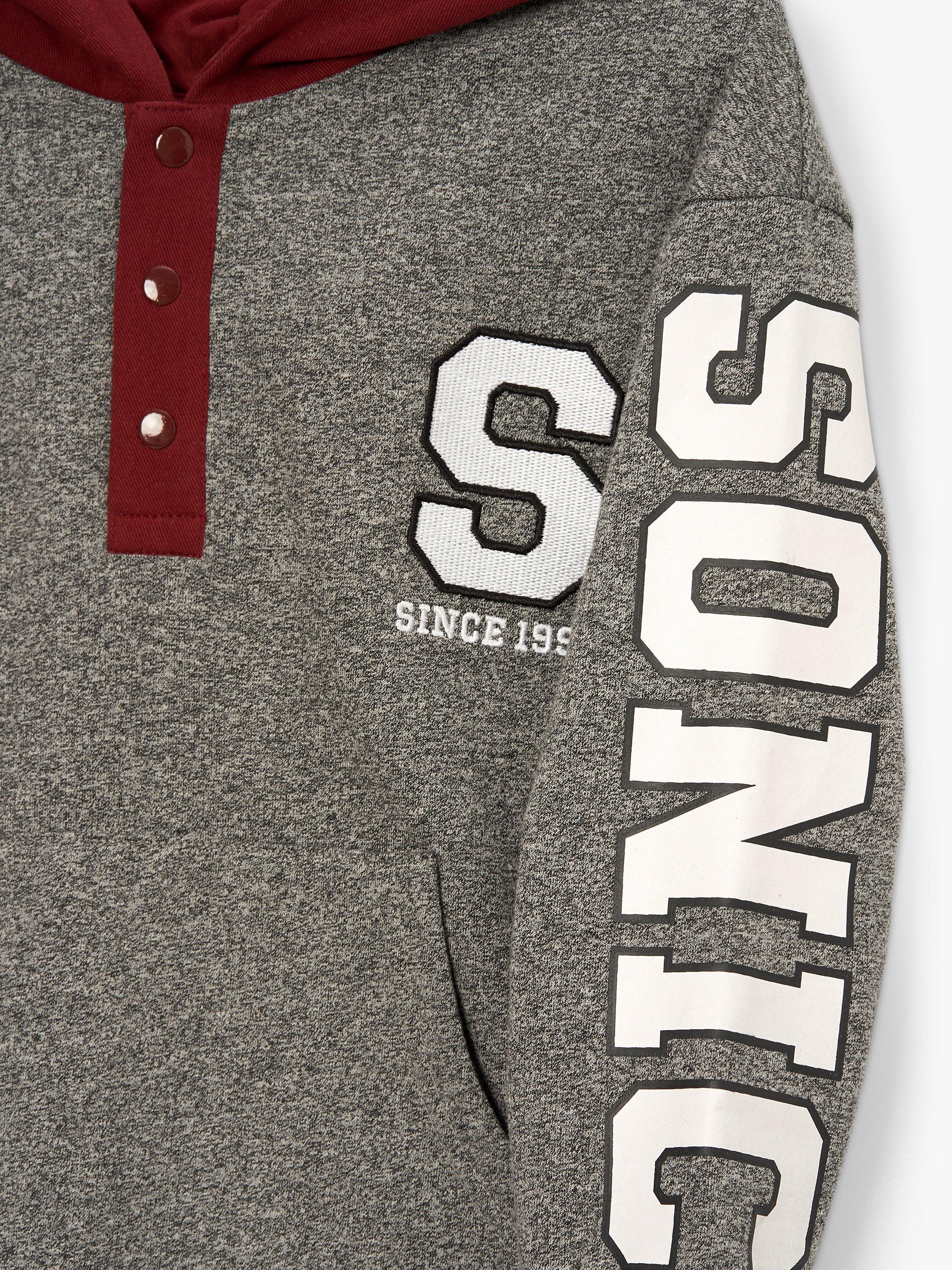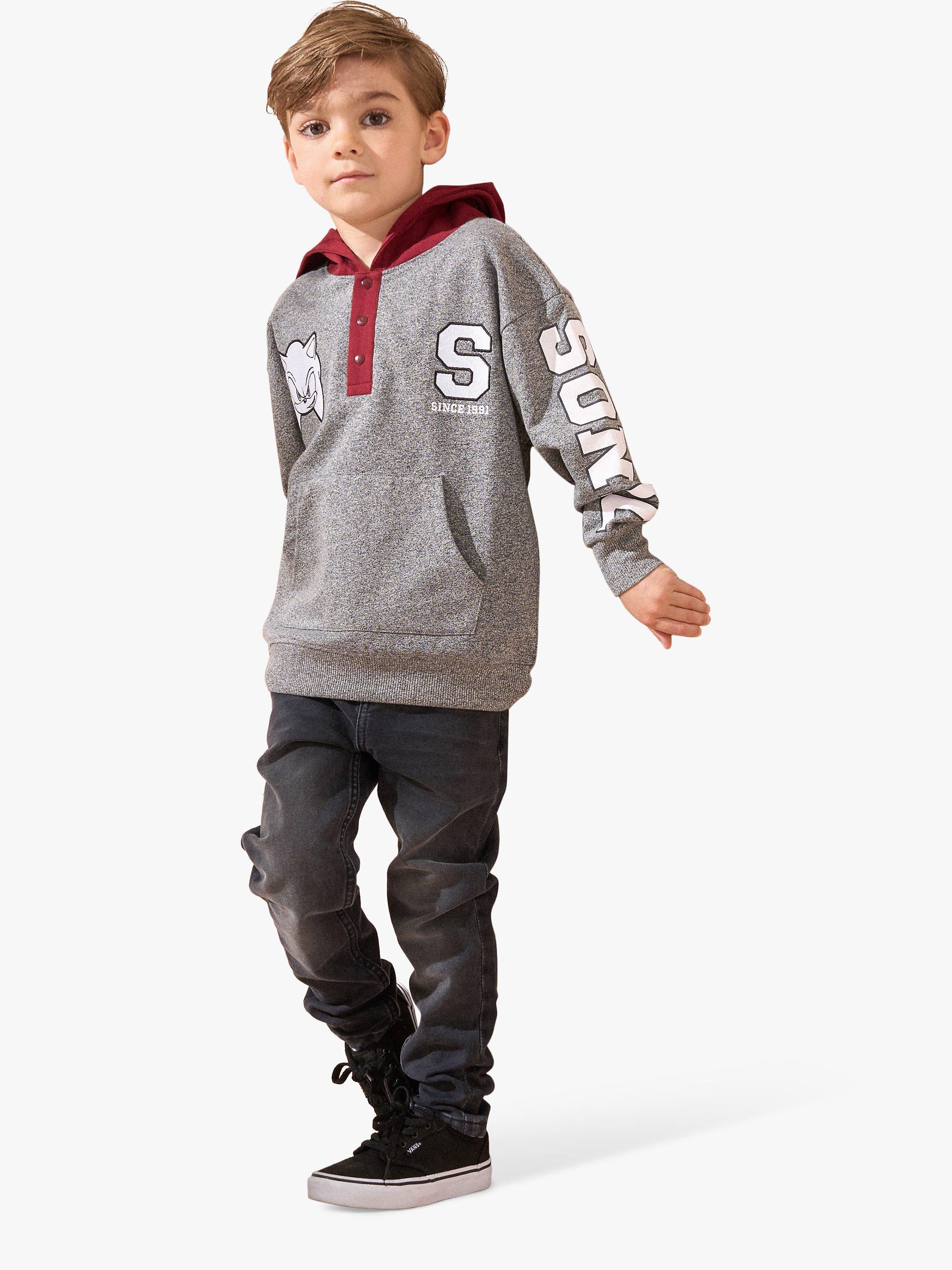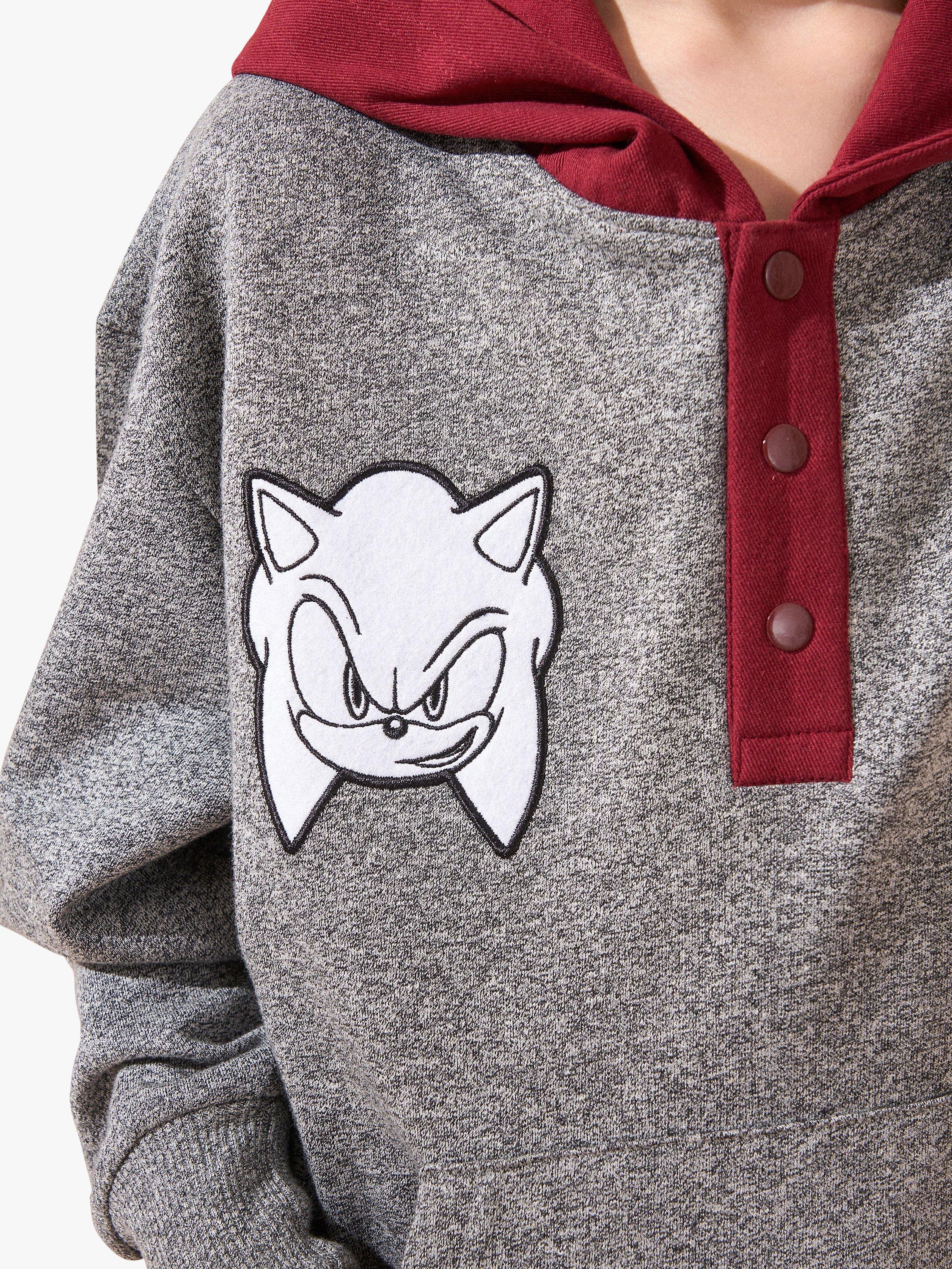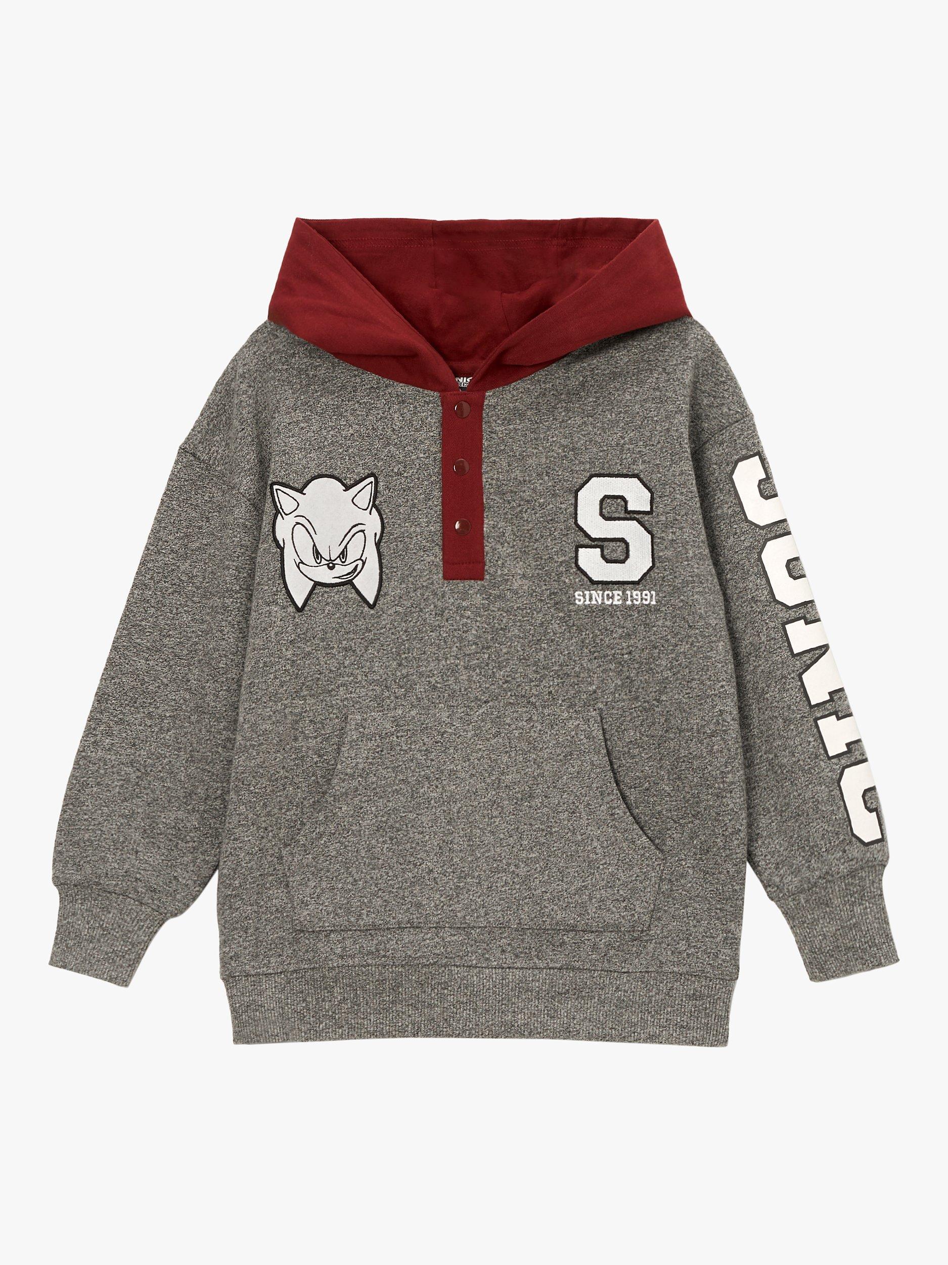 A hedgehog becomes a hero. Level up in this Sonic hoodie. In a fabulous colour palette of grey marl and burgundy, featuring a popper placket, varsity details and next level graphics. Lets roll!