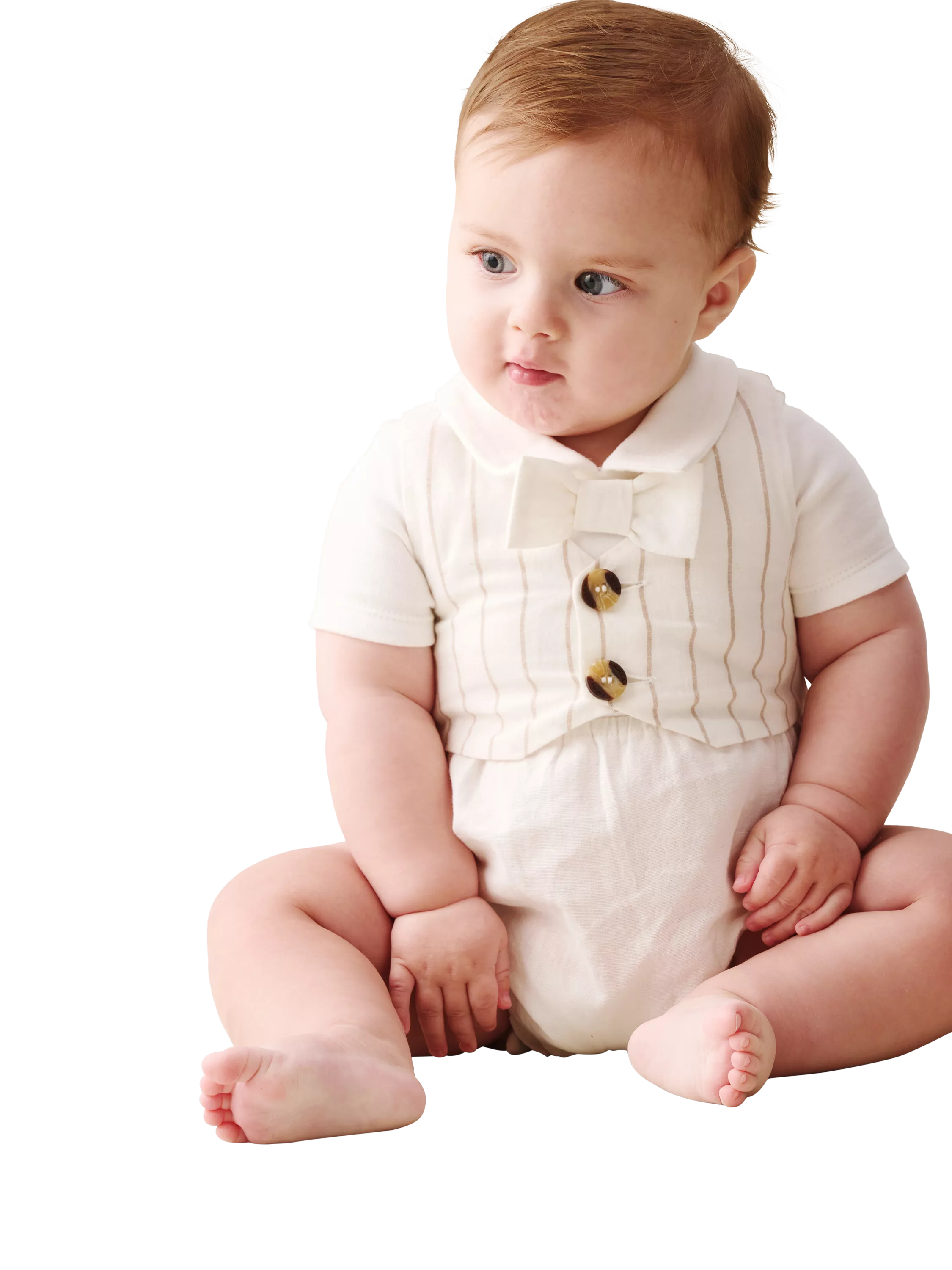 This adorable all-in-one romper is perfect for baby's big day out. Featuring soft ivory stripe trousers and a matching waistcoat, it’s finished with a classic jersey shirt and bow tie for extra charm.