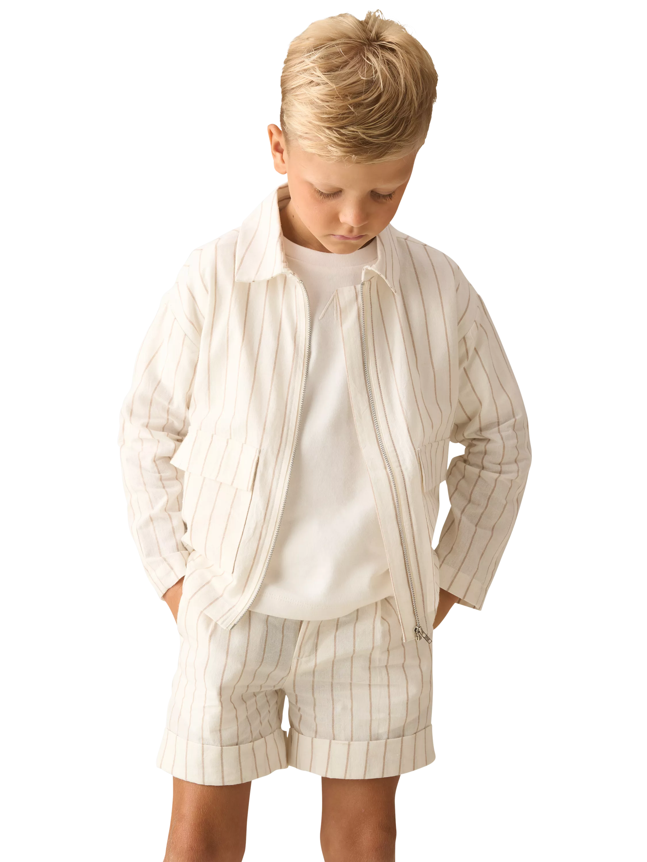 This ivory jacket, with fine neutral stripes, is the perfect lightweight layer for spring-summer adventures. Designed with a zip-up front and pockets, it brings a smart-casual touch to everyday dressing—and works just as well for special outings too.