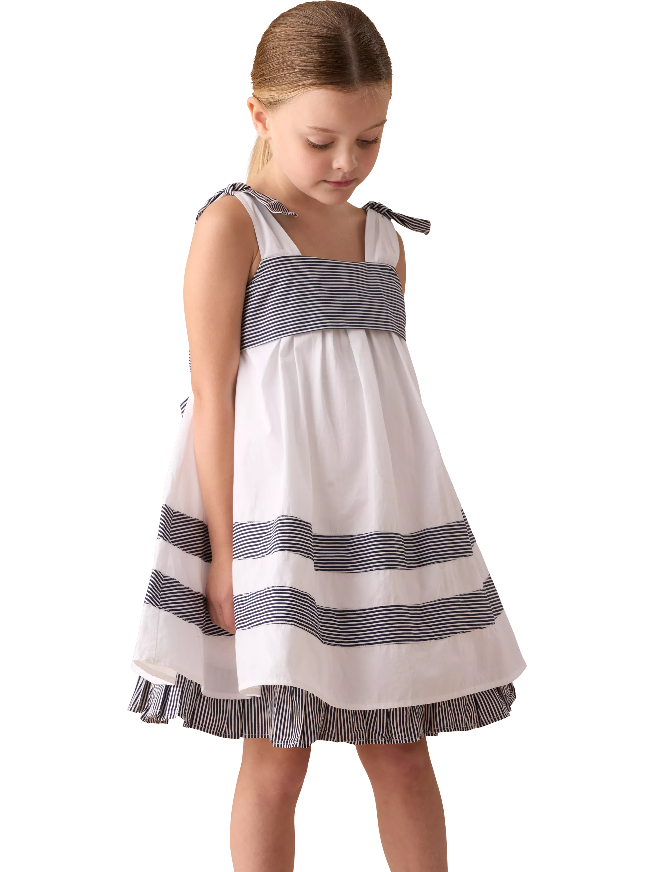 A beautiful polished cotton swing dress with pretty bow detail straps and contrast stripe panels in classic white and blue.