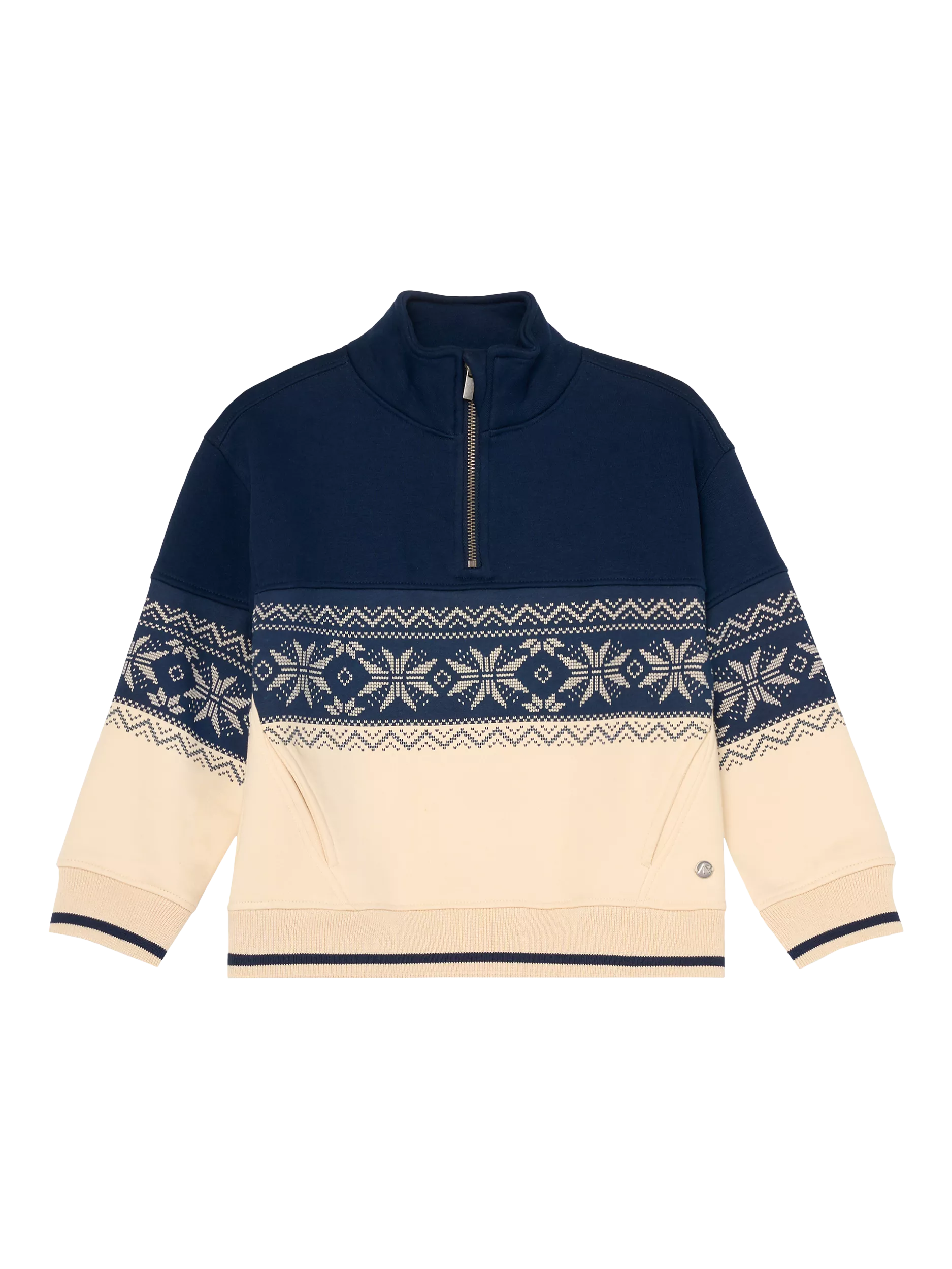 Keep it cool and comfy with this zip-neck jersey sweatshirt. With bold navy and cream colour blocking and a festive Fair Isle print across the centre, it’s made for everything from snowy adventures to chilled-out days. A go-to pick for boys who like to keep it classic with a twist.