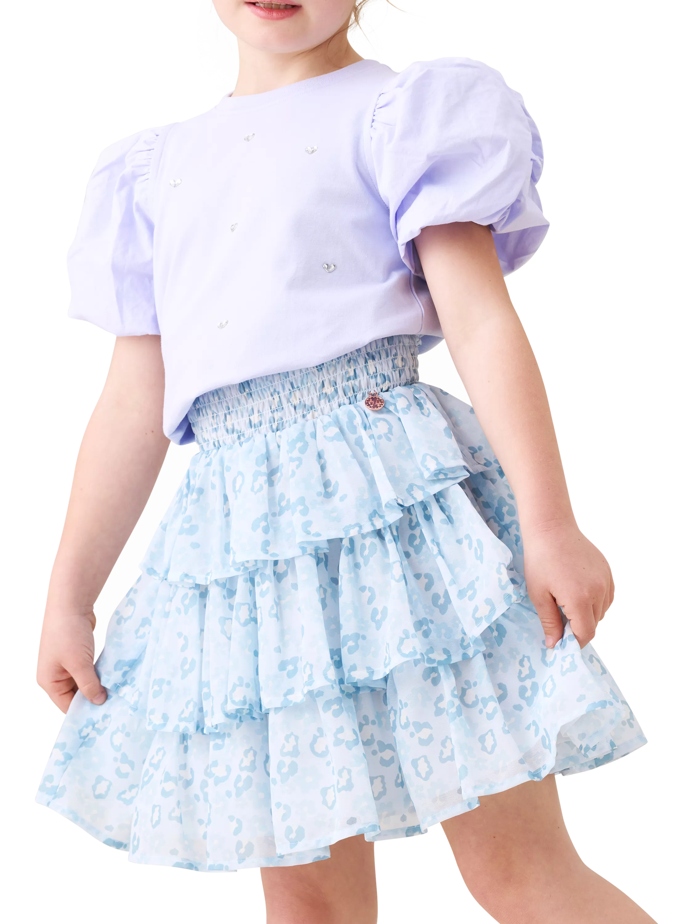 This leopard print rara skirt features tiers of soft georgette with a touch of sparkle, ideal for twirling. With a gathered waist for an adjustable fit, it’s perfect for adding some playful style to any outfit
