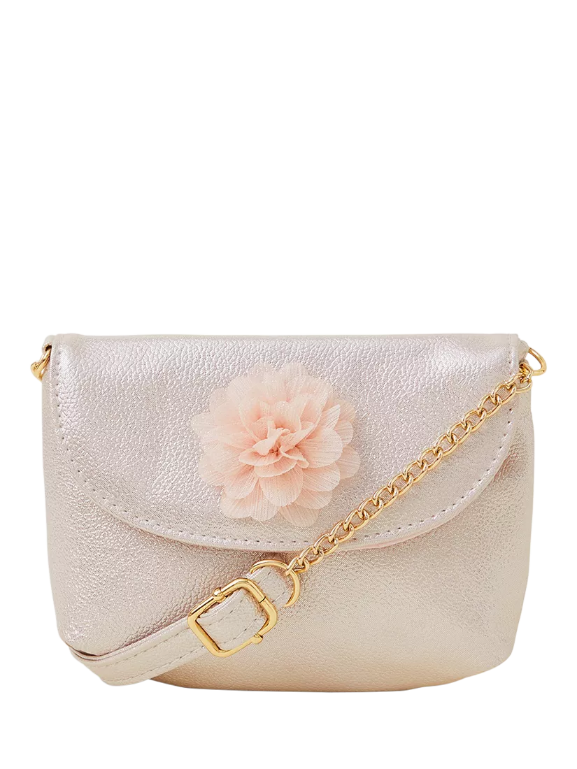 Offering an abundance of style, this shimmery accessory is designed with a fold-over top and a pretty fabric flower decorating the front. Finished with a rip-tape closure and adjustable strap.