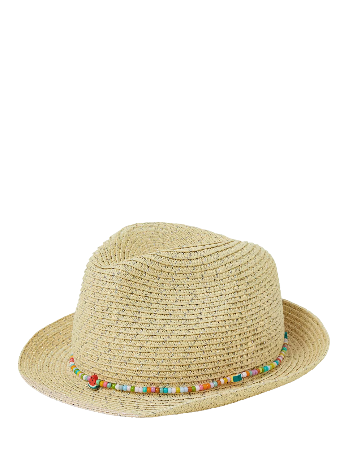 The team at Accessorize put a whole lot of summer fun into this trilby hat! Woven with sturdy straw that keeps its classic shape, the brim features a fruit beaded band that brings all the fun.