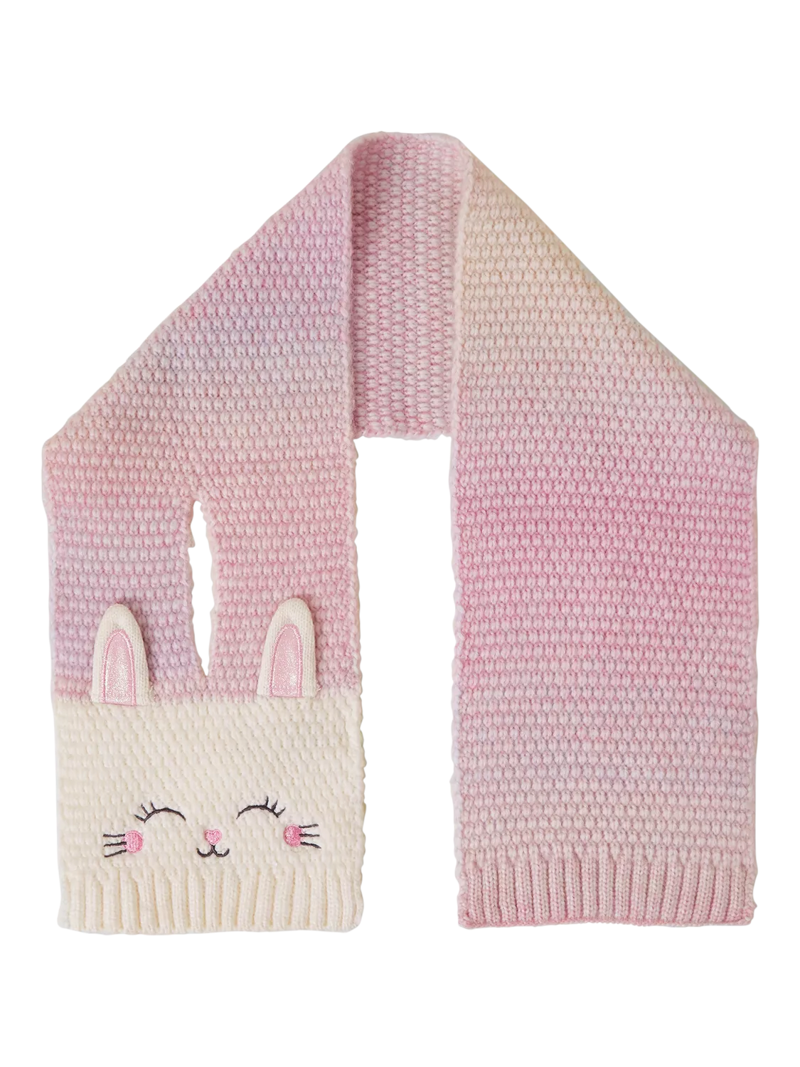 Stitched in dreamy pink yarns with an ombre finish, this snuggly scarf features a cute bunny face with glittery ears.