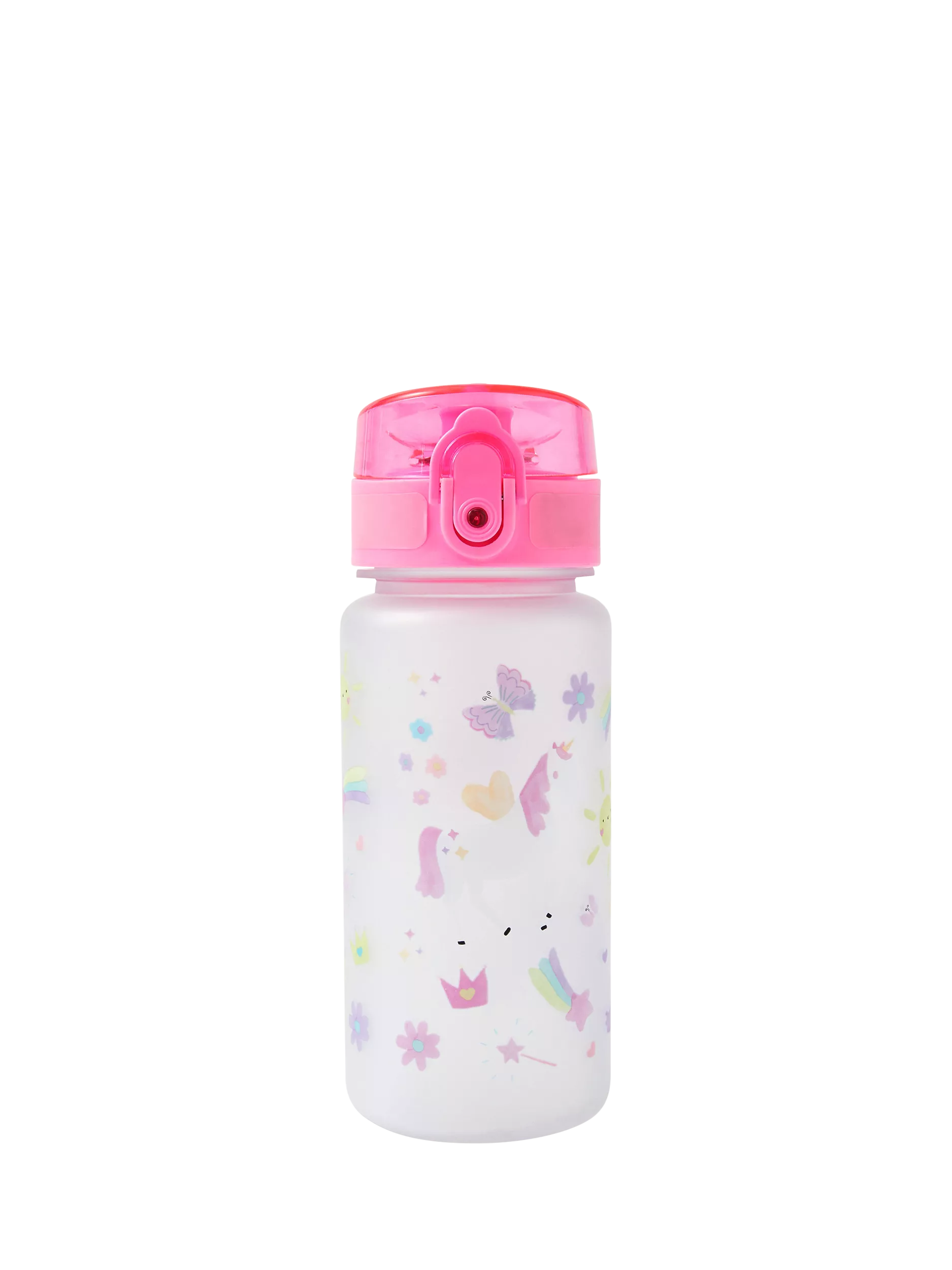 Designed with a flip-top straw lid, this clear water bottle is decorated with friendly fairy tale motifs in pretty, pastel colours.