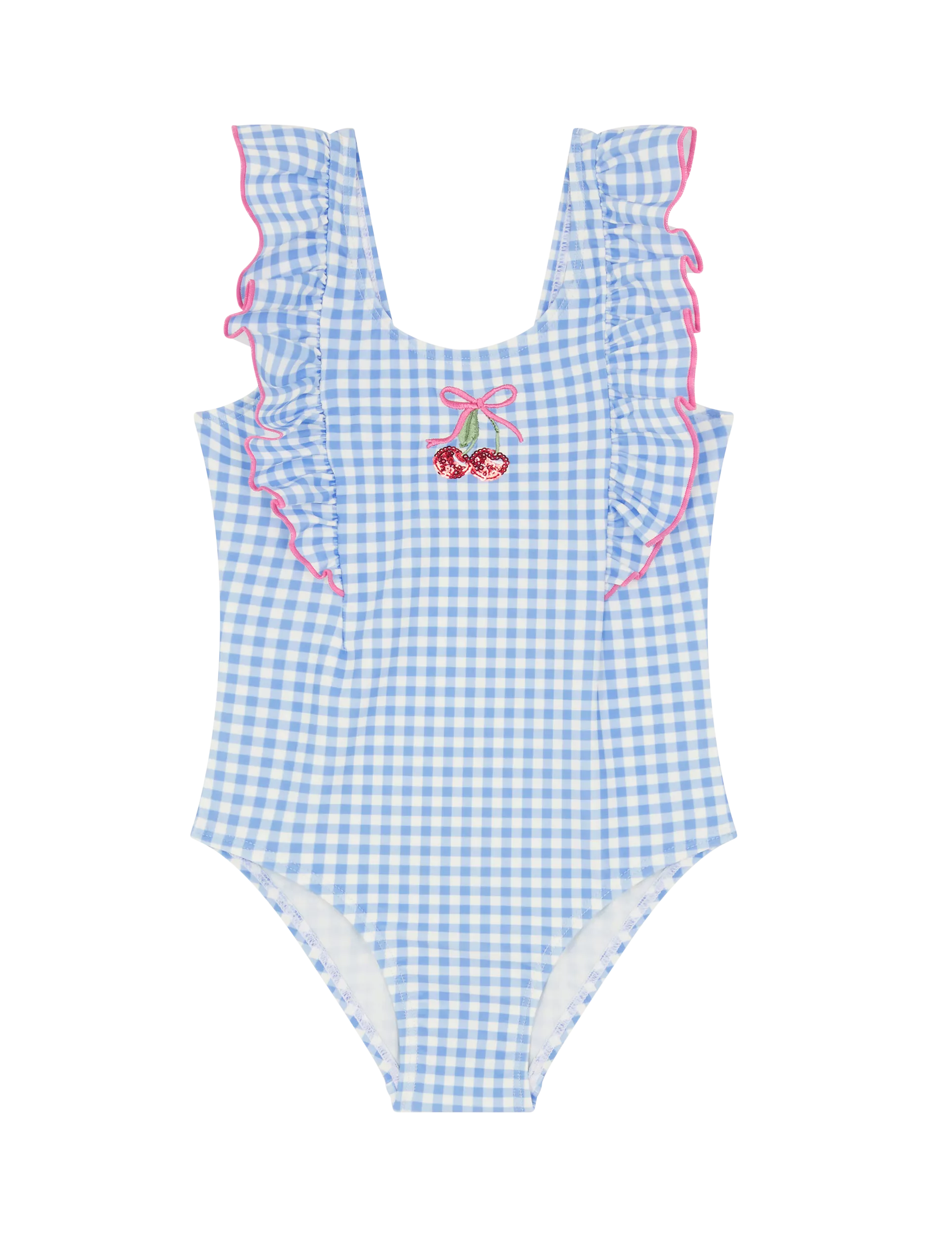 Covered in a gingham print with a dazzling cherry on the chest, this swimsuit is finished with contrast frills.