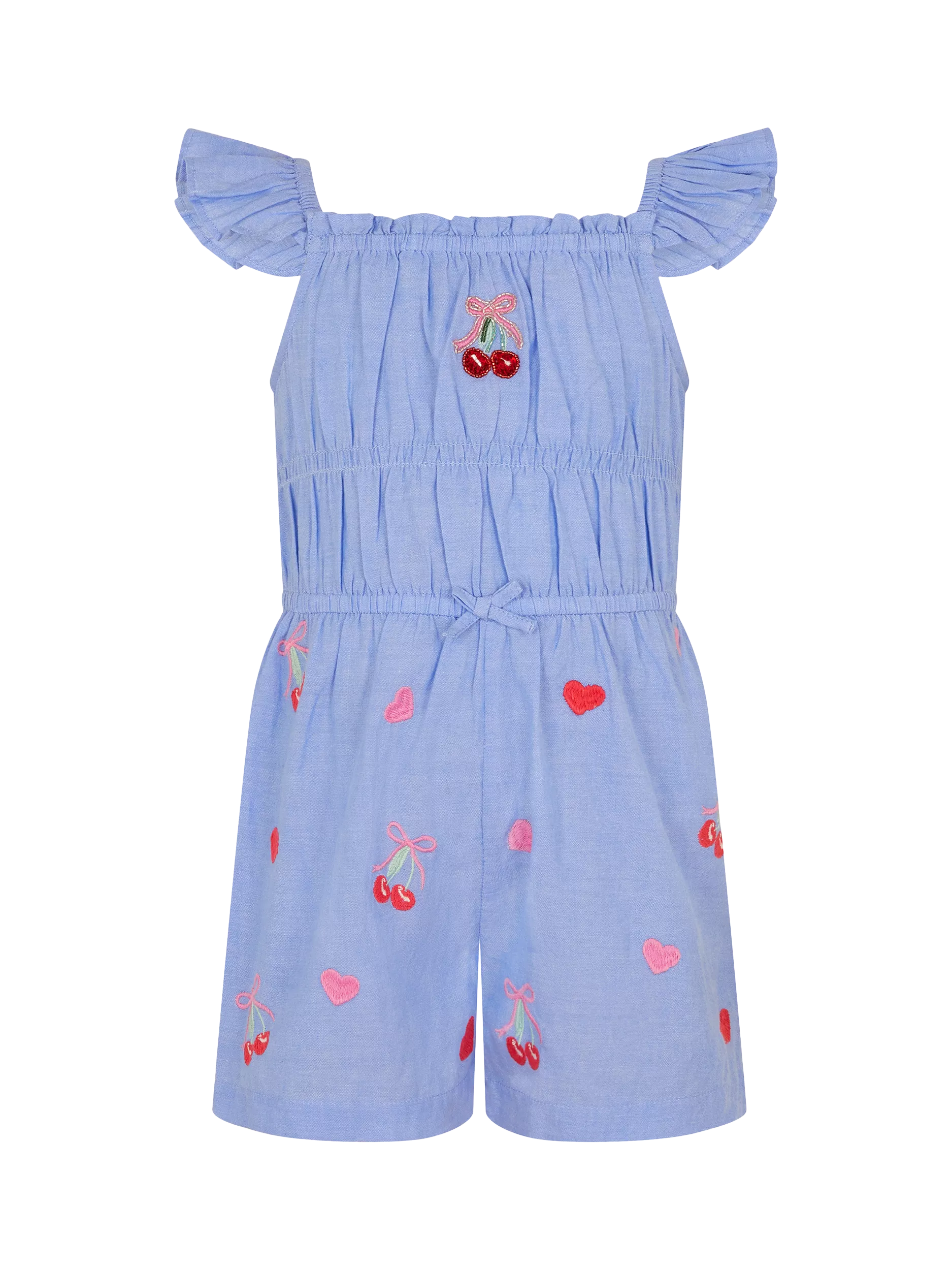 This playsuit features a ruffle top and frilly sleeves with embroidered hearts and cherries to finish.