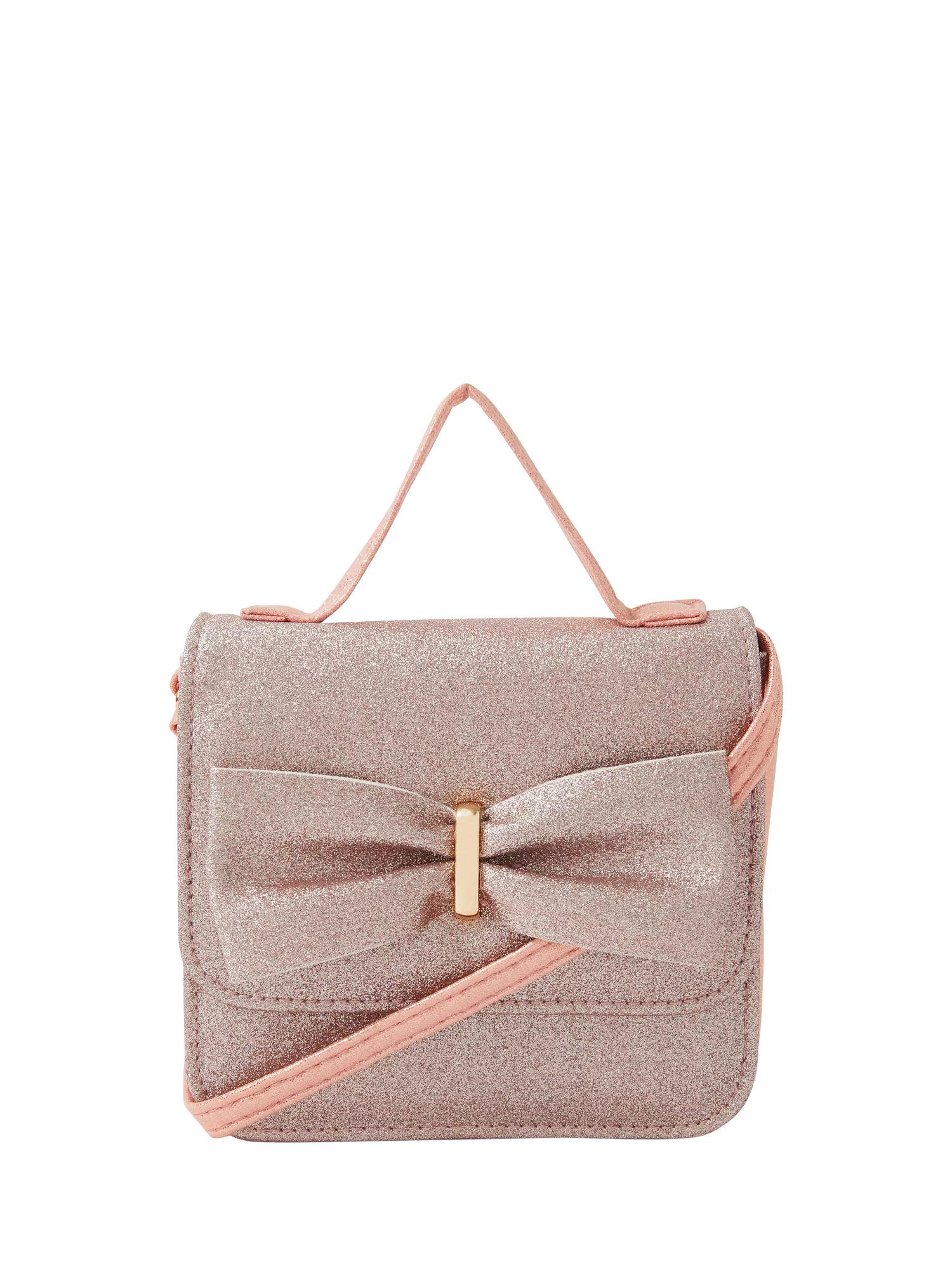 Perfectly-sized for pocket money and party essentials, this glitzy bag is designed with a fold-over profile and XL bow on the front. Finished with a top handle for easy carrying and a crossbody strap.