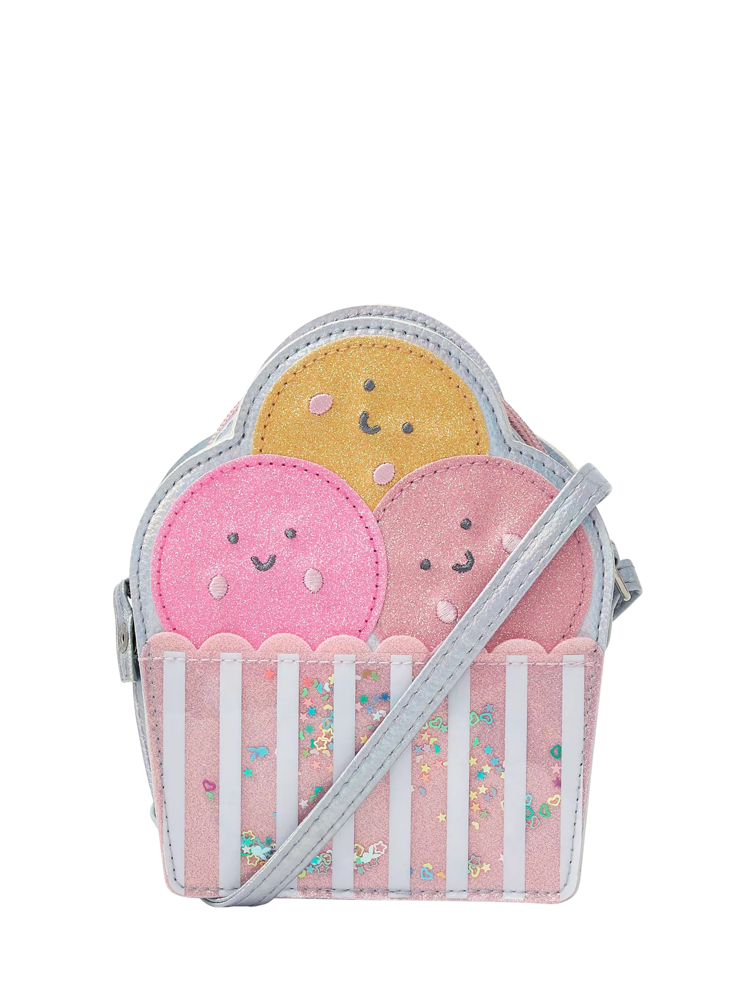 Shaped like an ice cream sundae sprinkled with glitter and confetti, this bag features a main zip compartment and a long strap to style like a crossbody.