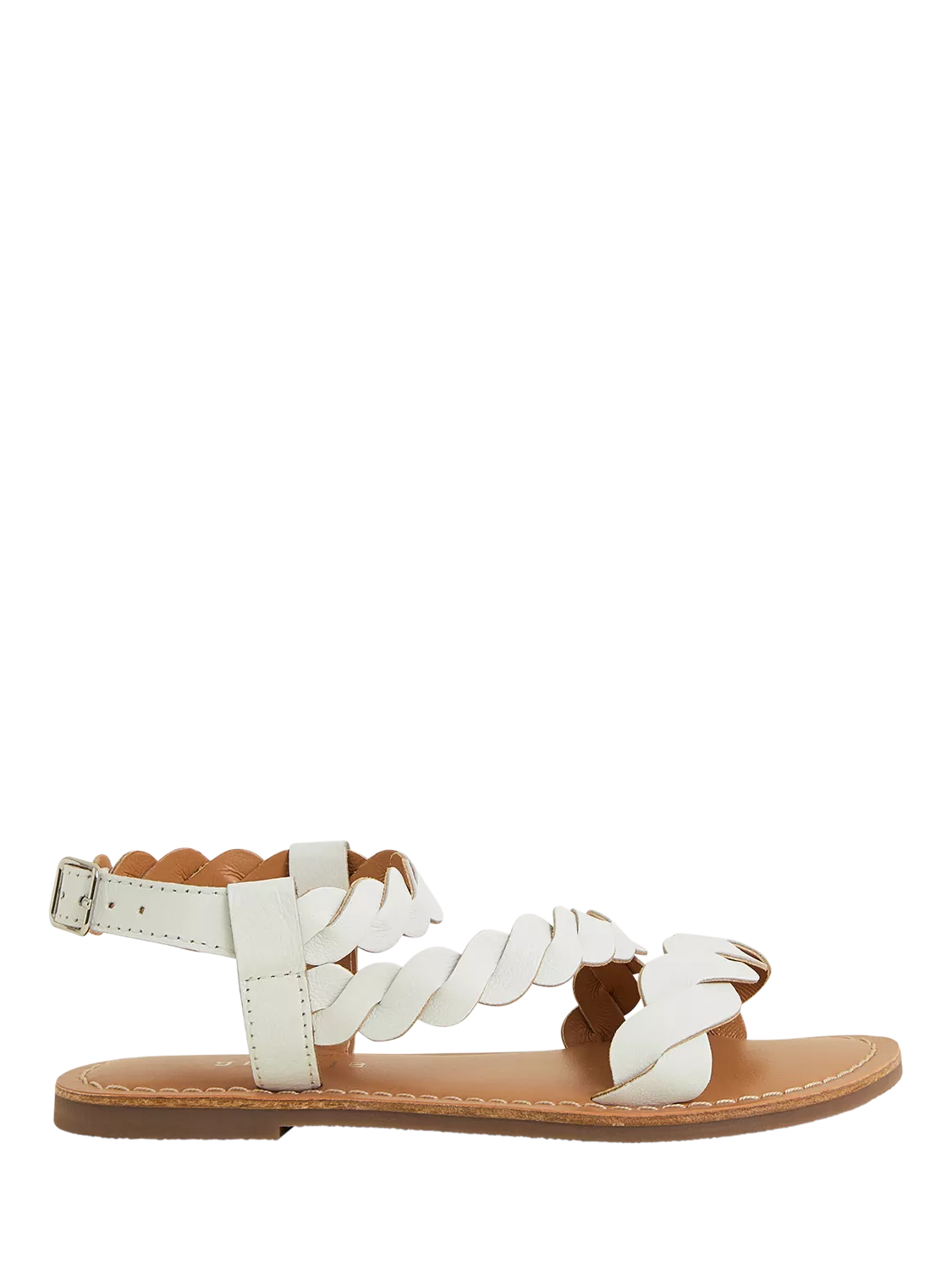 Made for holiday ventures, don't forget to pack this pair in their suitcase! Crafted in soft, white leather, they feature a strappy design with plaited accents for a bohemian touch. Fastens with a pinbuckle strap.