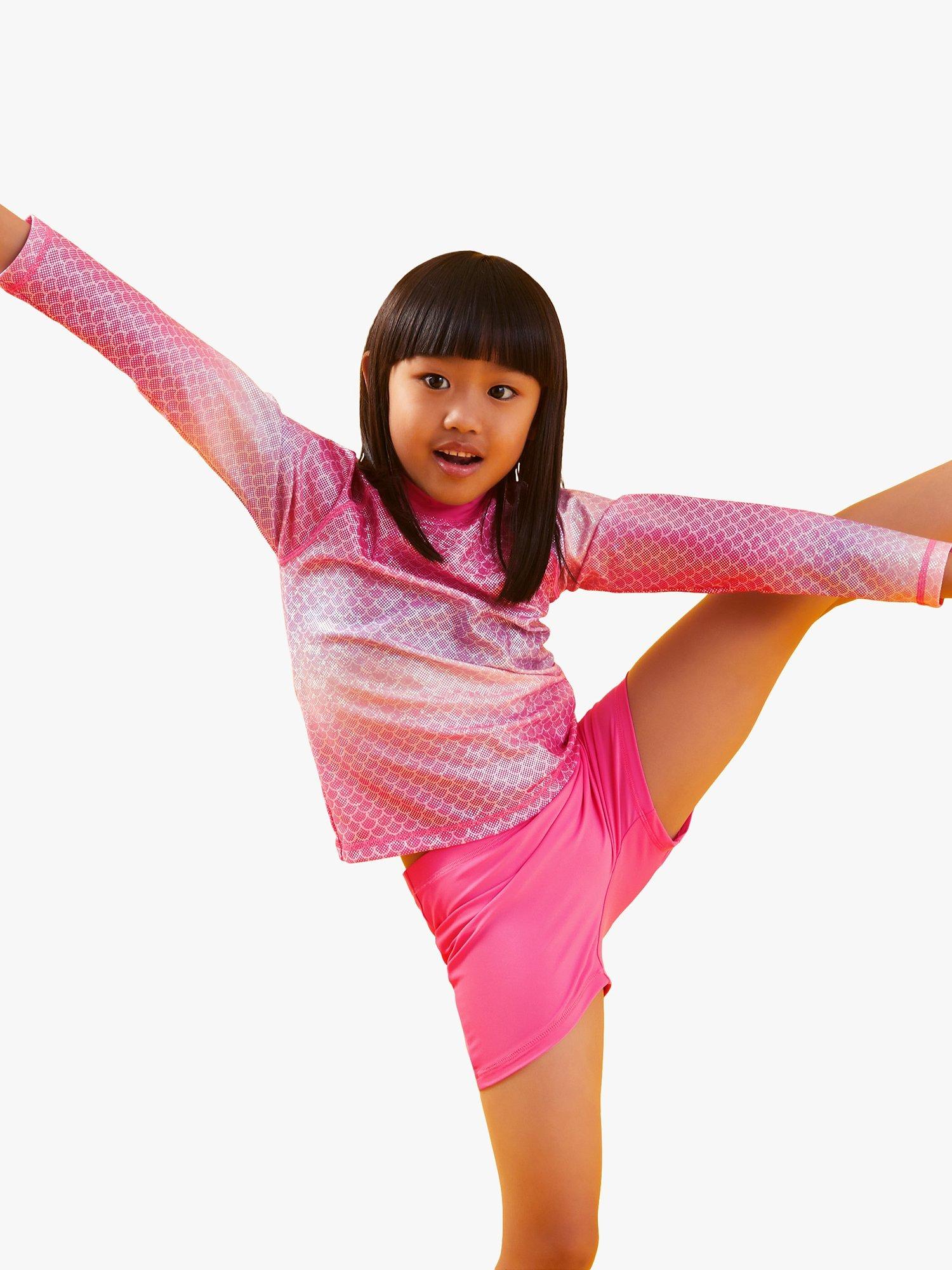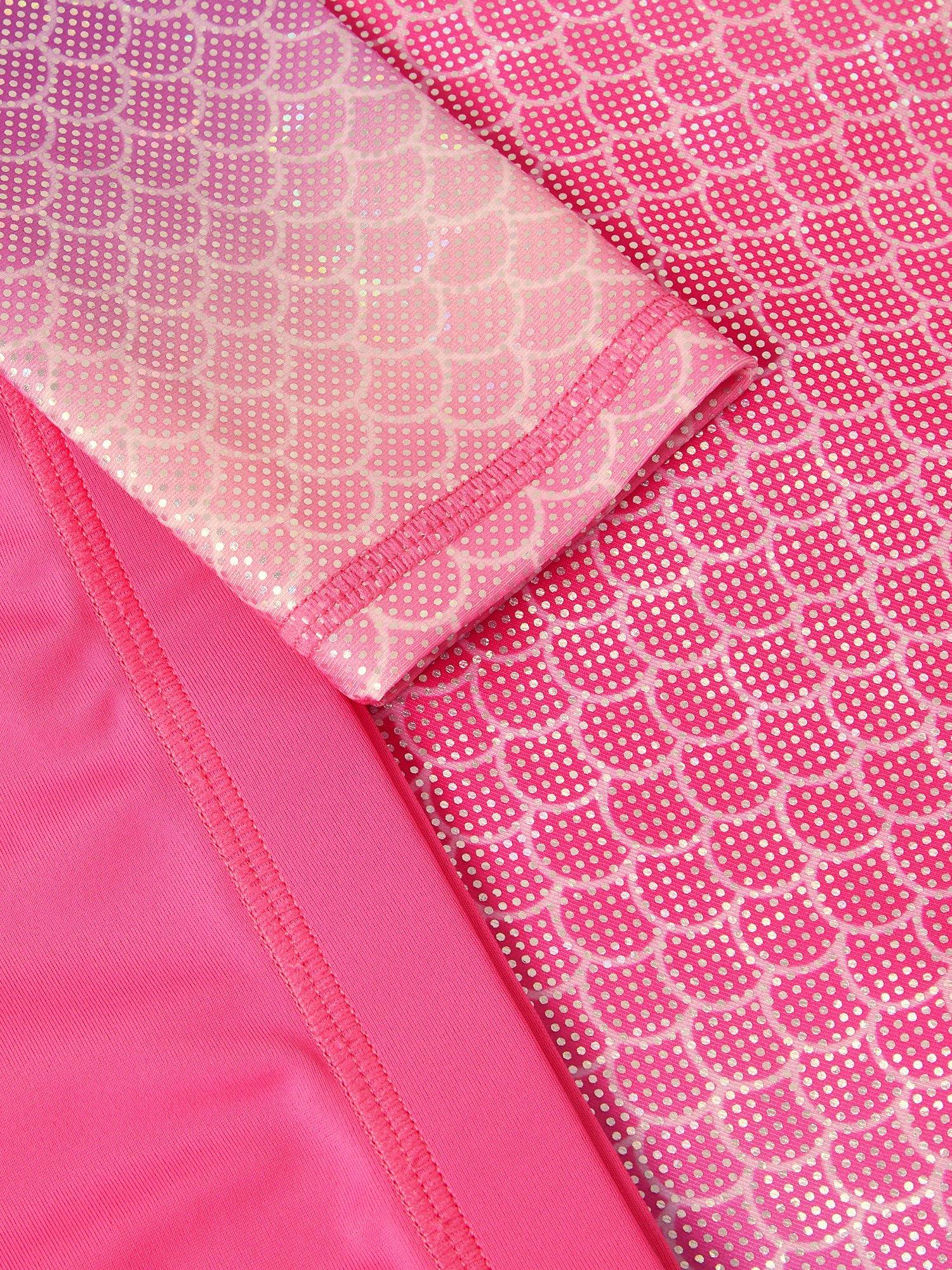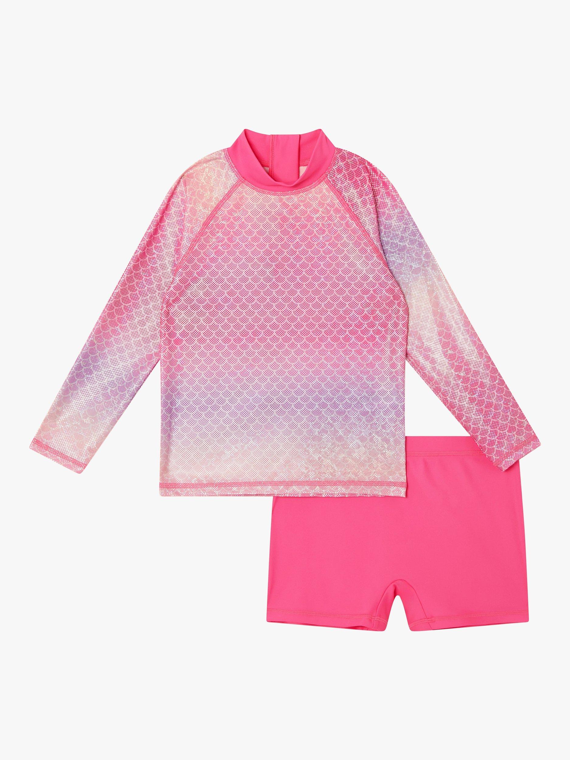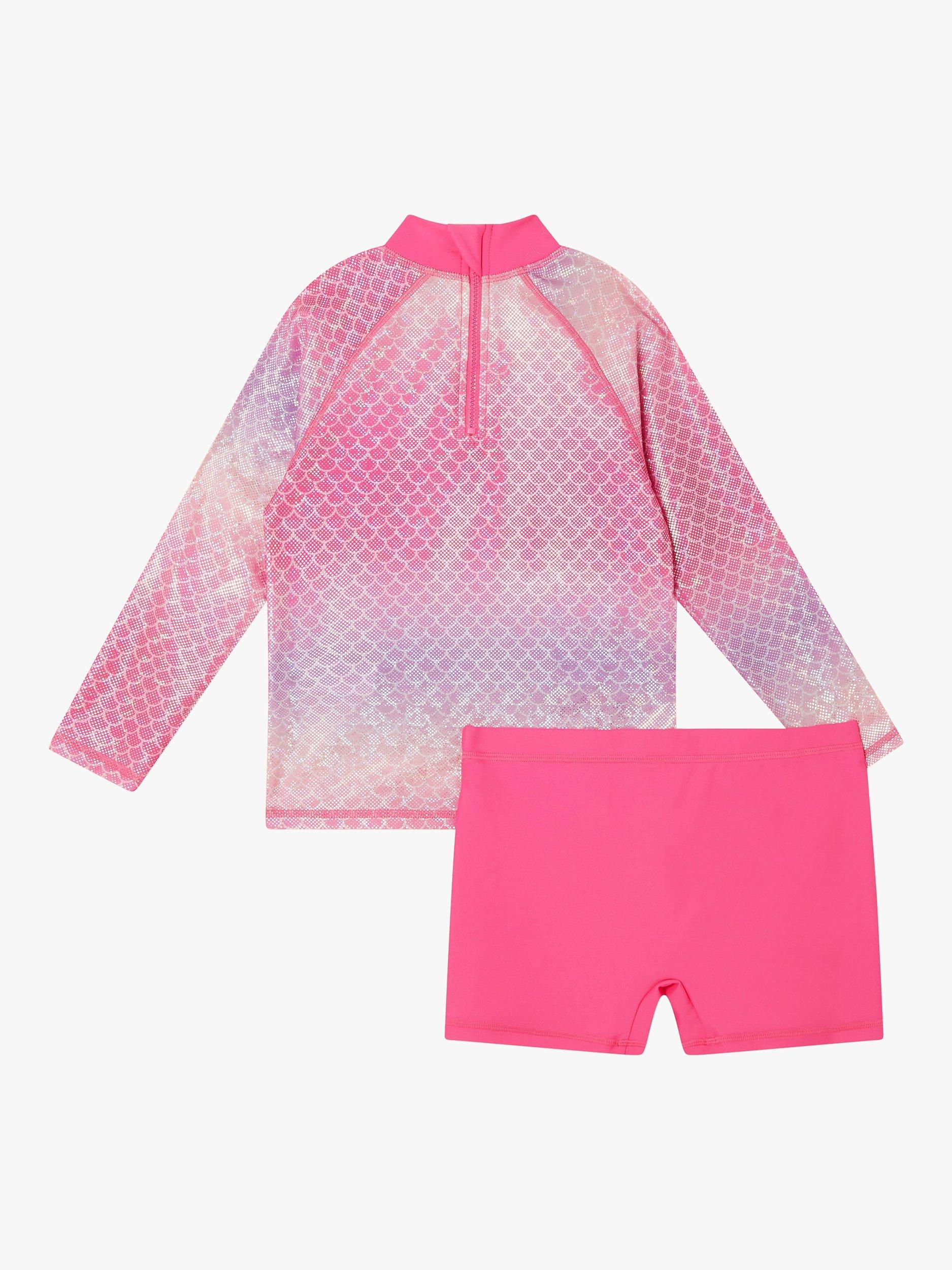 Calling all mini surfers and mermaid enthusiasts, this swim set calls for a summer full of splashes. Adding extra coverage to little ones in the sun, it features a long sleeve top with a high neck and covered tummy, with coordinating shorts to match. Finished with shiny mermaid scales, it's an essential in their suitcase. This piece also uses UPF50+ fabric that helps to provide protection against ultraviolet radiation from the sun.