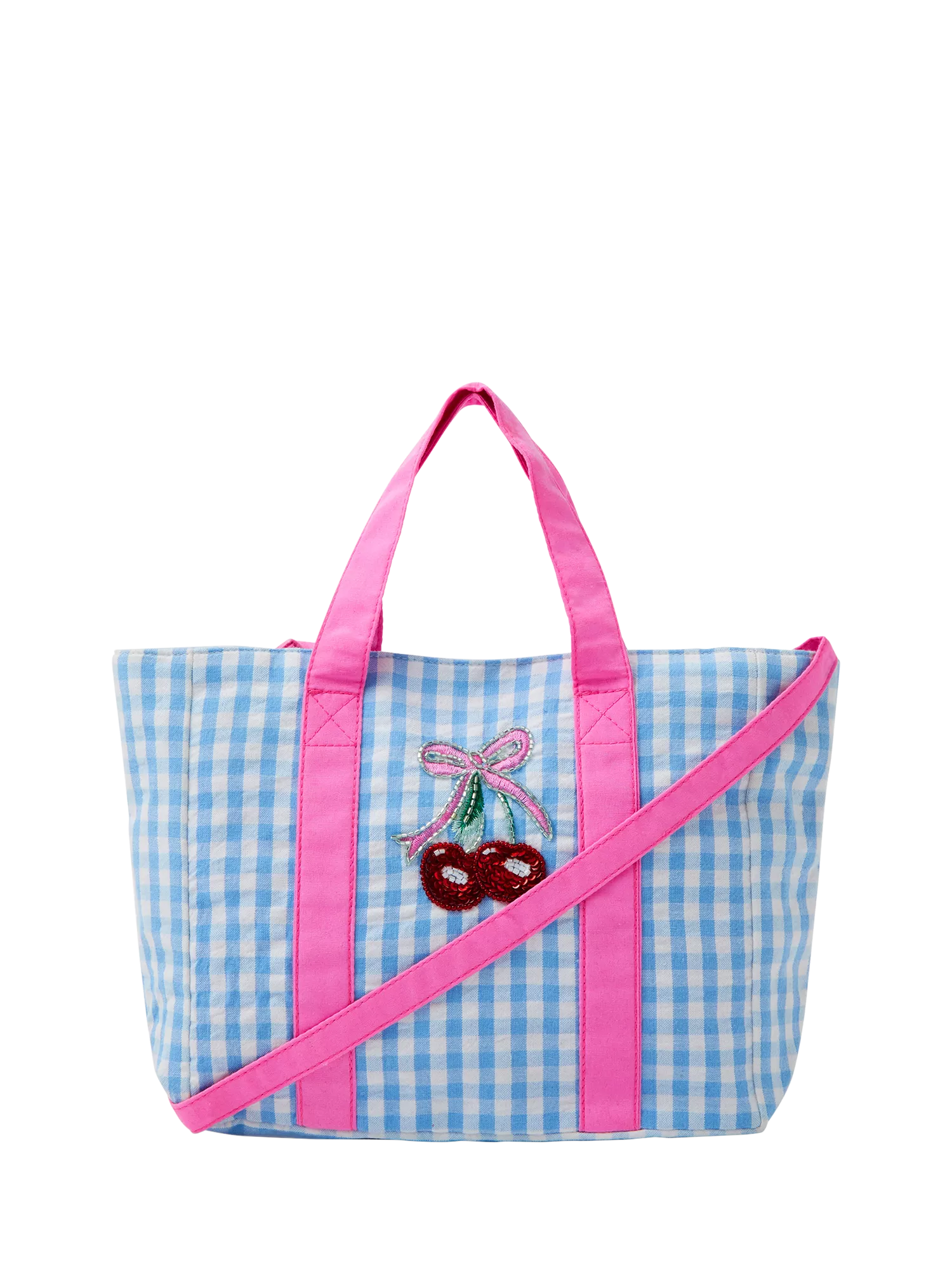 Designed in a blue gingham print, this tote bag features a sequin-embellished cherry motif on the front with two top handles and an optional strap to wear across the body. Finished with a zip fastening and small slip pocket inside.