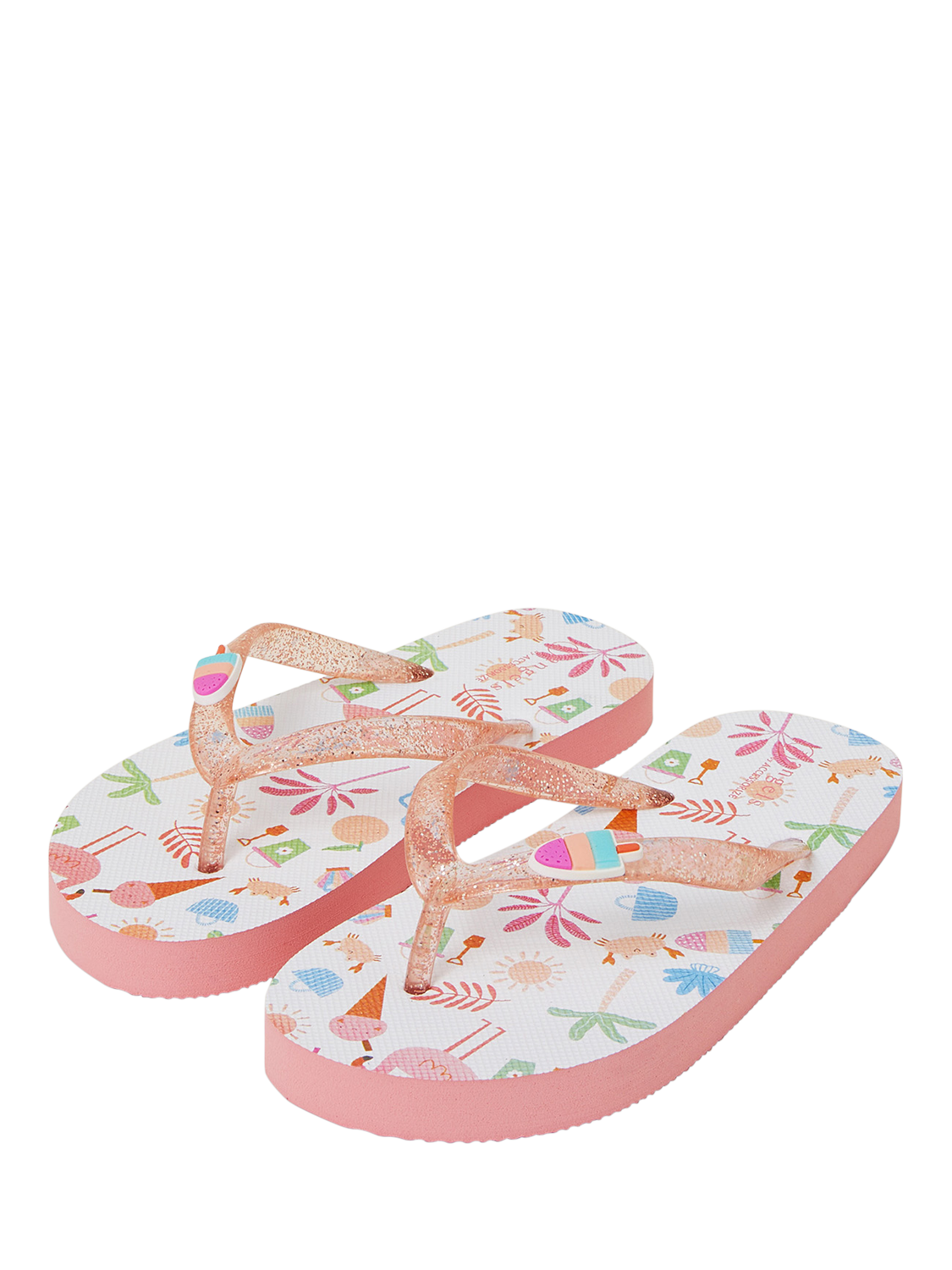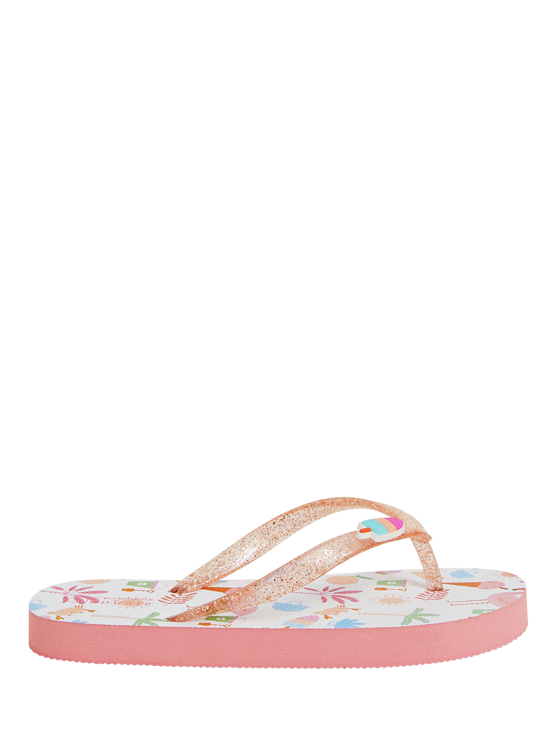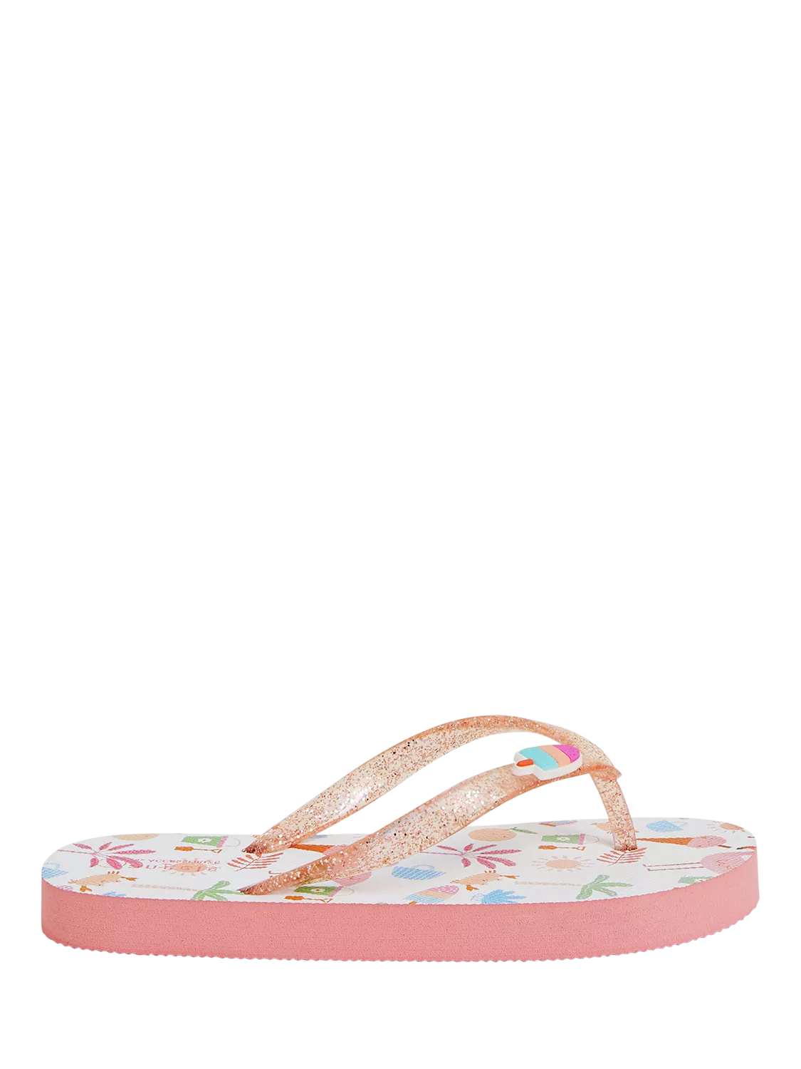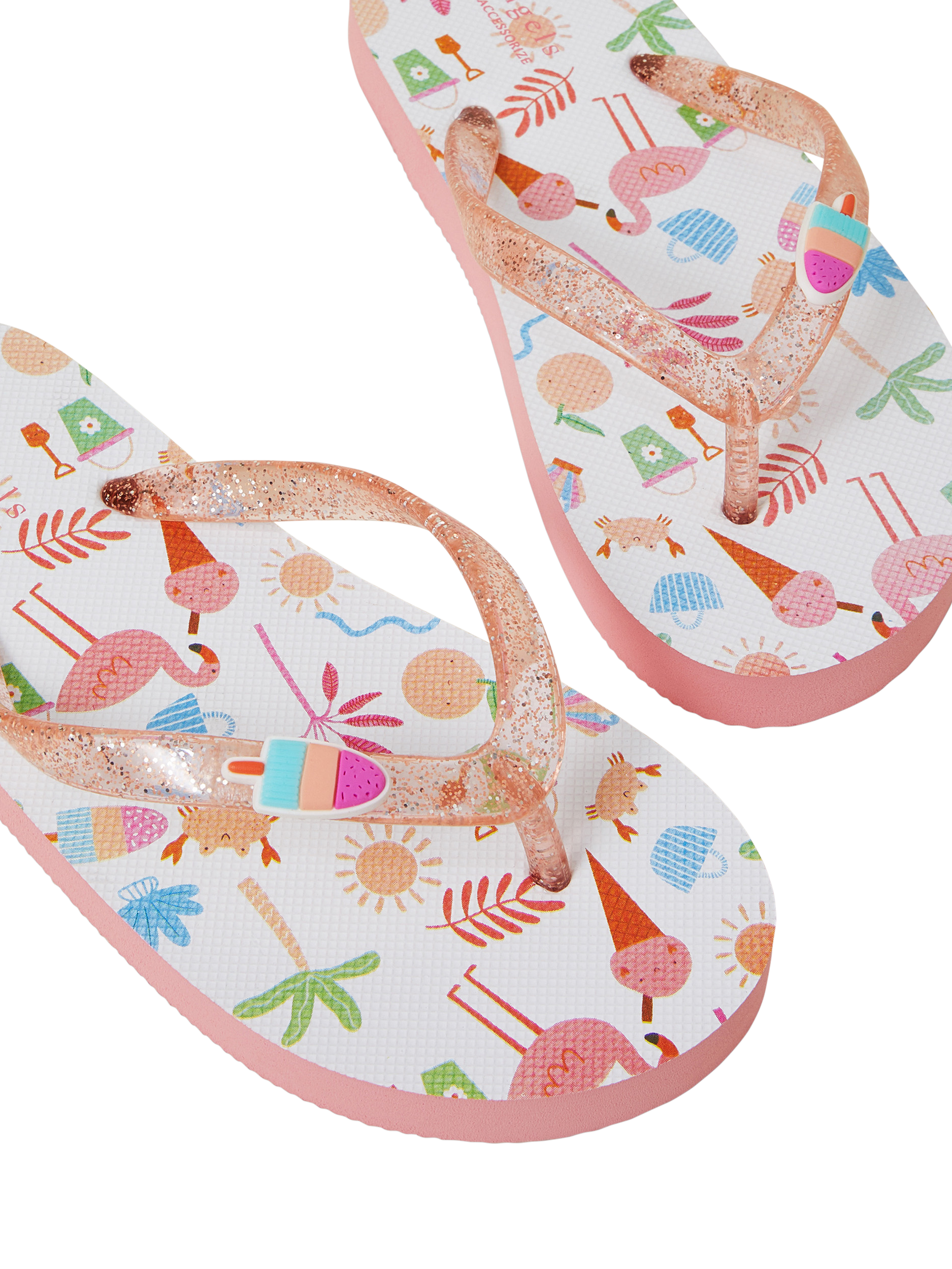 Let's go to the seaside! Perfect for the next family holiday in the sunshine, these flip flops have sparkly straps and a patterned footbed of all the fun things you'd find at the beach.