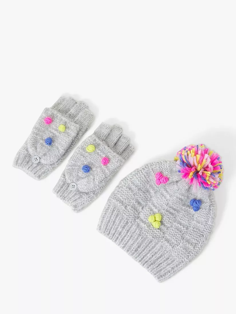 This cosy set will keep their head and hands warm during winter days. It's knitted and finished with colourful pom-poms for a touch of fun.