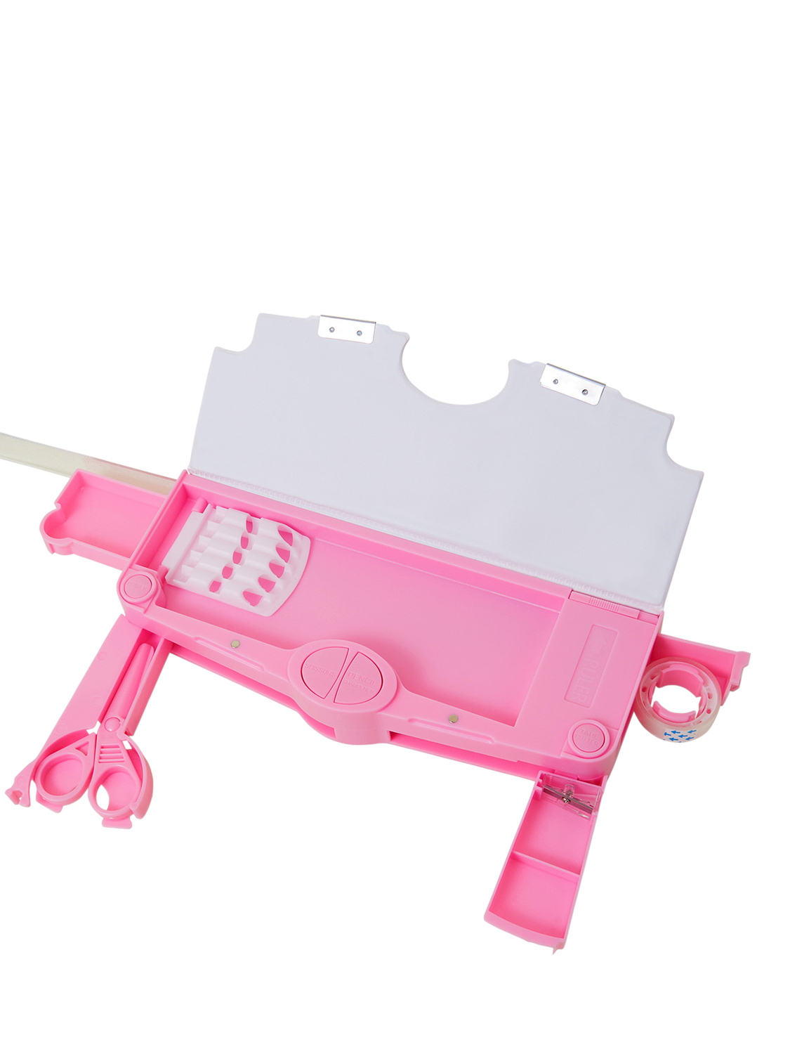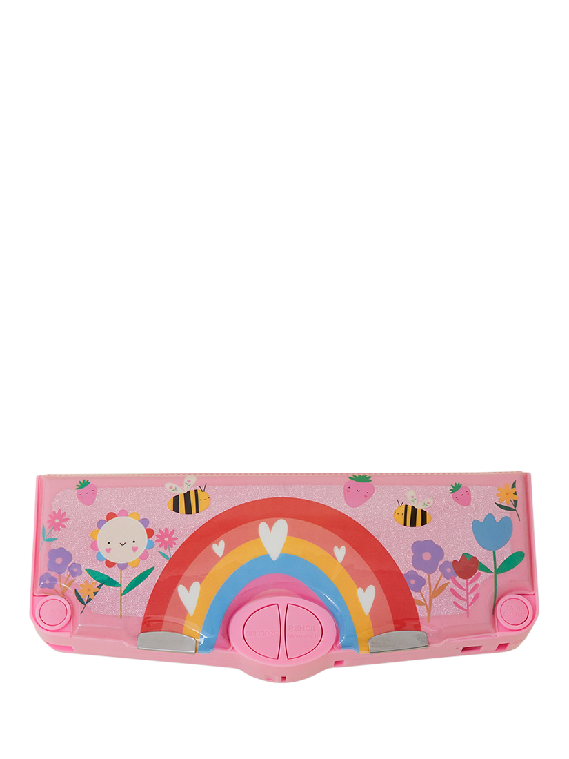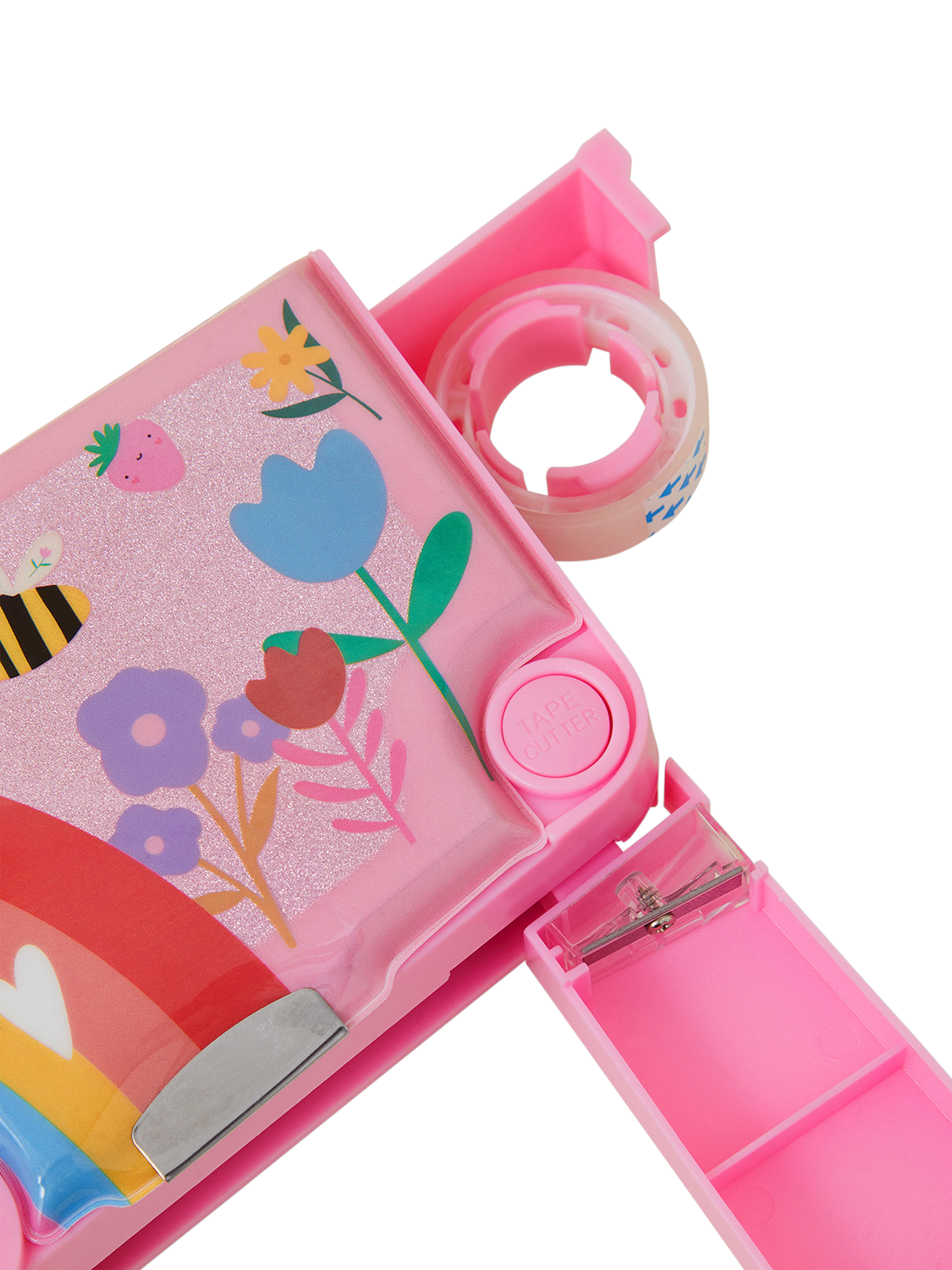 The coolest stationery in the classroom. Decorated with rainbows, flowers, bumblebees and strawberries, this pencil case will keeps their school essentials organised in style. Featuring pop-out compartments, scissors, sticky tape (with a cutter), pencil sharpener and slip-in storage for their favourite pens and pencils.
