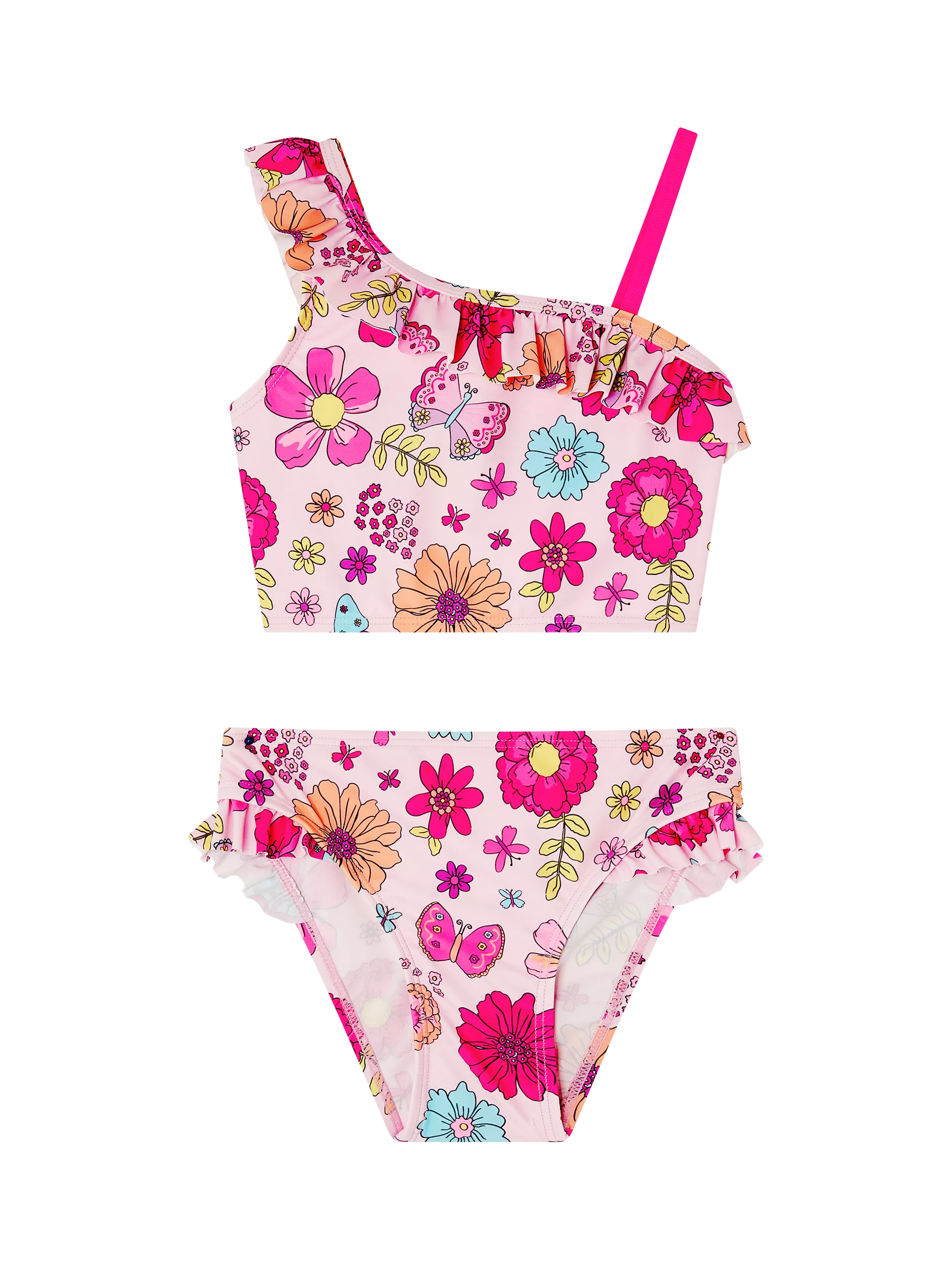 Designed in baby pink swim fabric, this bikini features a fun summery print of retro flowers and cute butterflies. The set includes a one-shoulder crop top and frilly bottoms to match. Please note that this product can only be returned with the hygiene seal still in place.