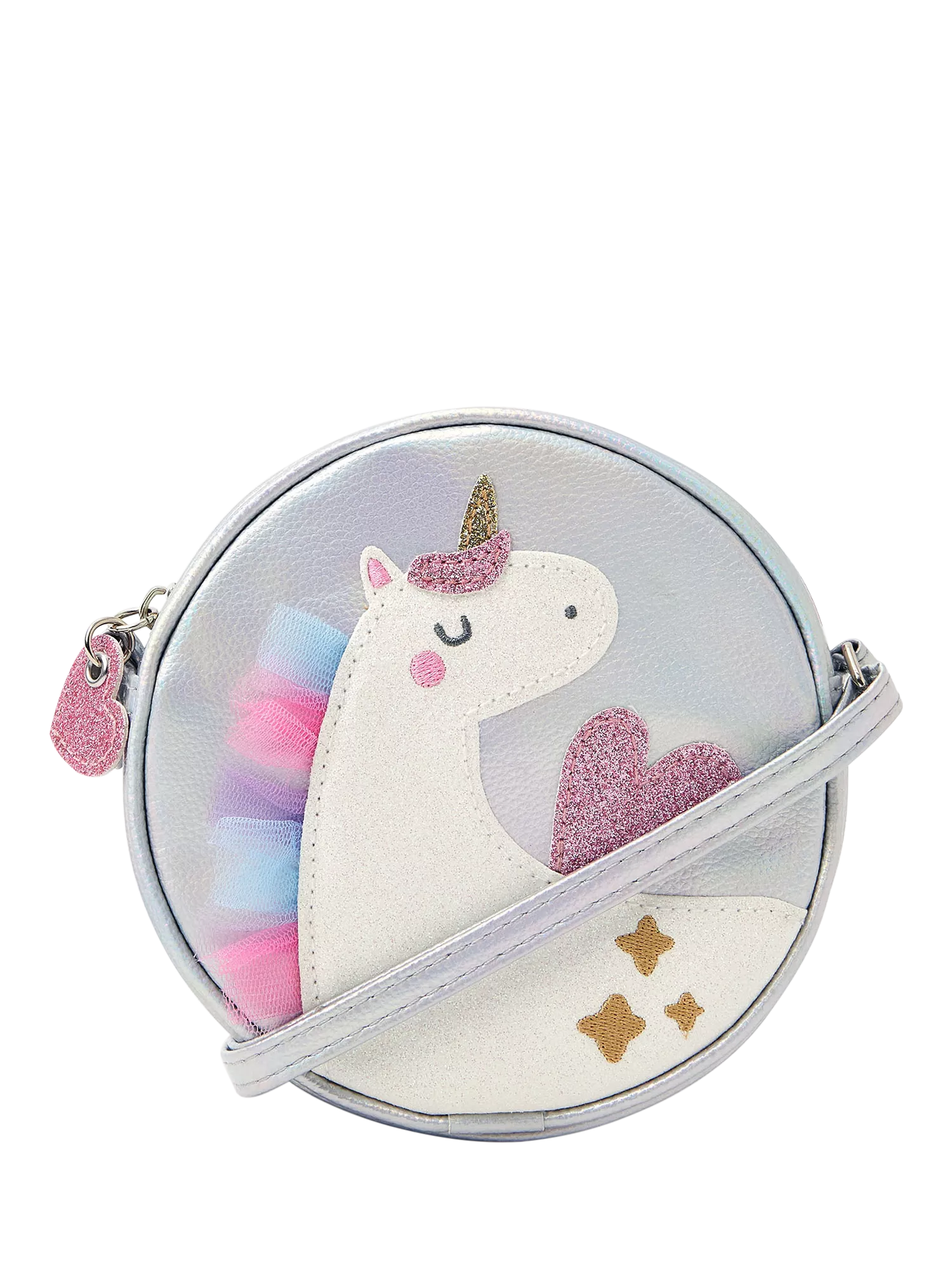 Designed in a round shape with a silver metallic finish, this bag showcases a glitzy unicorn on the front with a long crossbody strap to finish. Open the main zip compartment to find a small pocket inside, perfect for keeping spare change and small treasures safe.