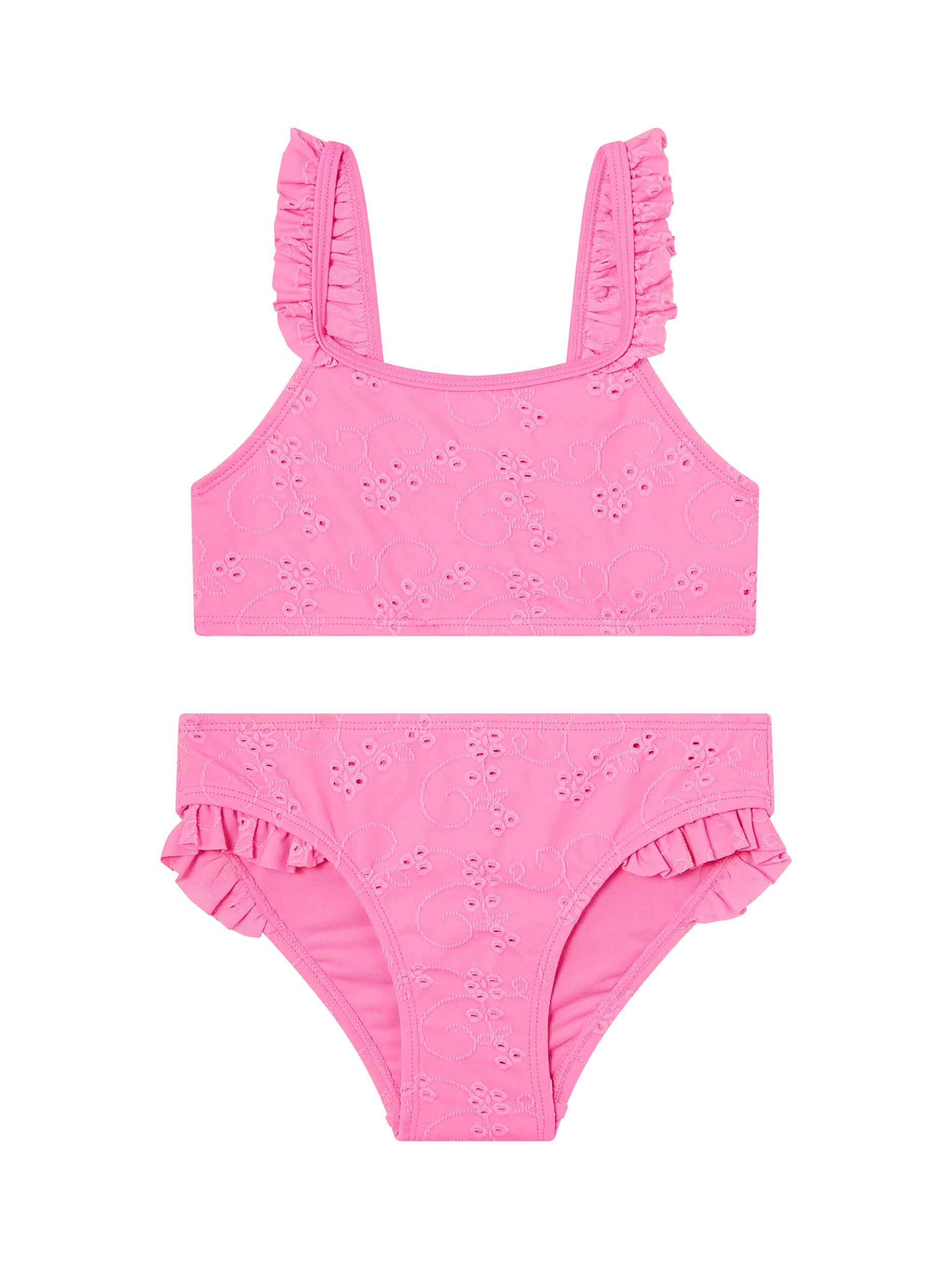Gift them a new bikini to practise their underwater somersaults and butterfly stroke in. Designed in soft and stretchy swim fabric, it features broderie embroidery and frill trims over a coordinating bikini top and brief bottoms.