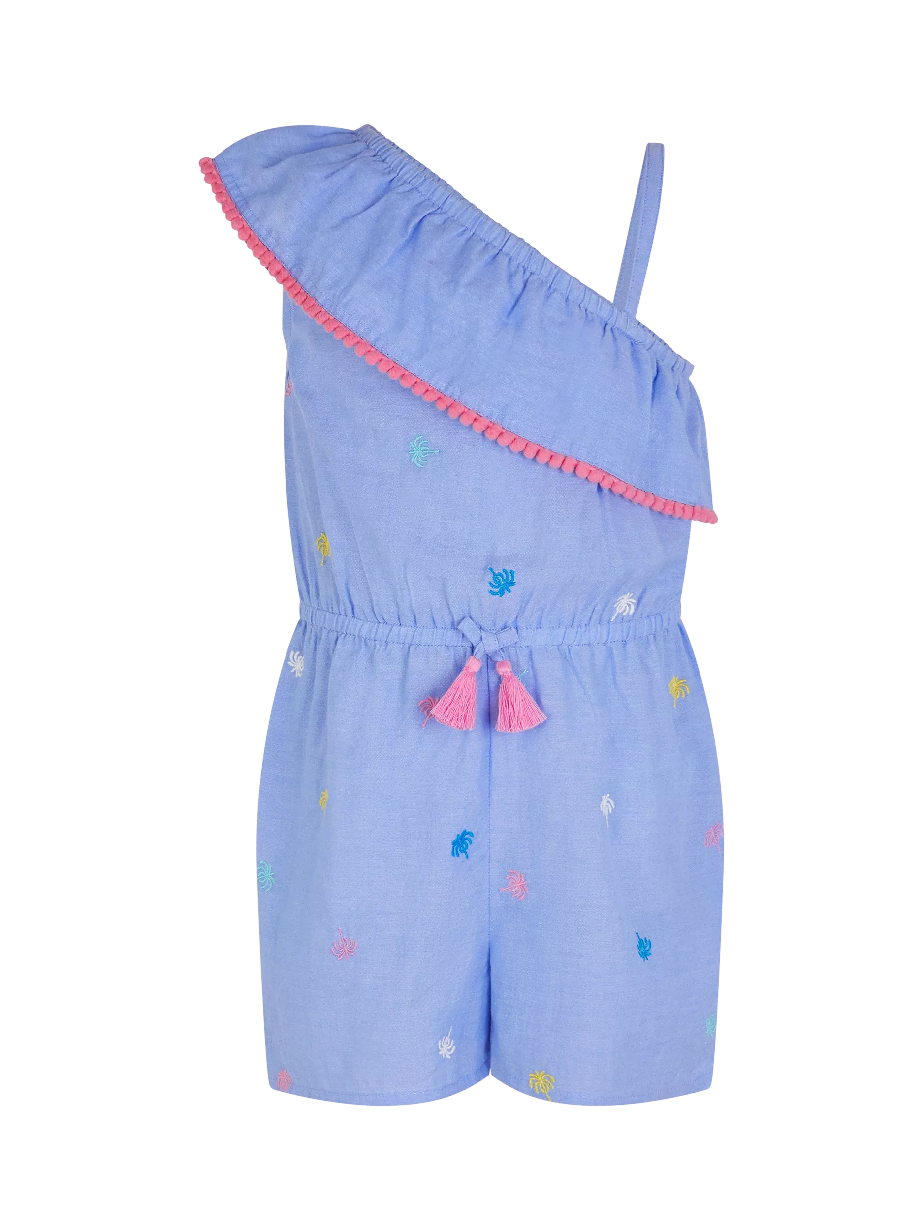 Summer playdate? We've got the perfect outfit for it. Spun in super-soft cotton, this adorable playsuit features a one-shoulder design, drawstring waist, and palm tree embroidery to finish. Complete the look with their favourite strappy sandals.