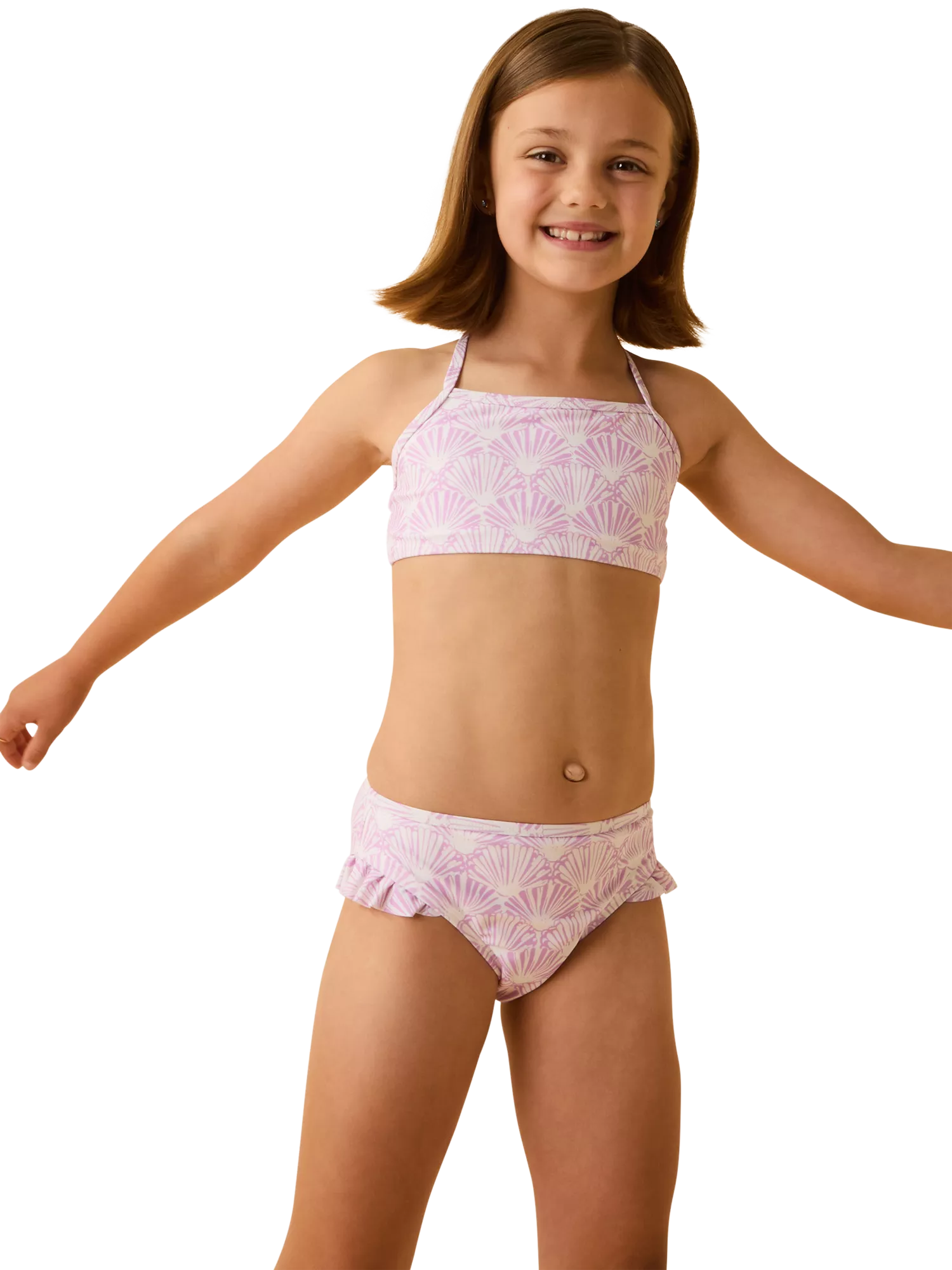 For little ones in their mermaid era, this bikini is for them. Patterned with layers of pink seashells, the set includes a bralette bikini top and frilly bottoms to match. Please note that this product can only be returned with the hygiene seal still in place.