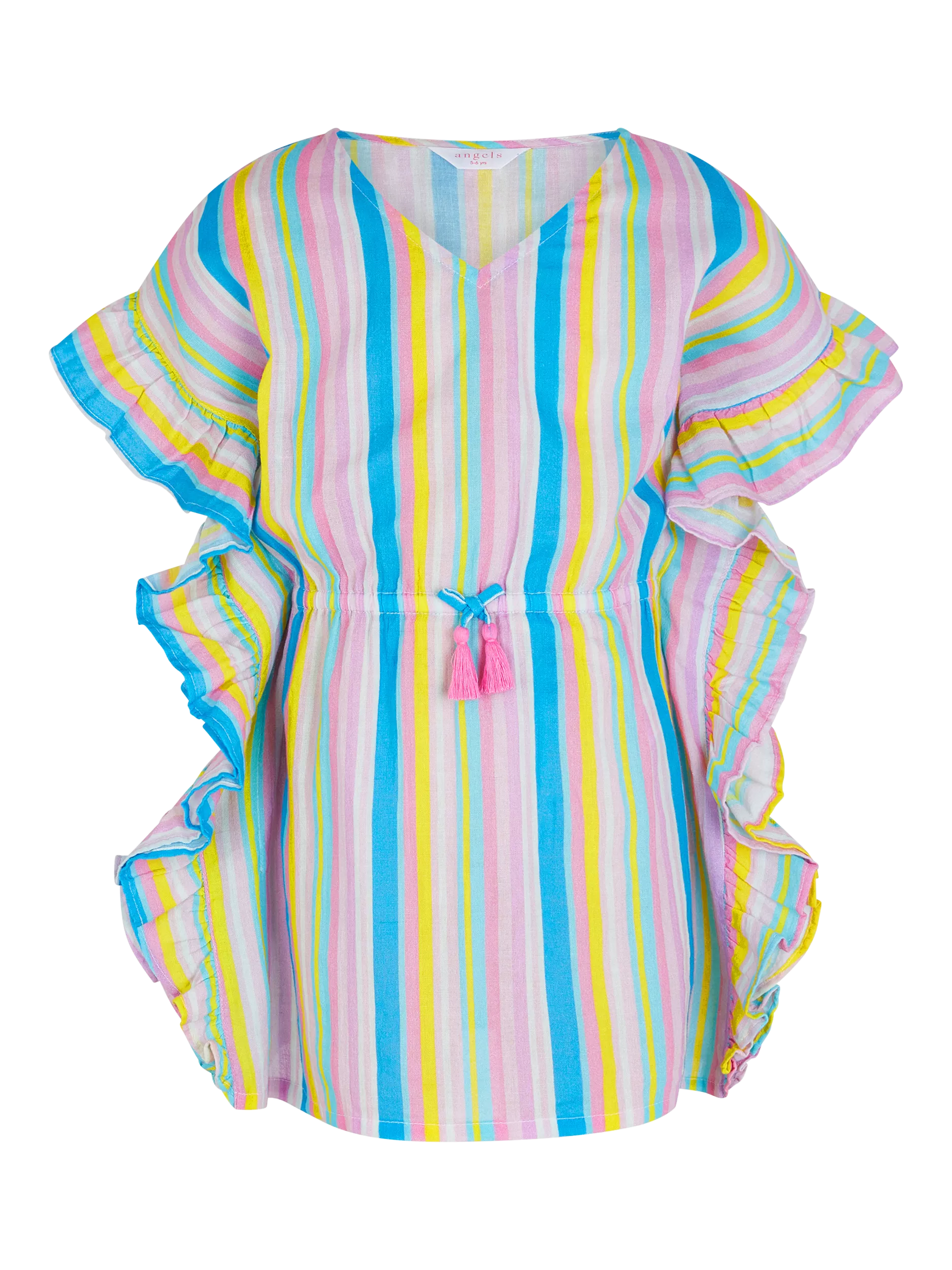 Designed in soft cotton and decorated with colourful stripes, this adorable kaftan is perfect for summer. Slip it over their swimsuit for beach days or some poolside fun. Finished with a frilly trim.