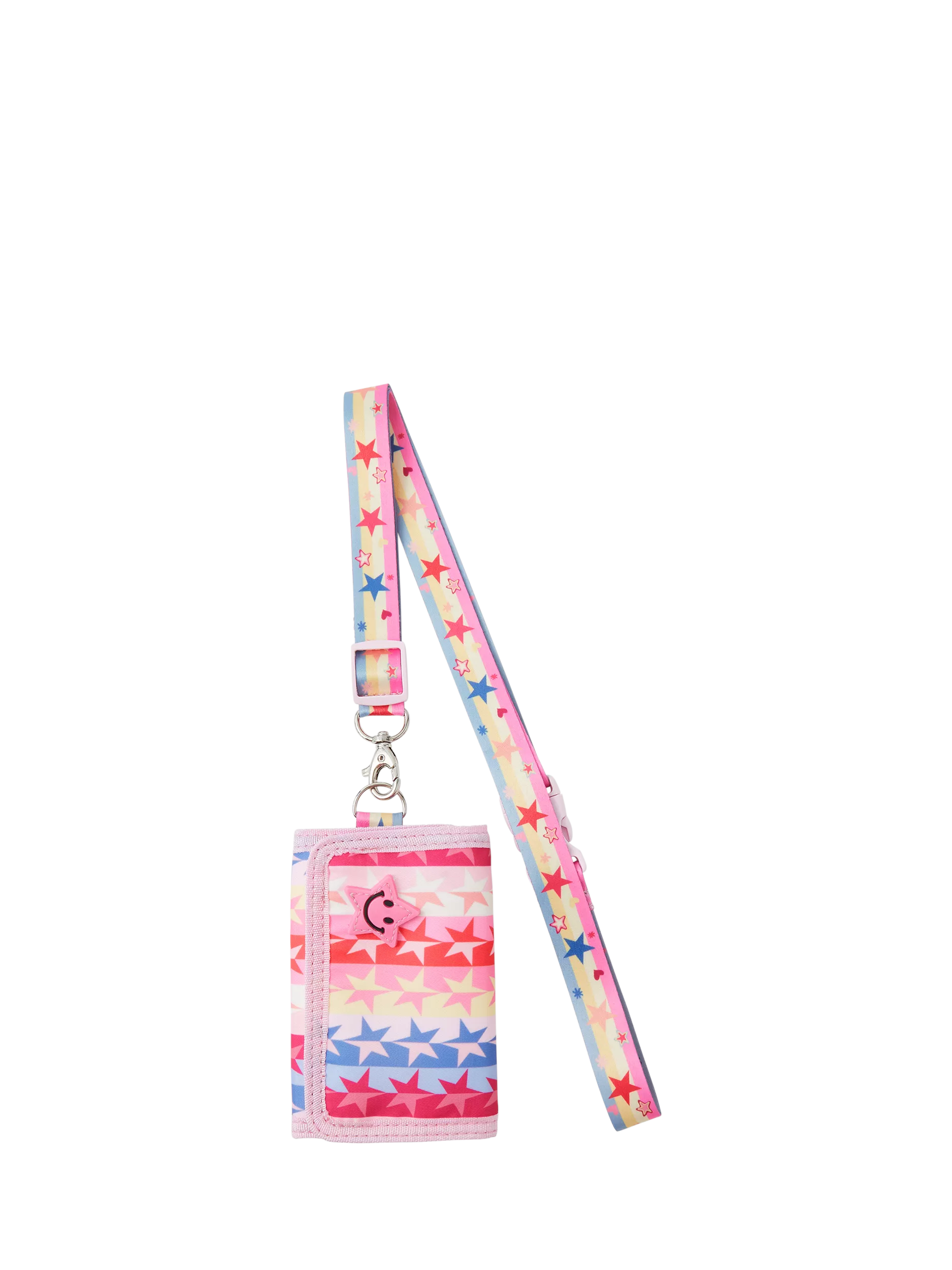 This purse is designed with various card slots and a zip compartment on the inside. Decorated with a colourful star print, it's finished with a lanyard and keychain fastening that clips onto the purse with ease.