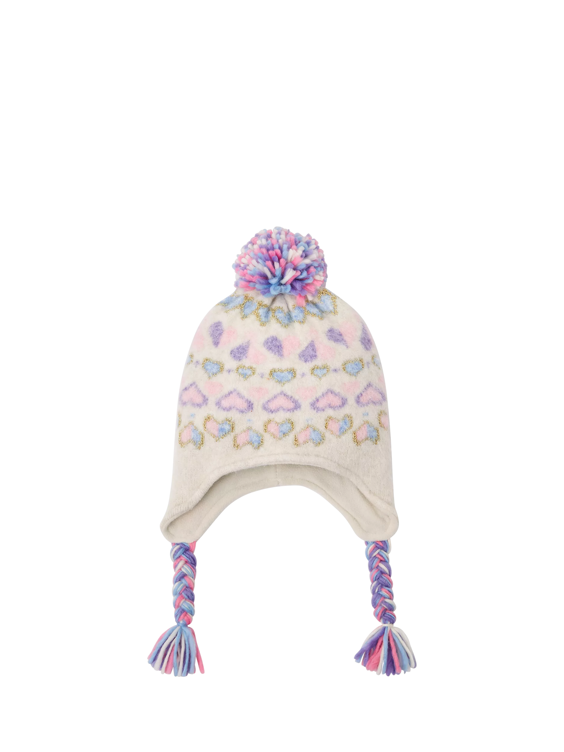 Keeping their head and ears warm all winter long. Designed with a soft fleecy lining, this bobble hat is decorated with a pastel Fair Isle heart pattern and braided cords dangling from the earflaps.