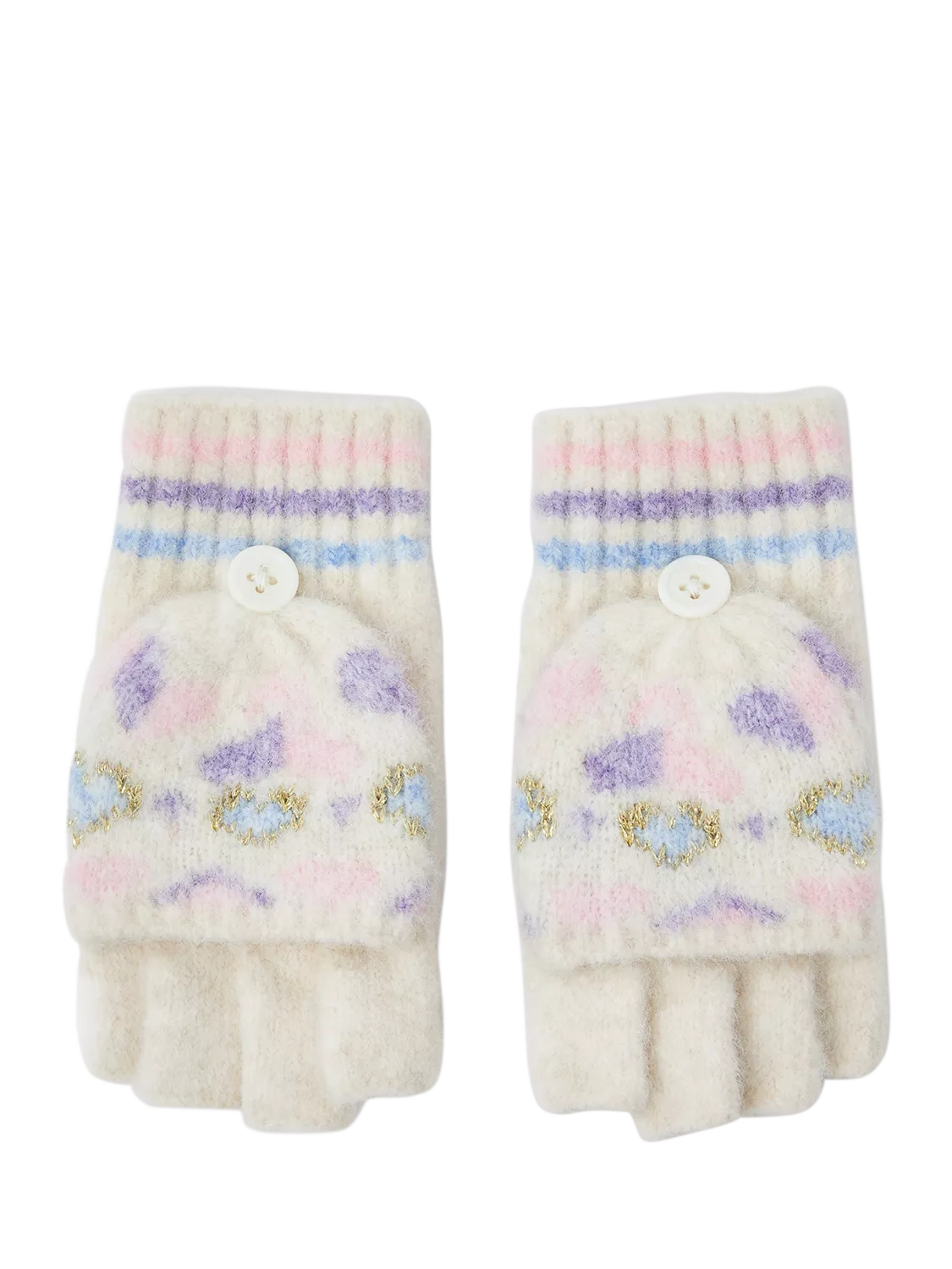Stitched in a super-soft blend, these fingerless gloves are patterned with Fair Isle hearts in pretty pastel colours. Activate cosy mode with the optional mitten covers, that can be folded back down with a button fastening.