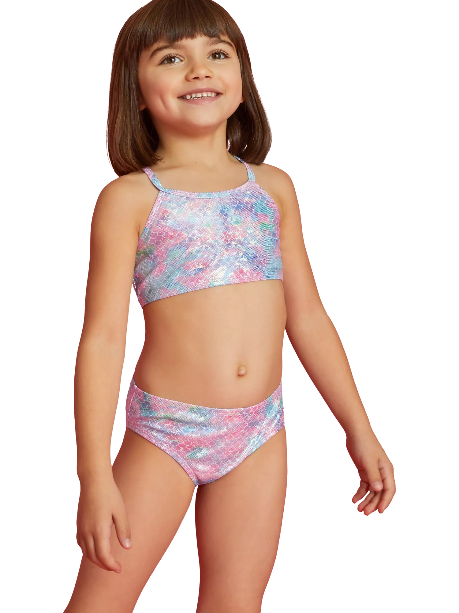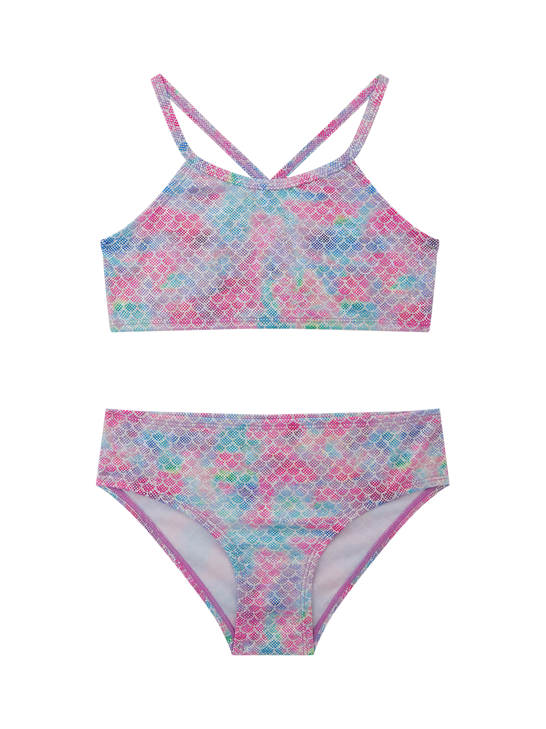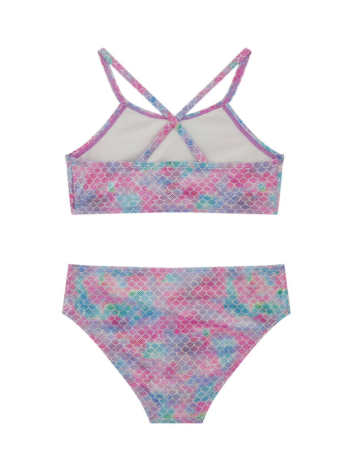 Patterned with mermaid scales in a shimmery finish, this swim set includes a cross-back top and matching bottoms.