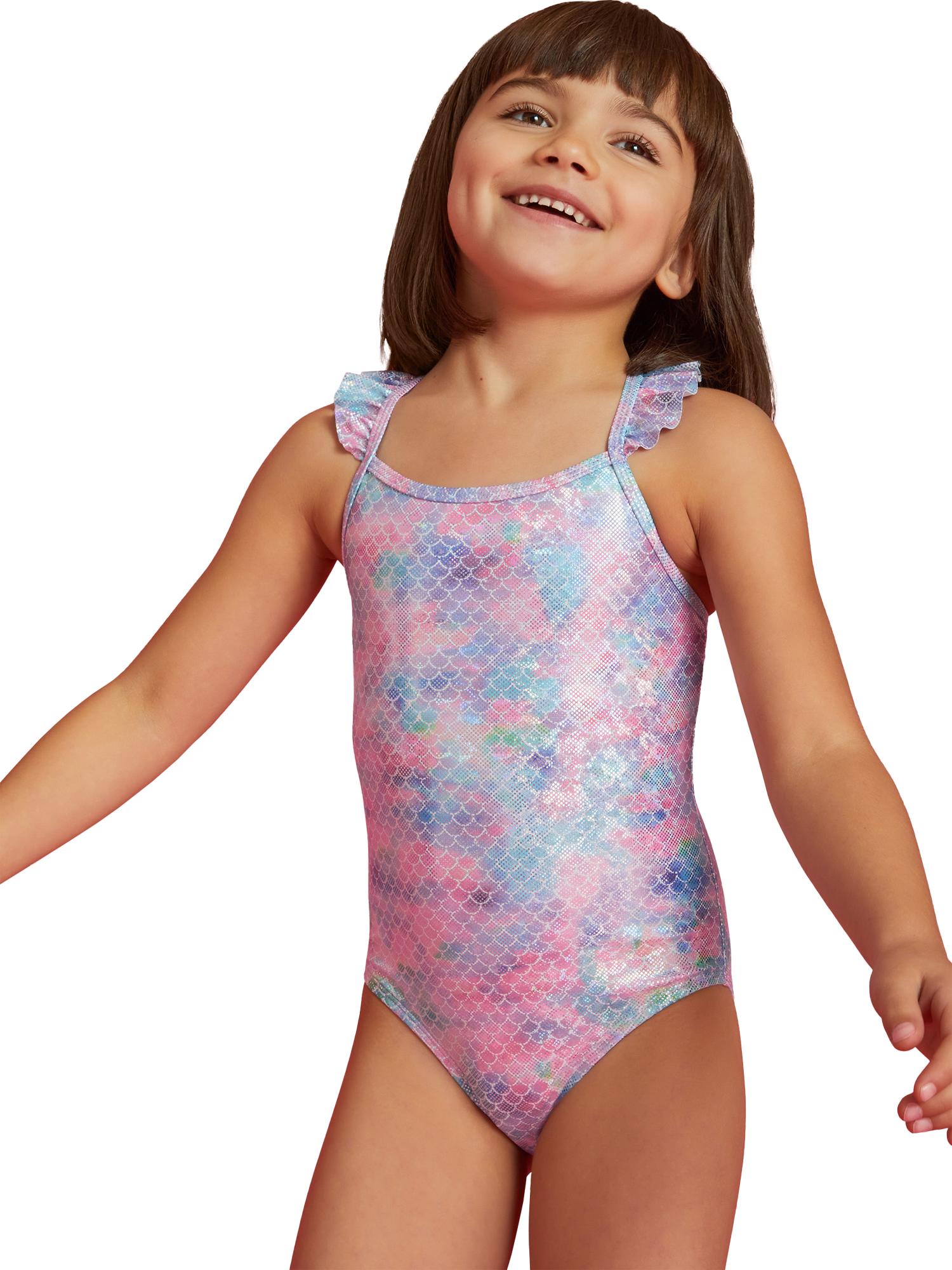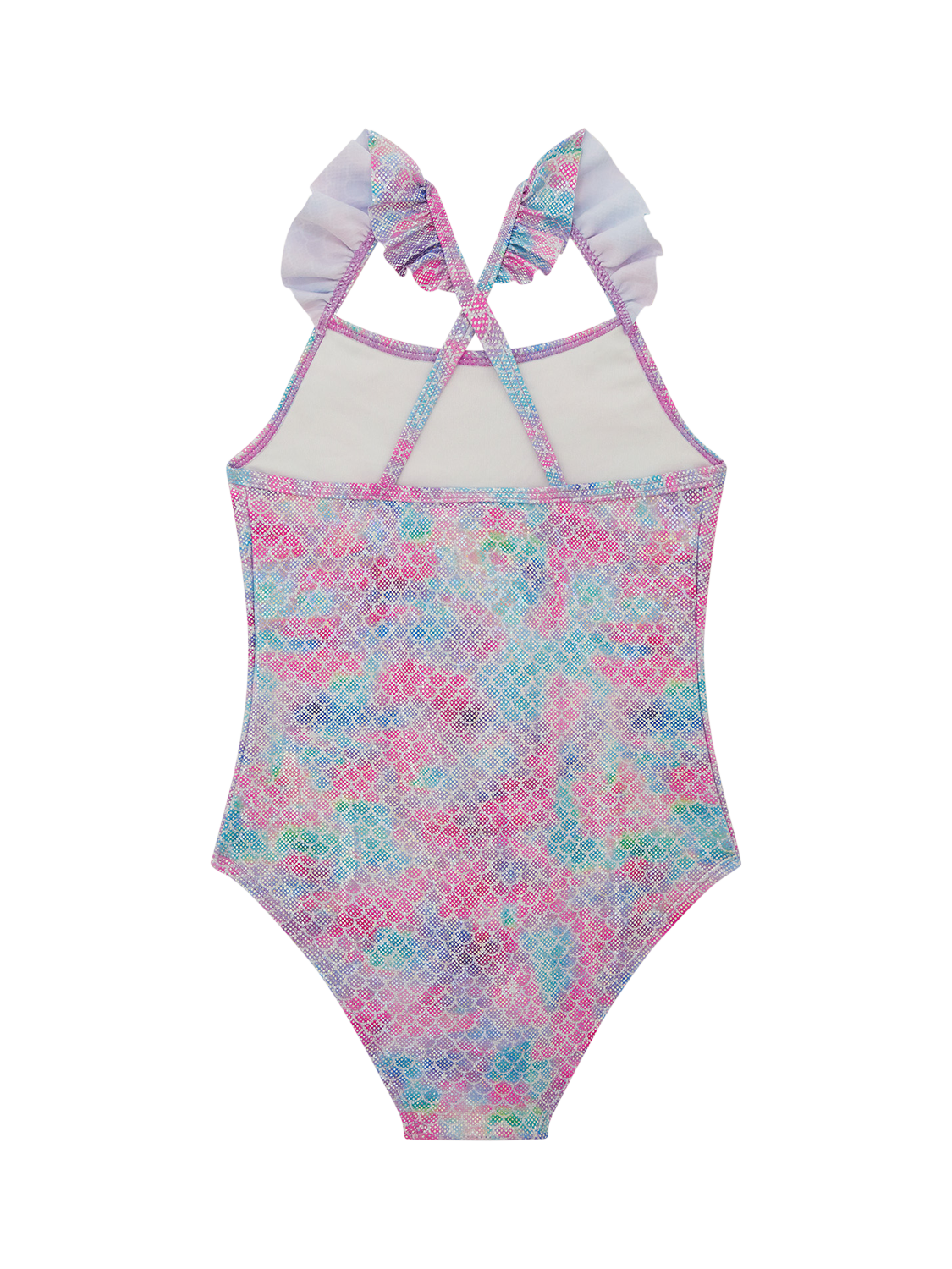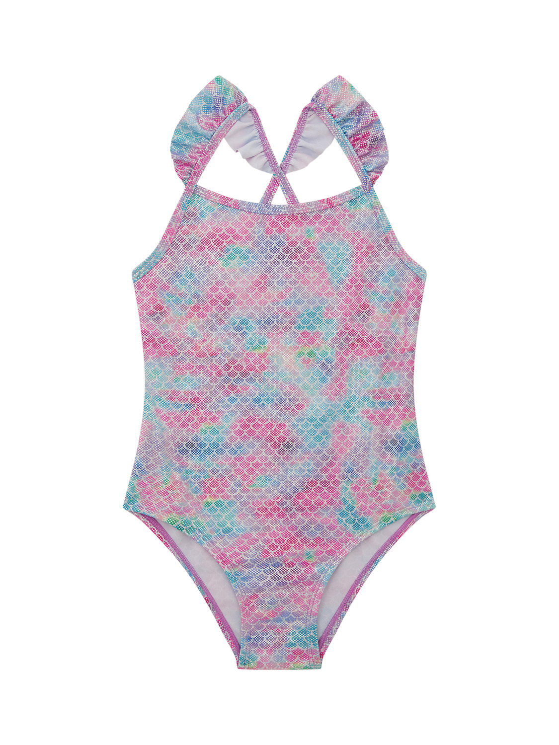 Just add water! Patterned with mermaid scales in a shimmery finish, this swimming costume features frilly straps that cross over at the back. Perfect for showing off at swimming lessons or splashing around in the pool on the next family holiday.