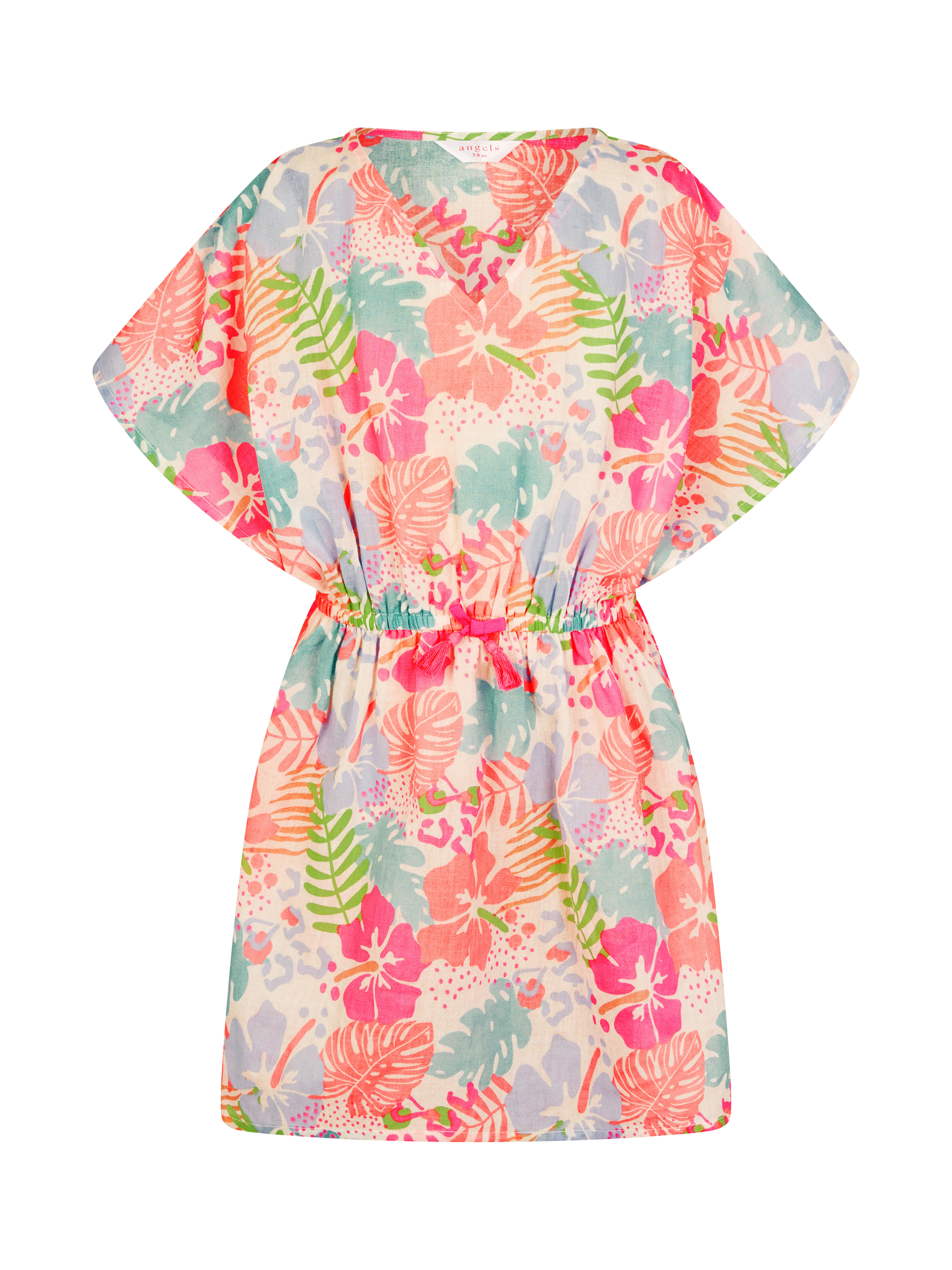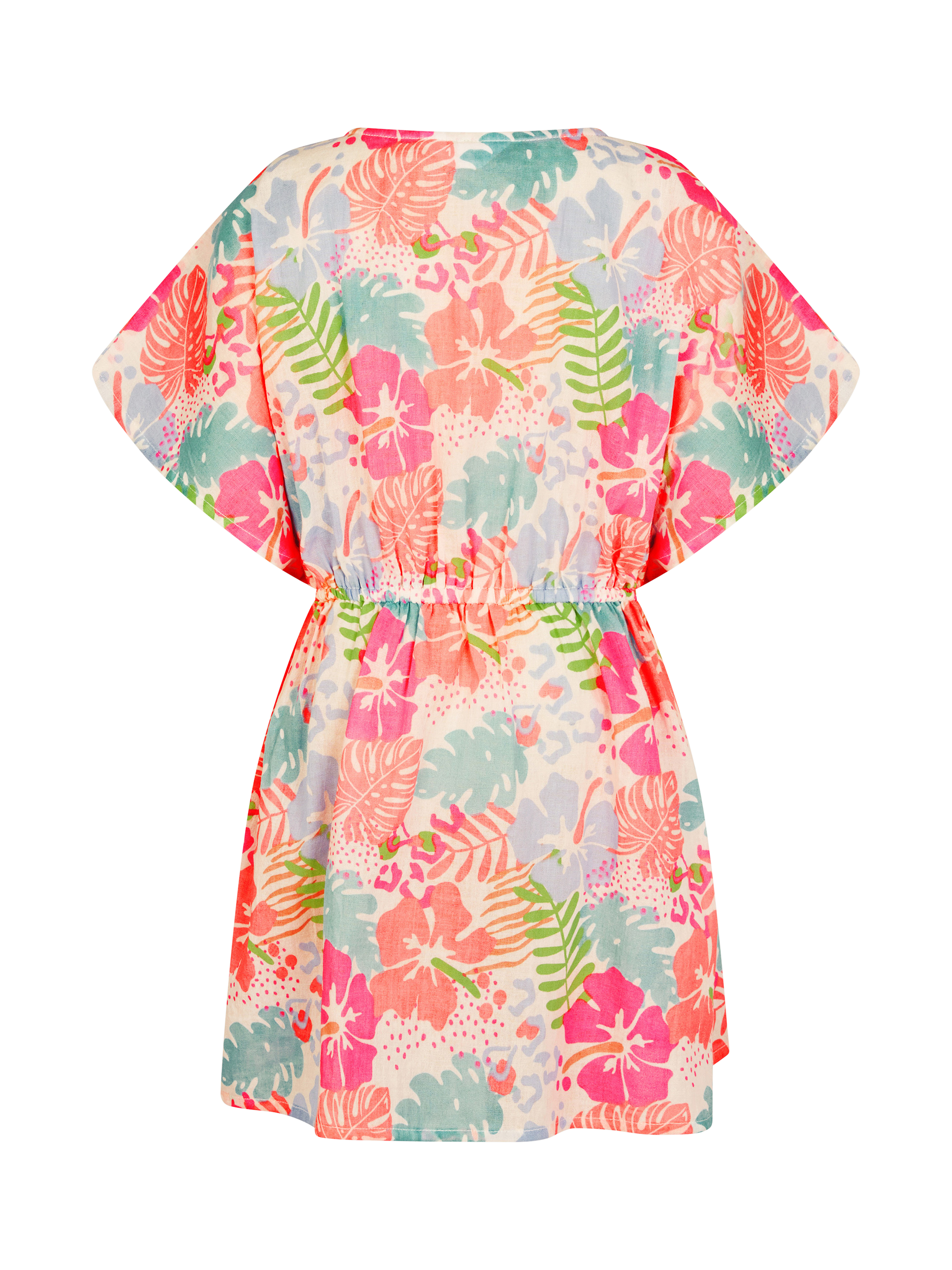 Holiday mode. Designed in soft cotton, this kaftan is decorated with a vibrant tropical print that's made for summer. Slip it over their swimsuit for beach days or some poolside fun.