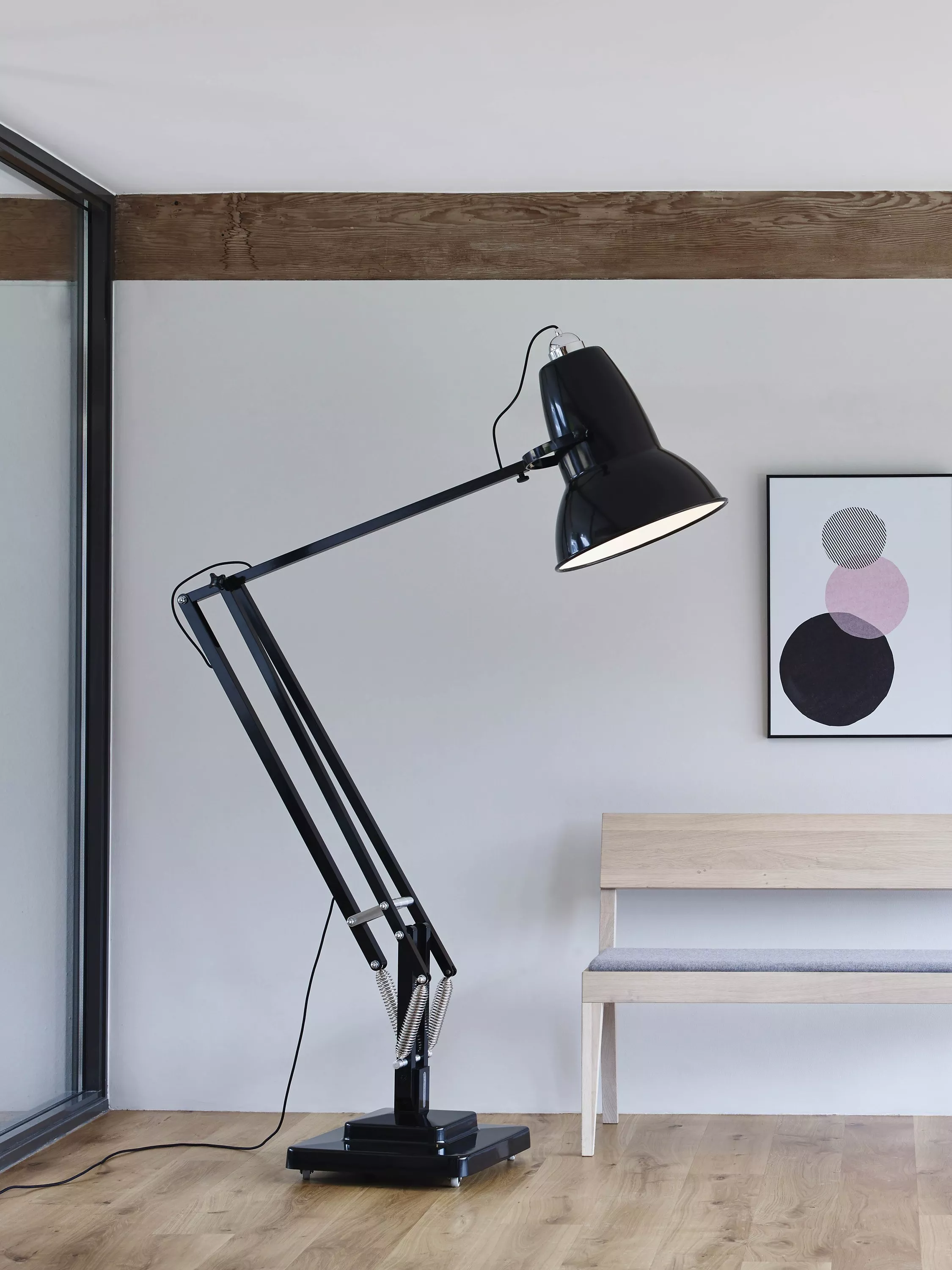 A large version of the stylish Original 1227 floor lamp, blending the classic Anglepoise® shade silhouette and constant tension spring articulation with bright chrome arms and an attractive, braided coloured cable.