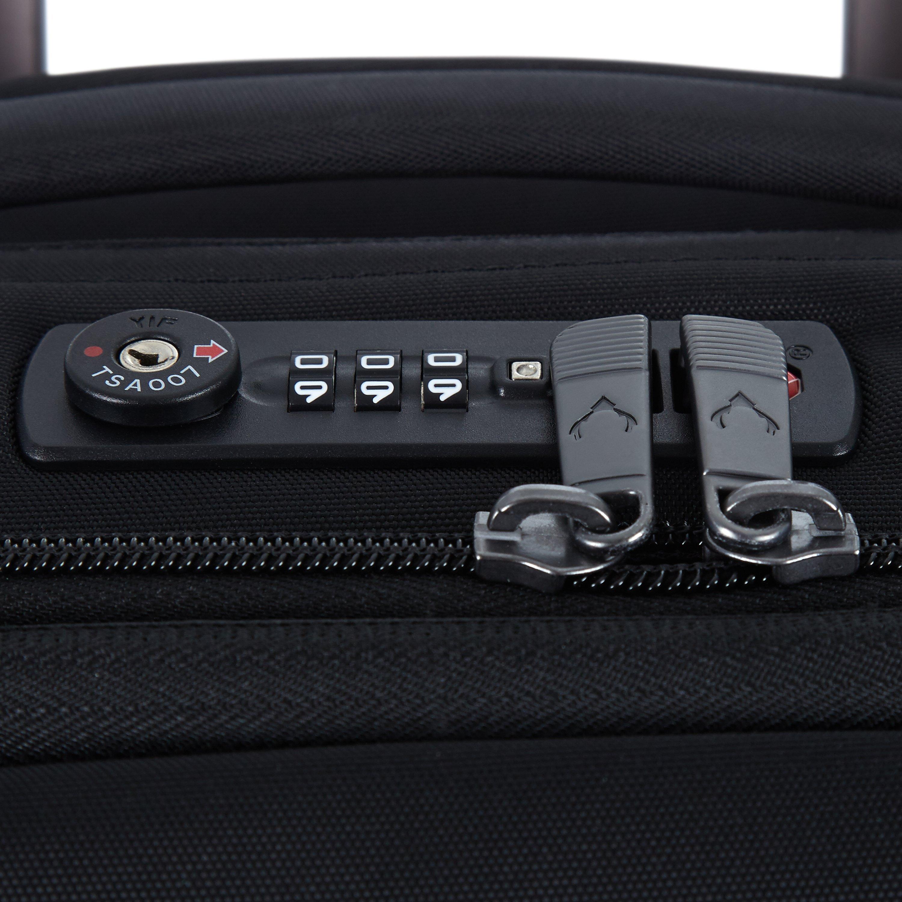 The case features a recessed TSA Lock on top of front panel for ease of access, patented corner protectors, unique recessed handle area for comfort, large front pocket and a ultra light highly technical frame structure with rip resistant fabric.