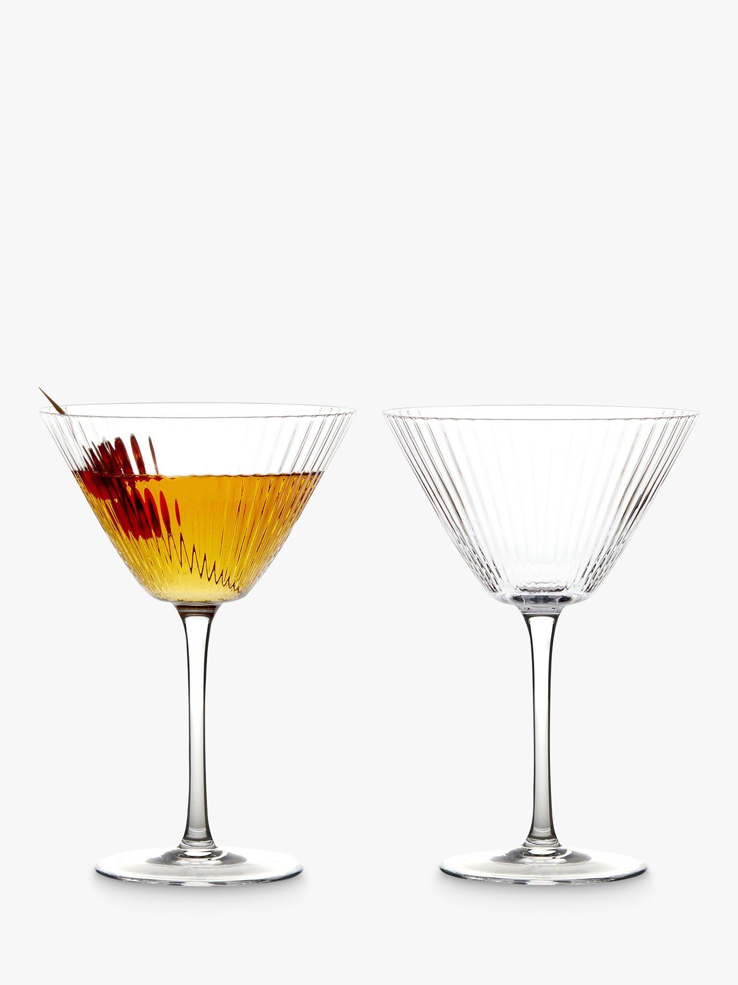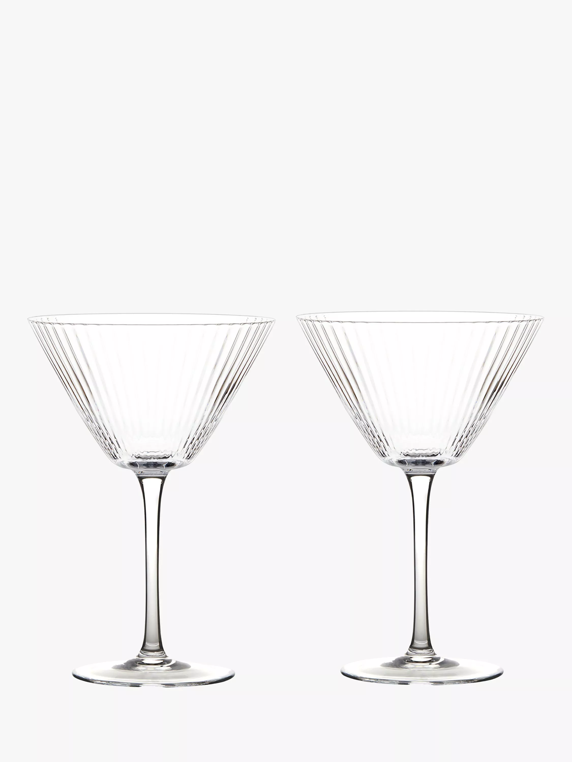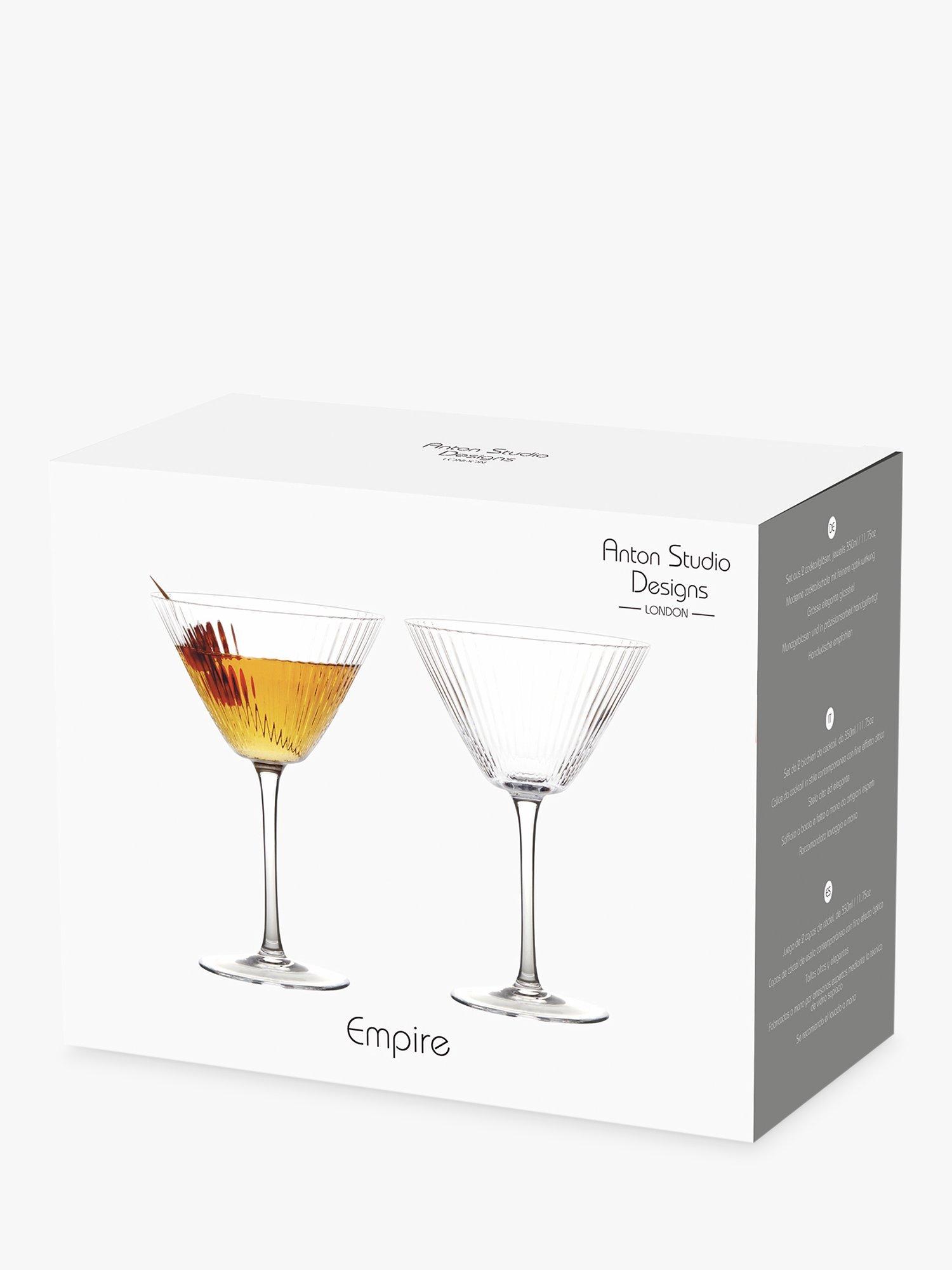 Pair of cocktail glasses with contemporary-shaped bowls and tall, elegant stems. From the Empire range by Anton Studio Designs, they're made of mouthblown glass, handmade by skilled craftsmen in a fine optic design.