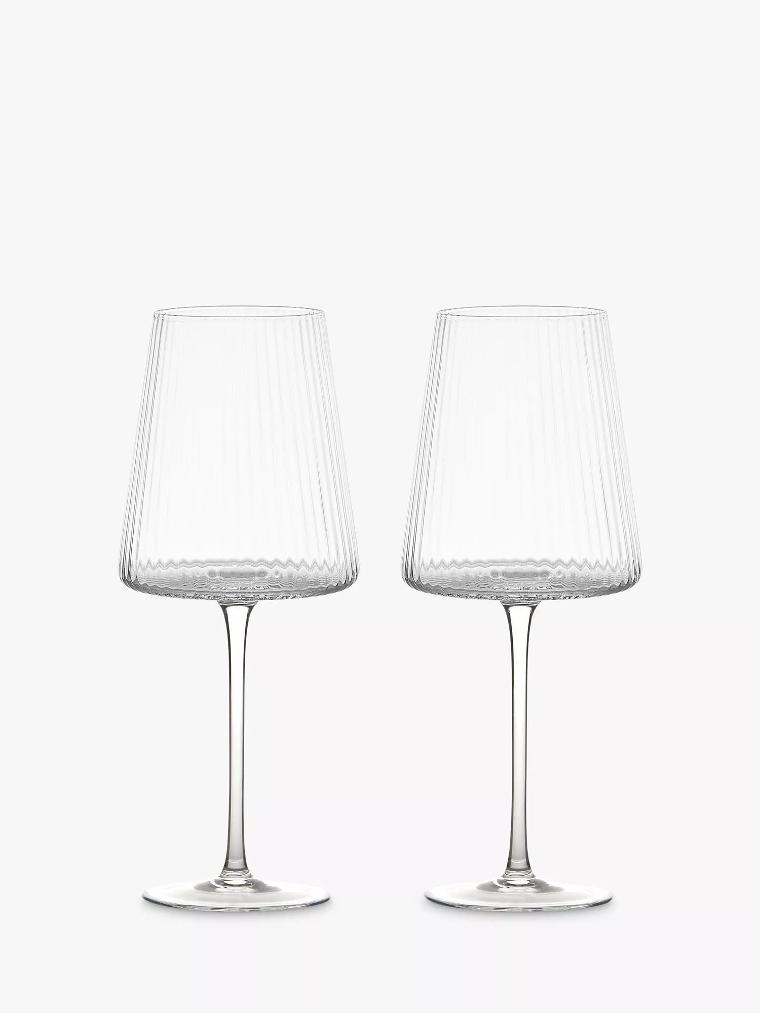 Pair of Empire wine glasses from Anton Studio Designs with contemporary-shaped bowls, rounded corners and fine optic ribbed texture. Mouth-blown and handmade by skilled craftsmen, they have tall, elegant stems.