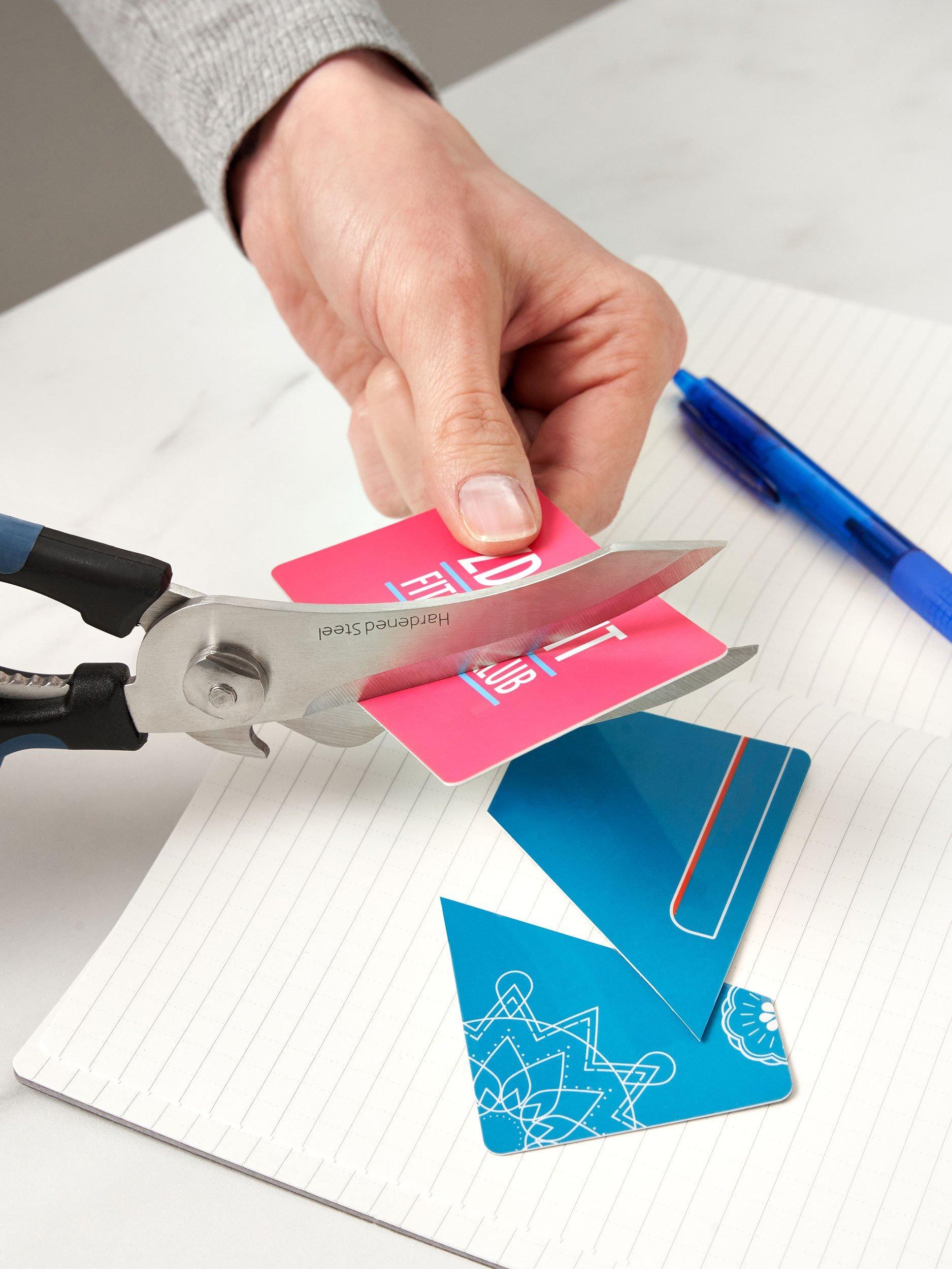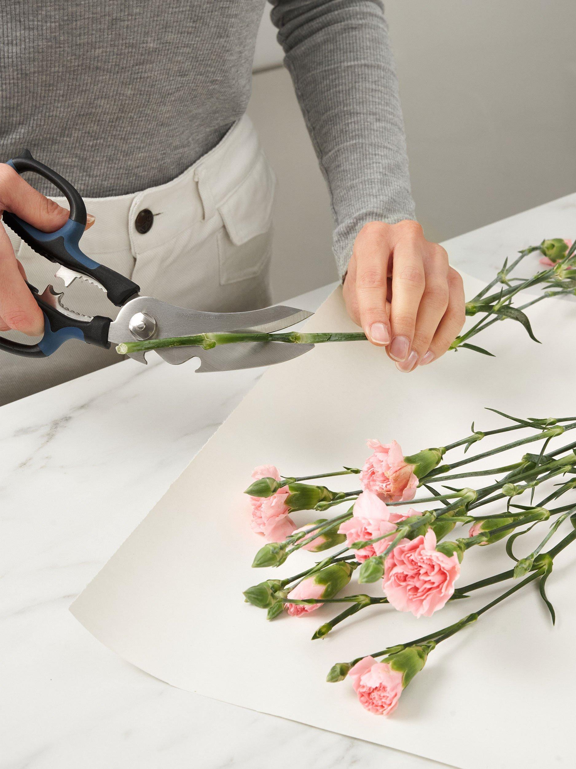 Thicker, hardened steel blades stay sharper and don't warp, so they work better for longer. Use the adjustable tension to tighten or loosen the scissors for ease or control. Easy to clean by hand or in the dishwasher.