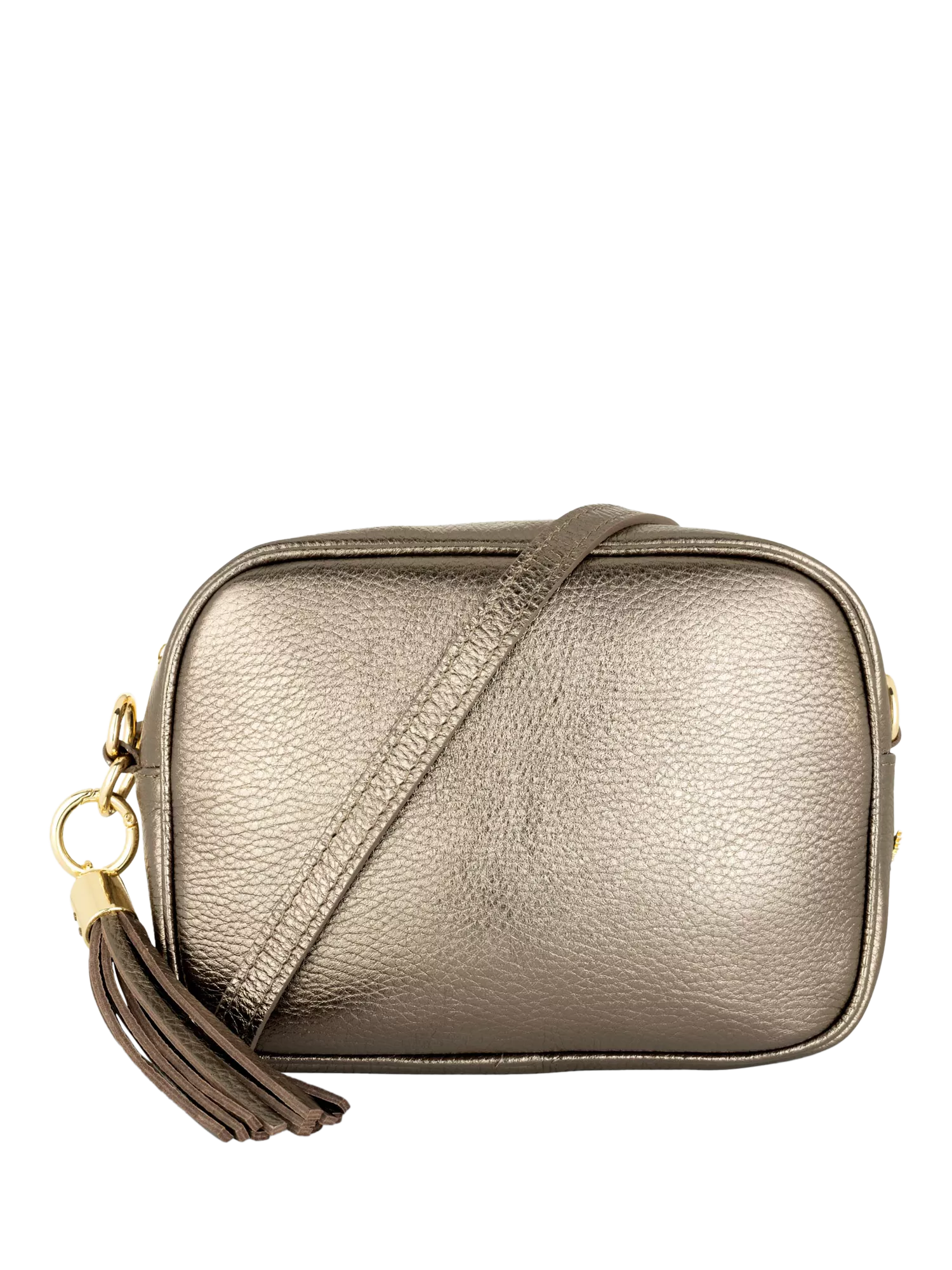 - Leather with light gold metal hardware