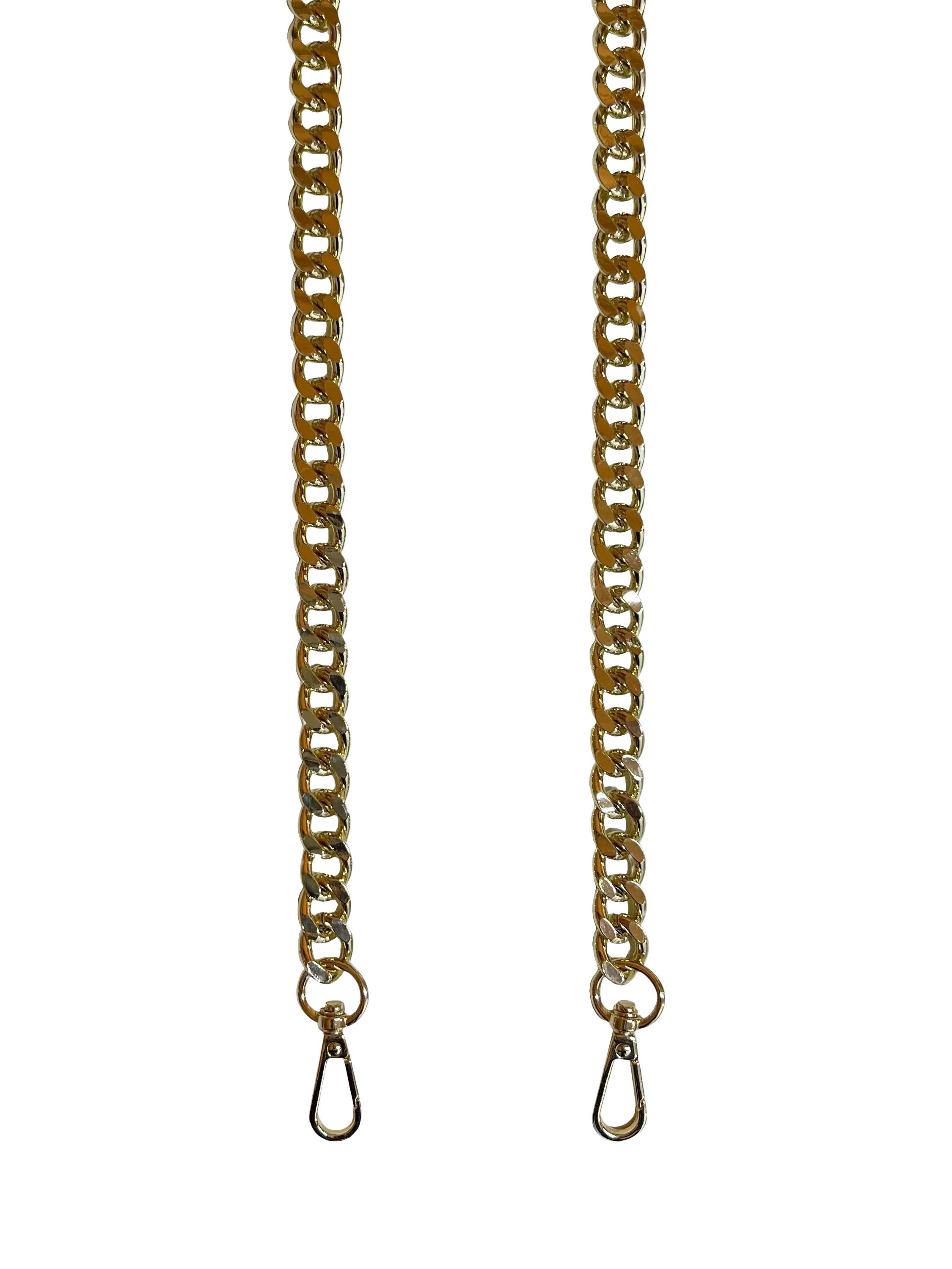 Long gold chain crossbody strap to complement Apatchy London leather bags.