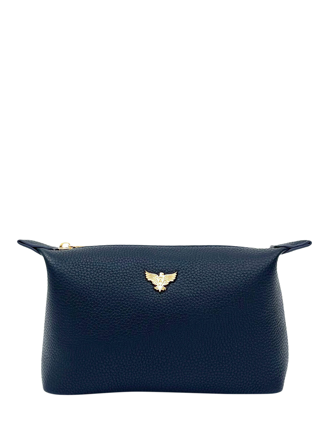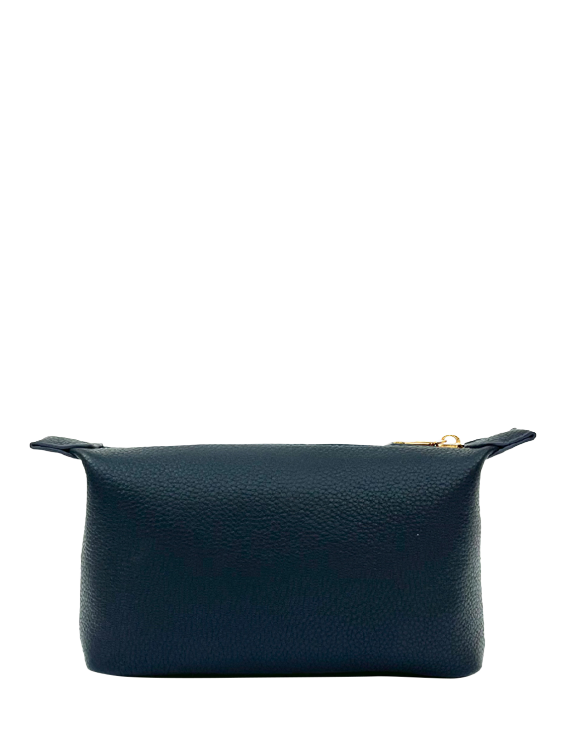 Made from grain pebble leather in Navy with gold hardware, it's ideal for your beauty essentials, but is still small enough to slip into a handbag. Unzips to reveal a fully lined interior. This luxurious makeup bag is delivered in a branded dust bag.