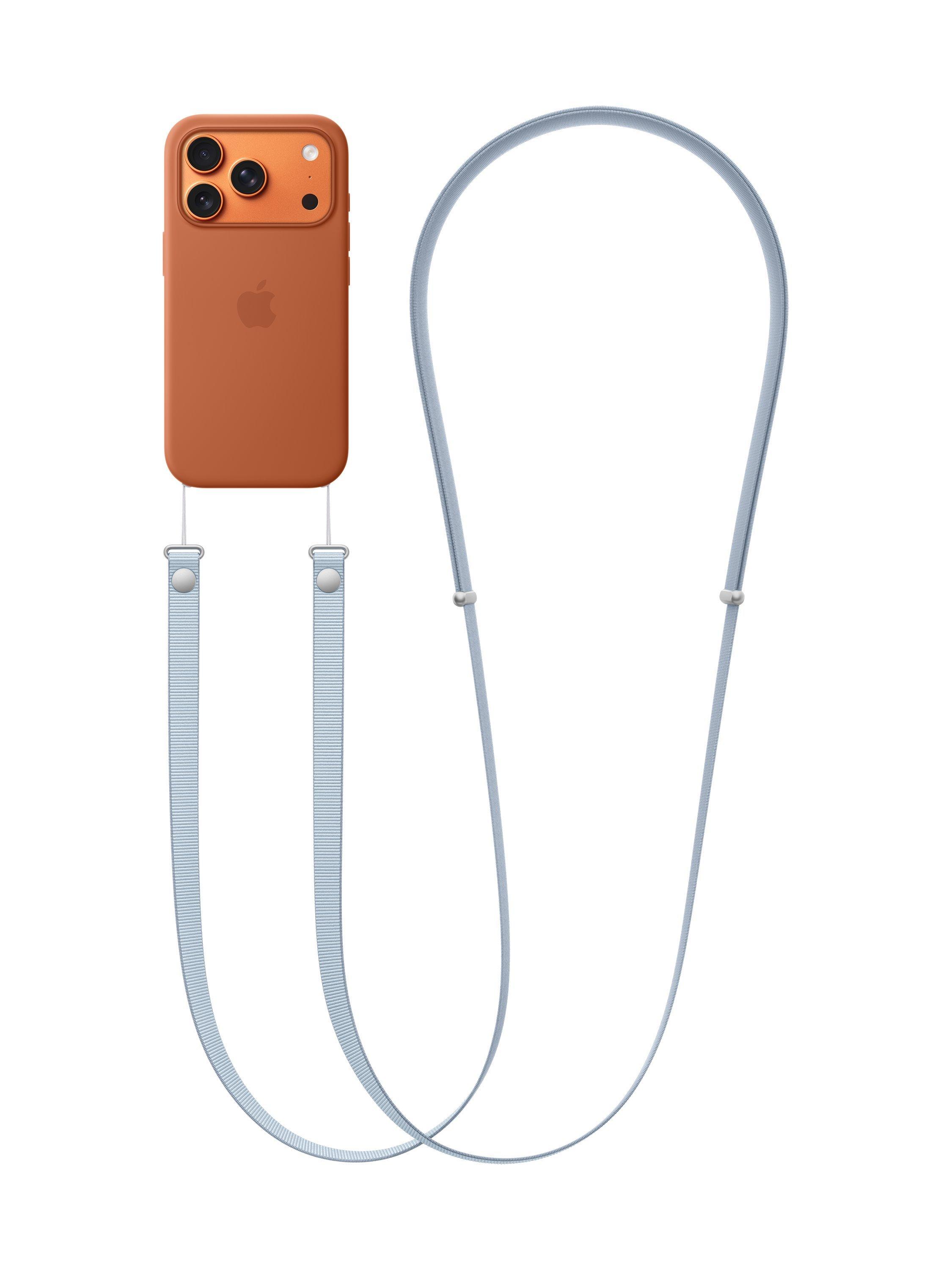 The Crossbody Strap is designed to attach to selected Apple cases for a convenient and hands‑free way to wear iPhone.