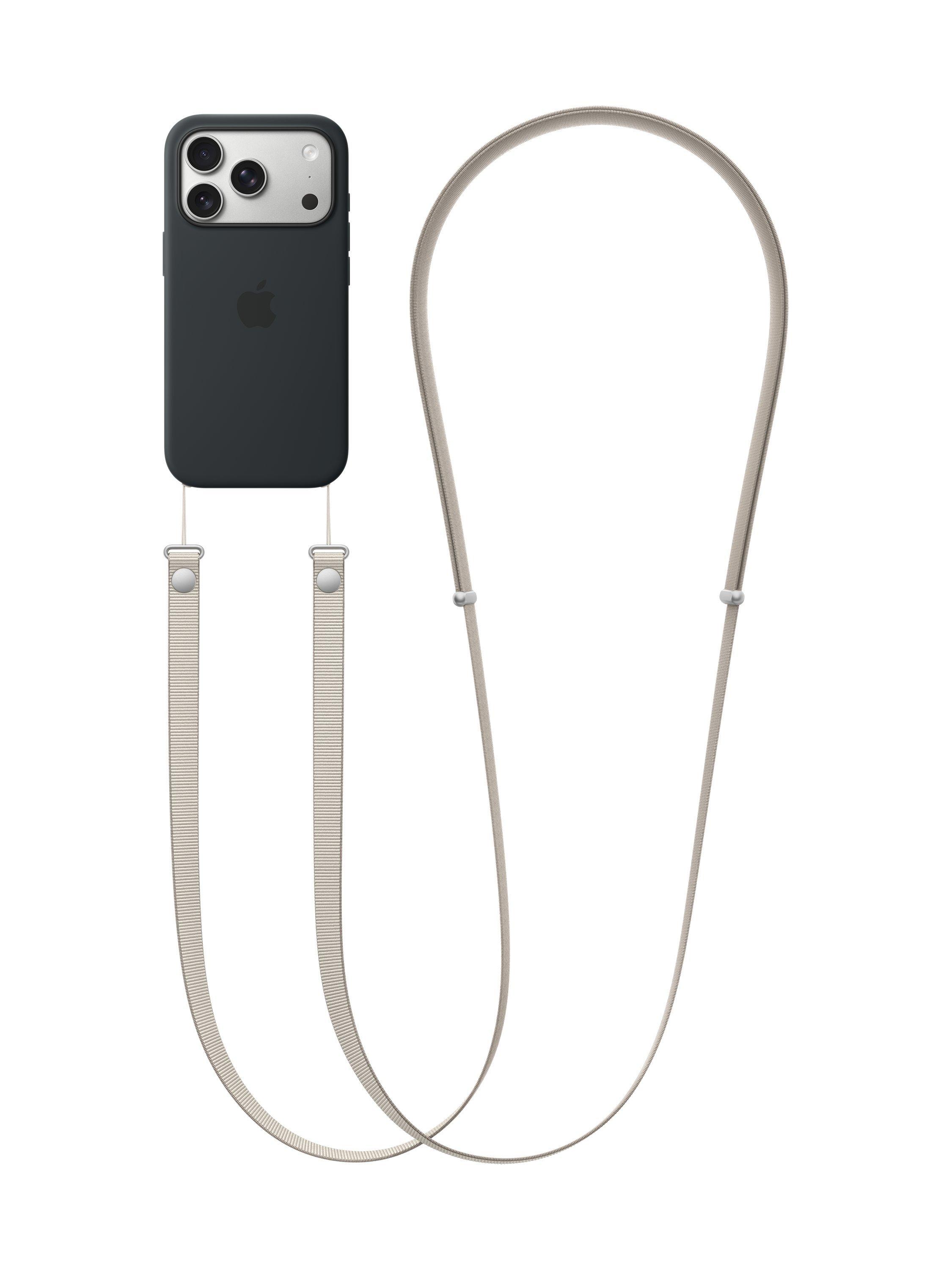 The Crossbody Strap is designed to attach to selected Apple cases for a convenient and hands‑free way to wear iPhone.