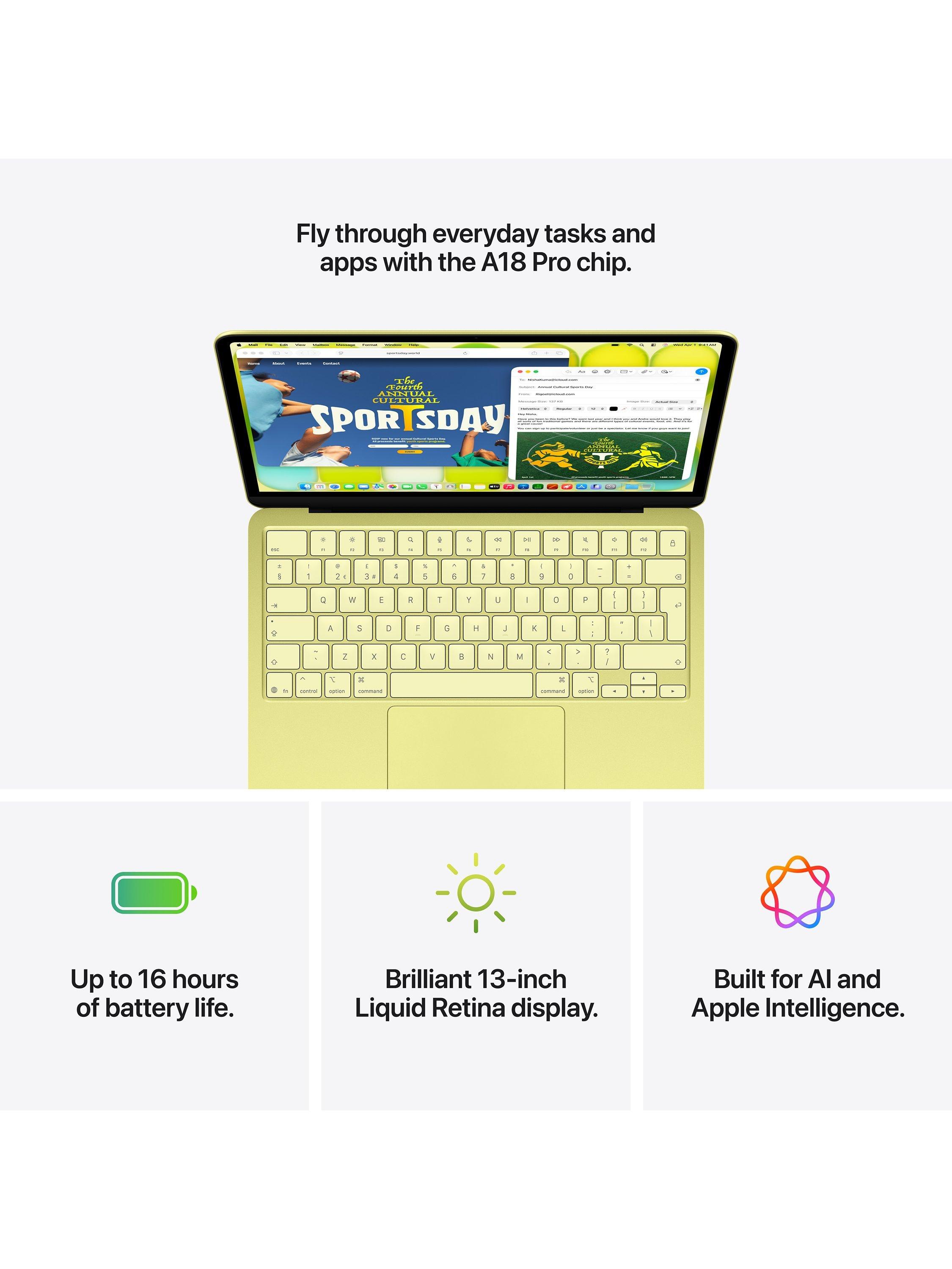 Ready for whatever your day brings, MacBook Neo flies through everyday tasks and apps. Choose from four stunning colours in a durable aluminium design. With a brilliant 13-inch Liquid Retina display,(1) the A18 Pro chip built for AI and Apple Intelligence,(2) and up to 16 hours of battery life,(3) it’s an amazing Mac at a surprising price.