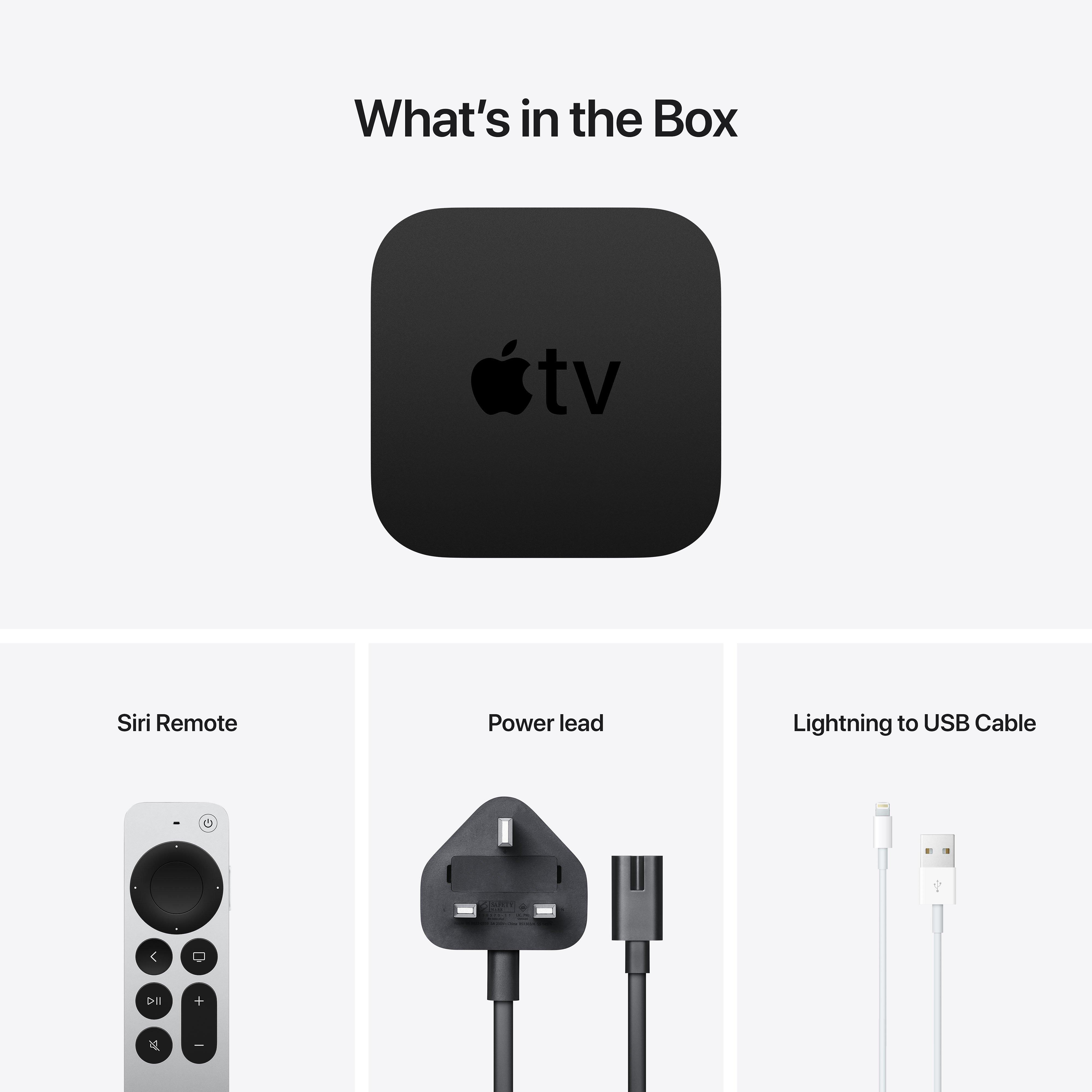 - Siri Remote, Power lead, Lightning to USB cable, Documentation - HDMI cable sold separately